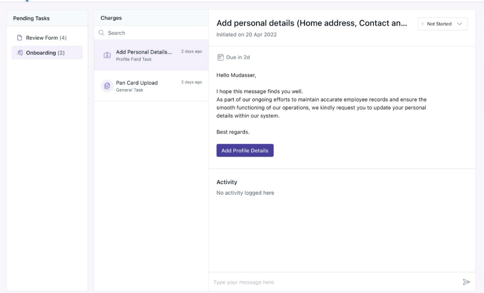 These tasks prompt individuals to fill in required fields such as personal details, address, emergency contacts, or bank details directly in Keka—before their joining date.