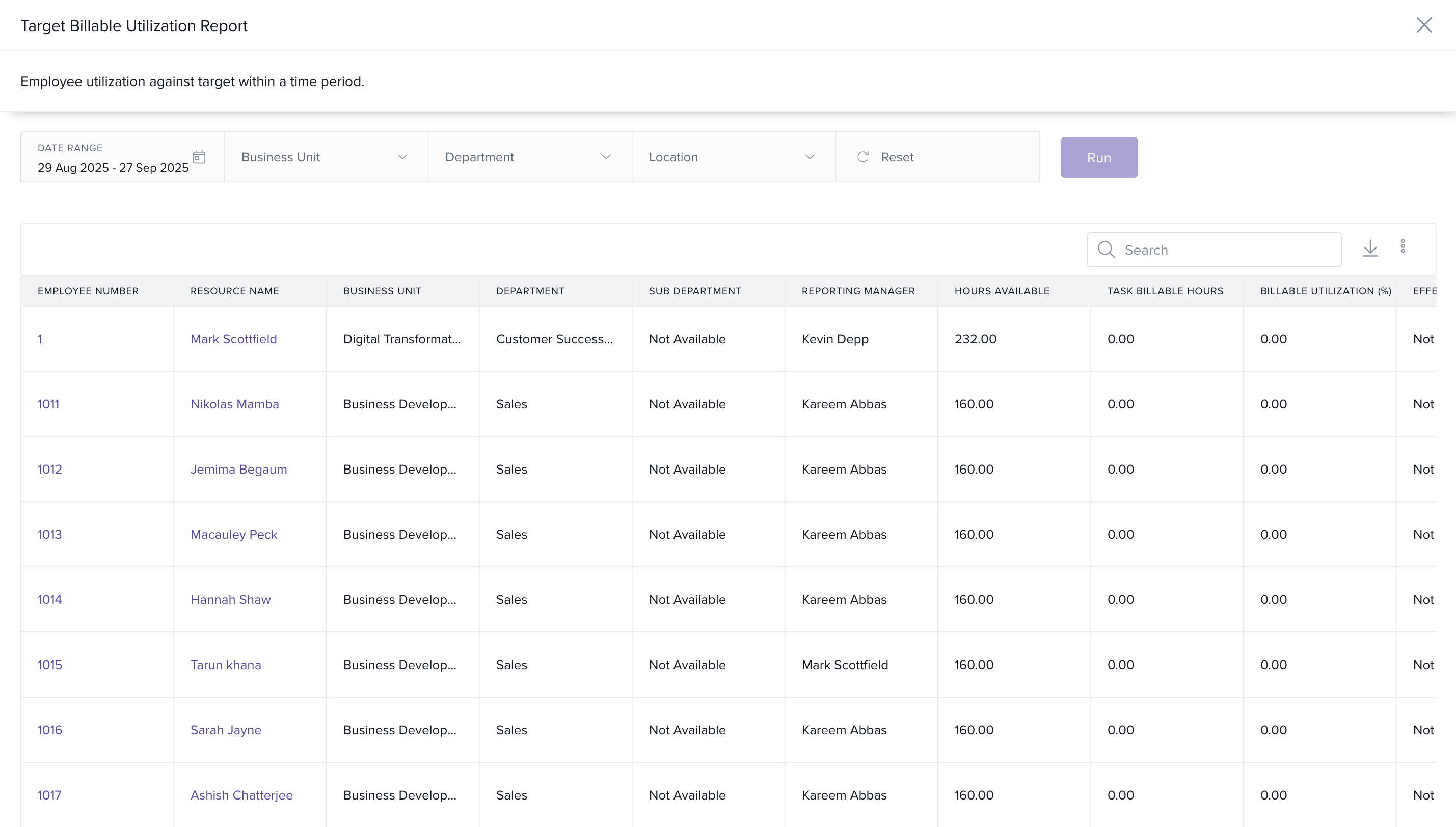 - Target billable utilization should be set by an admin for the report to reflect data.