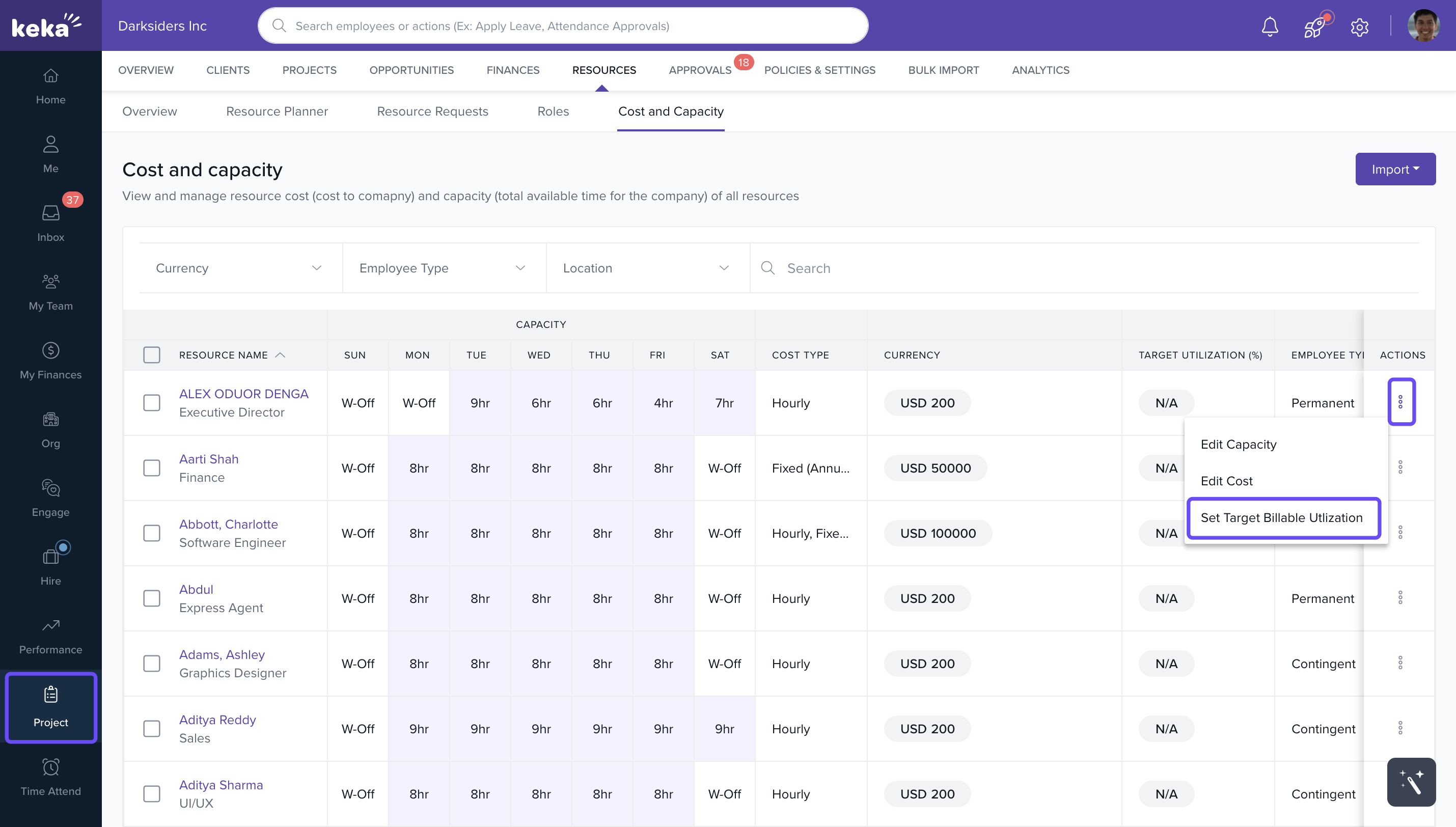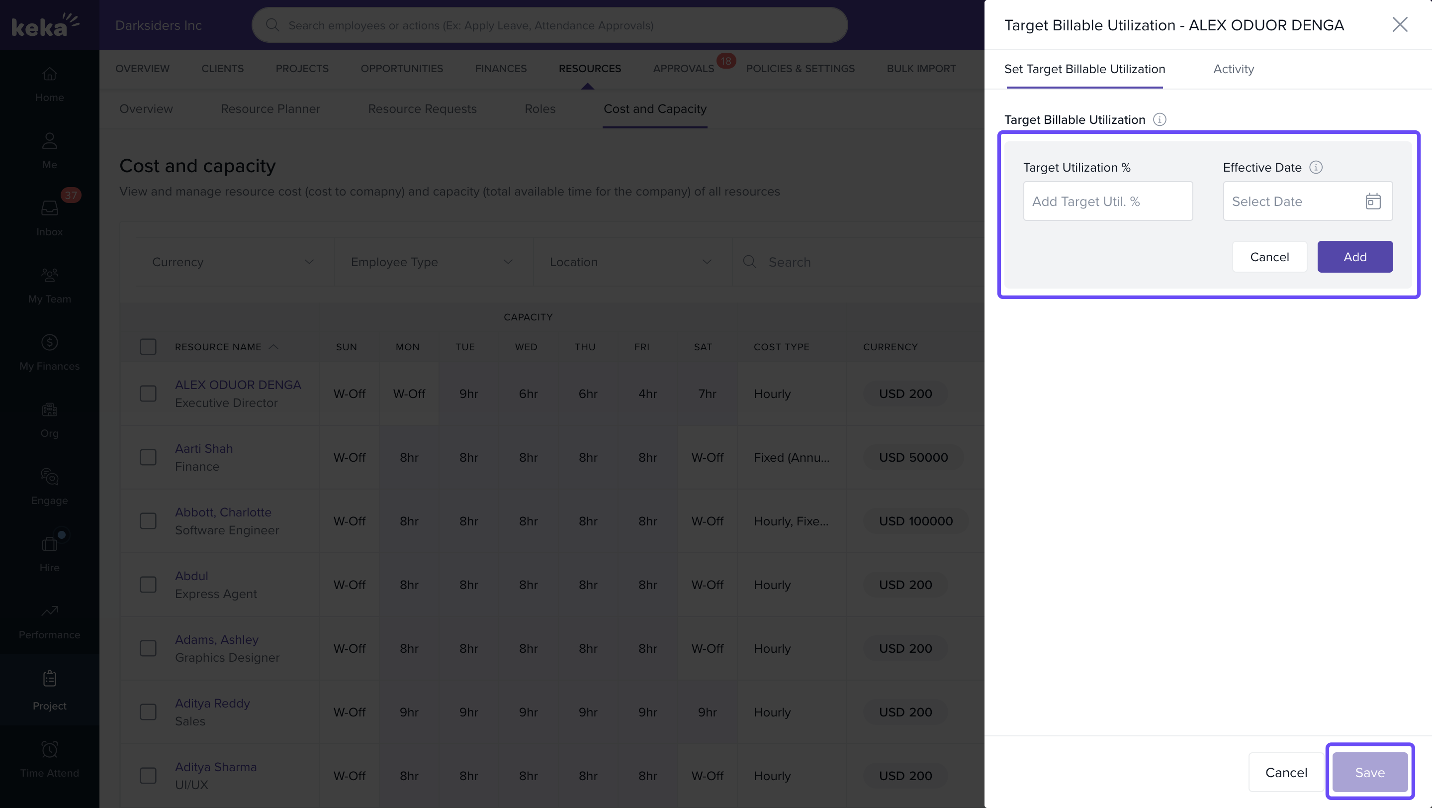 Note: Resources can only see actual utilization; targets set by admins are not visible to them.