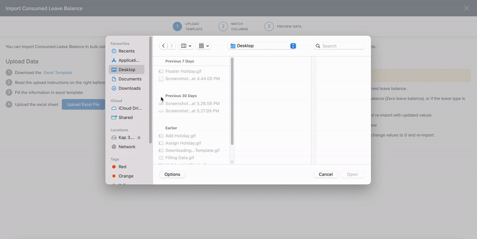 Upload your completed Excel sheet to Keka.