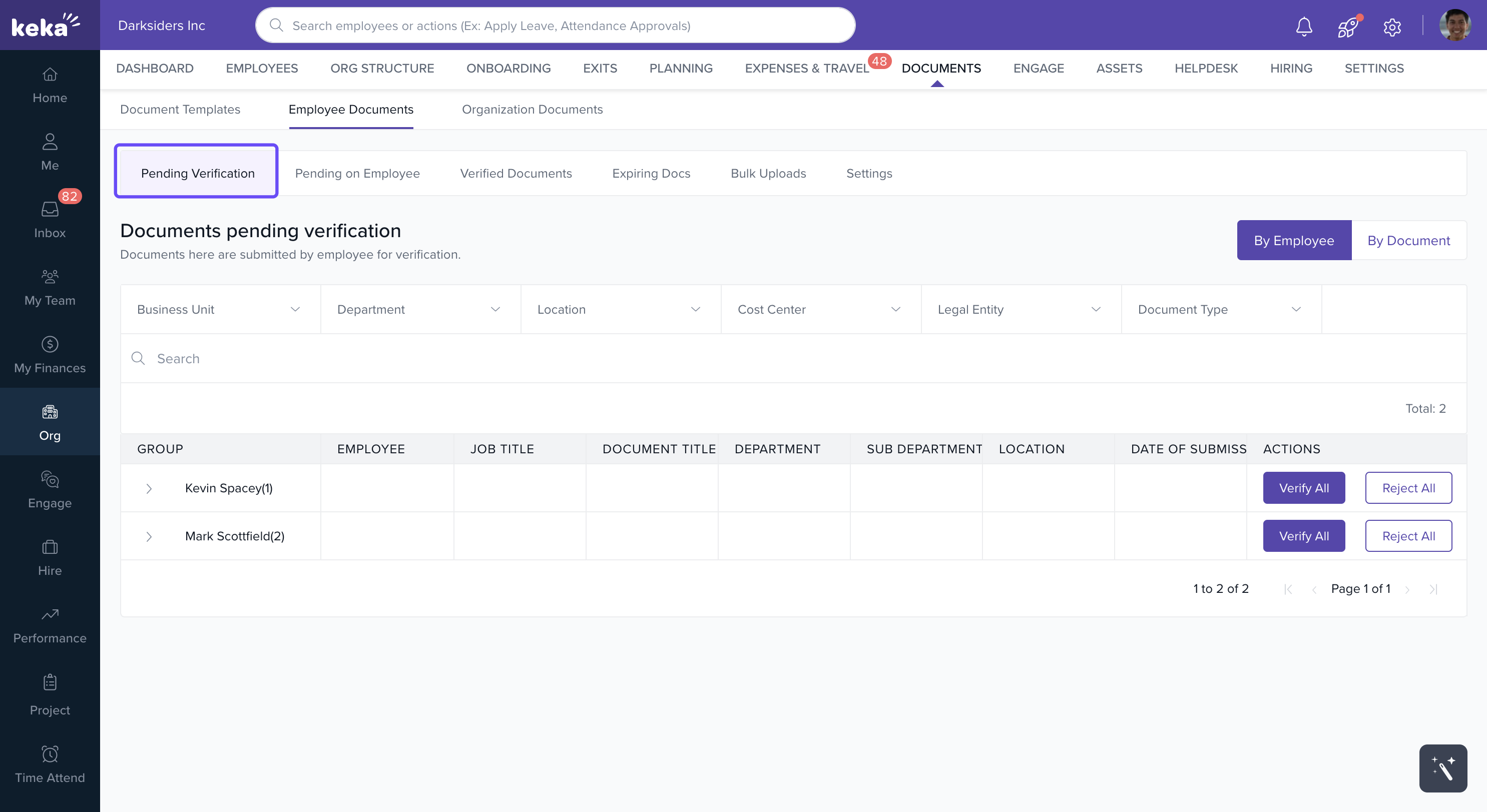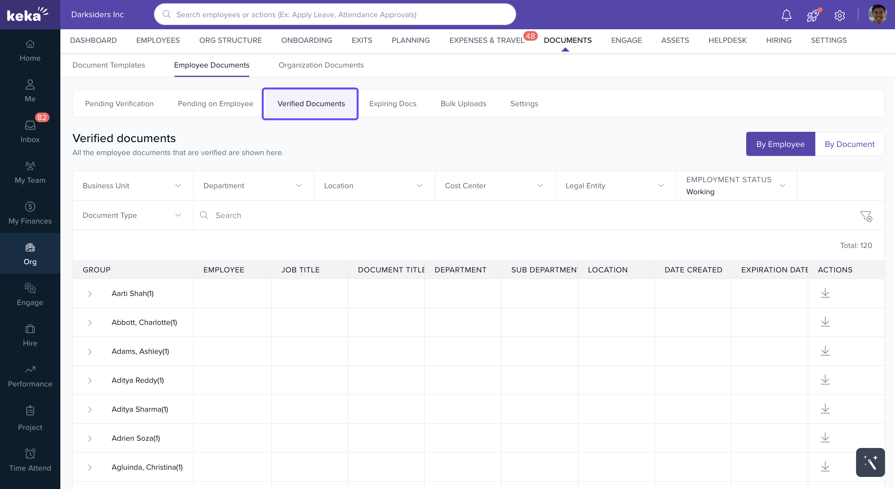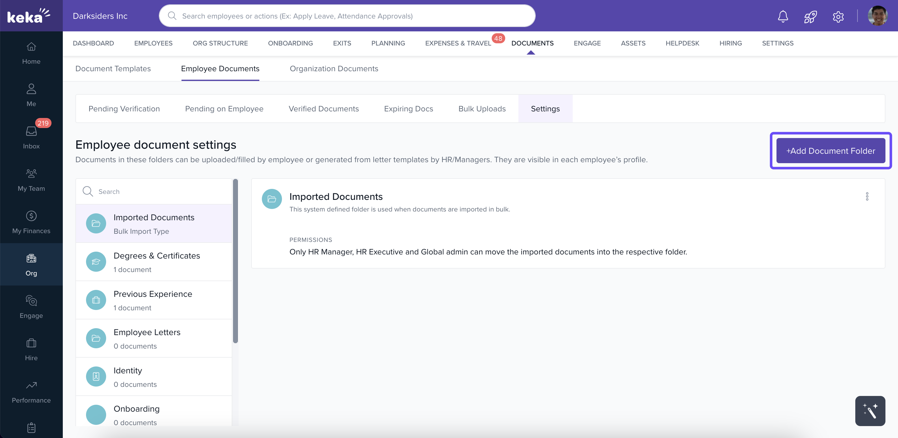 The Employee Documents tab in Keka is the central place for managing all employee document-related tasks. It categorizes documents based on their verification status, alerts you about upcoming expirations, and even allows you to create custom folders for better organization.