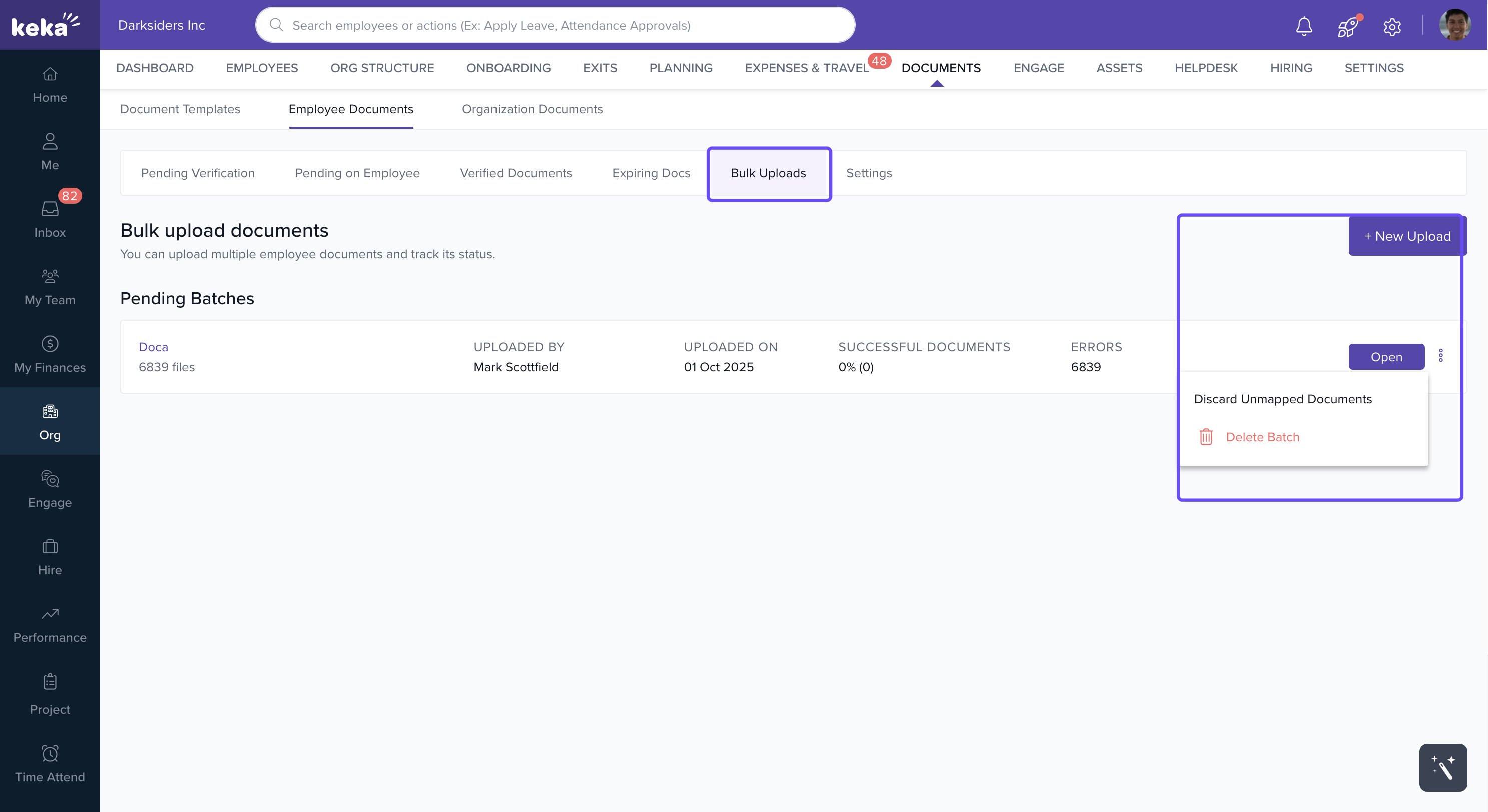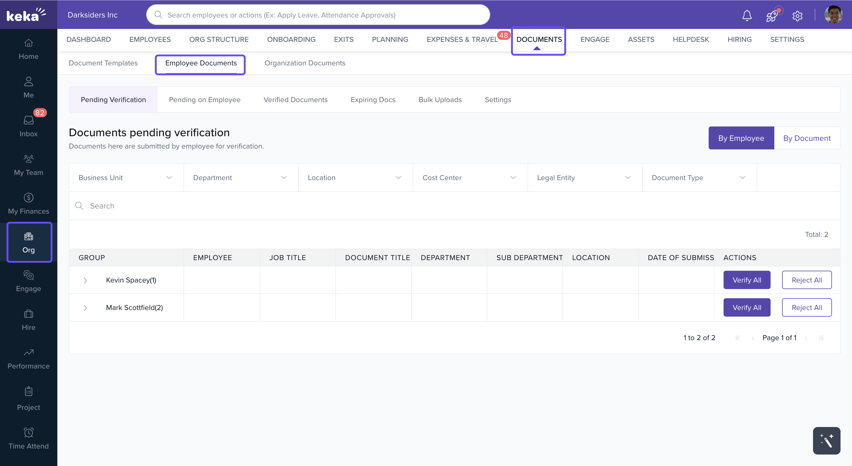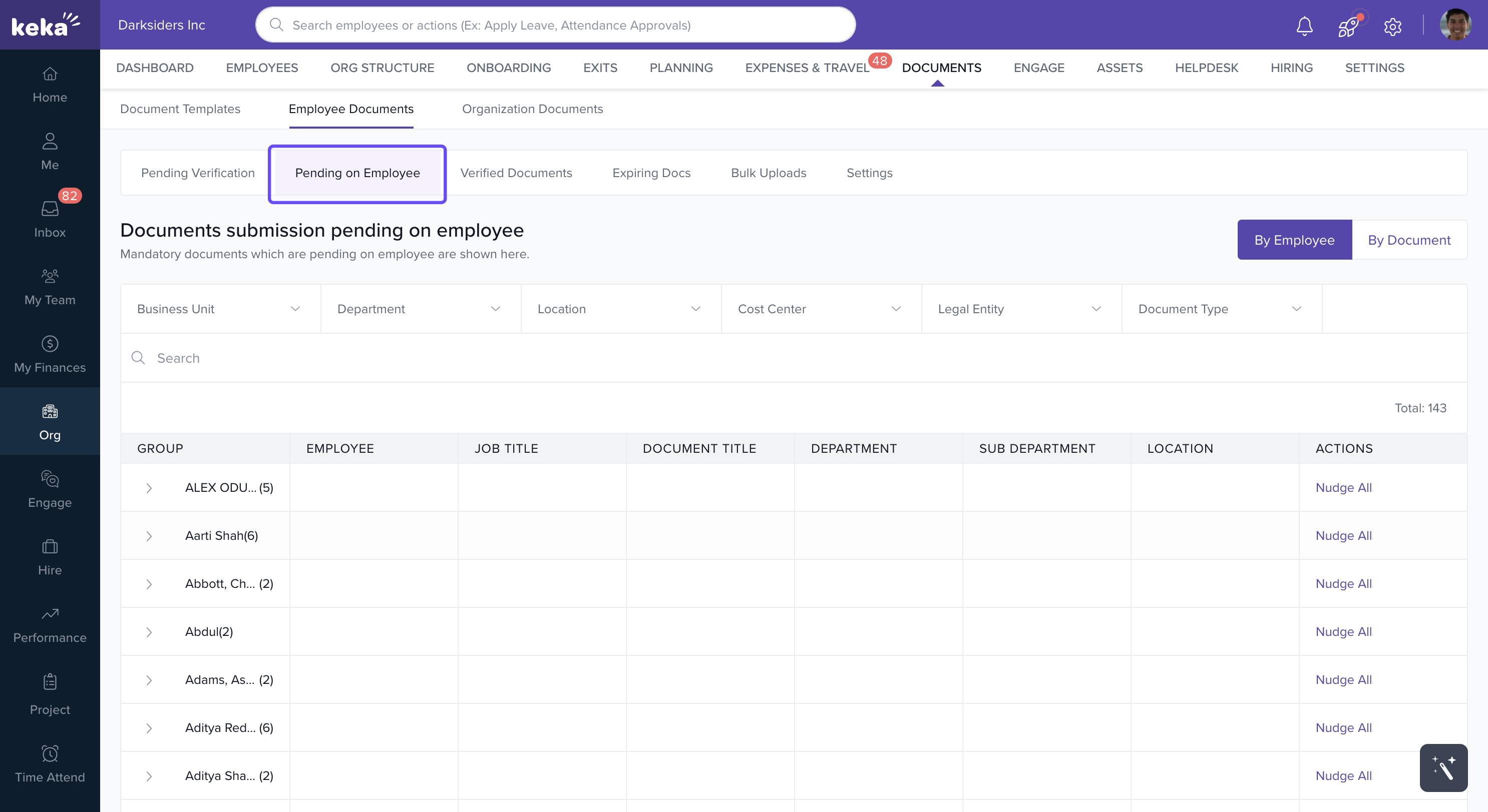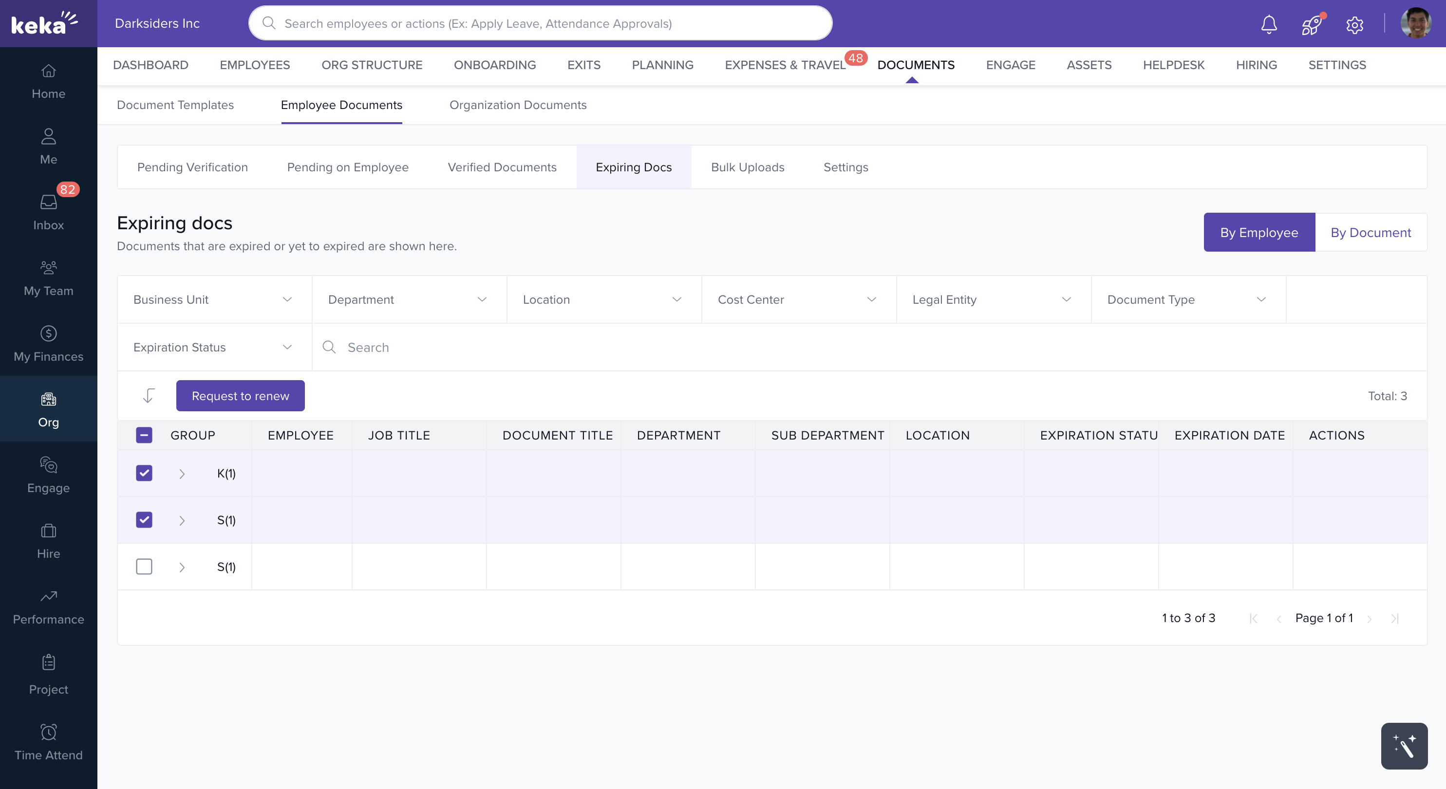 The Employee Documents tab in Keka is the central place for managing all employee document-related tasks. It categorizes documents based on their verification status, alerts you about upcoming expirations, and even allows you to create custom folders for better organization.