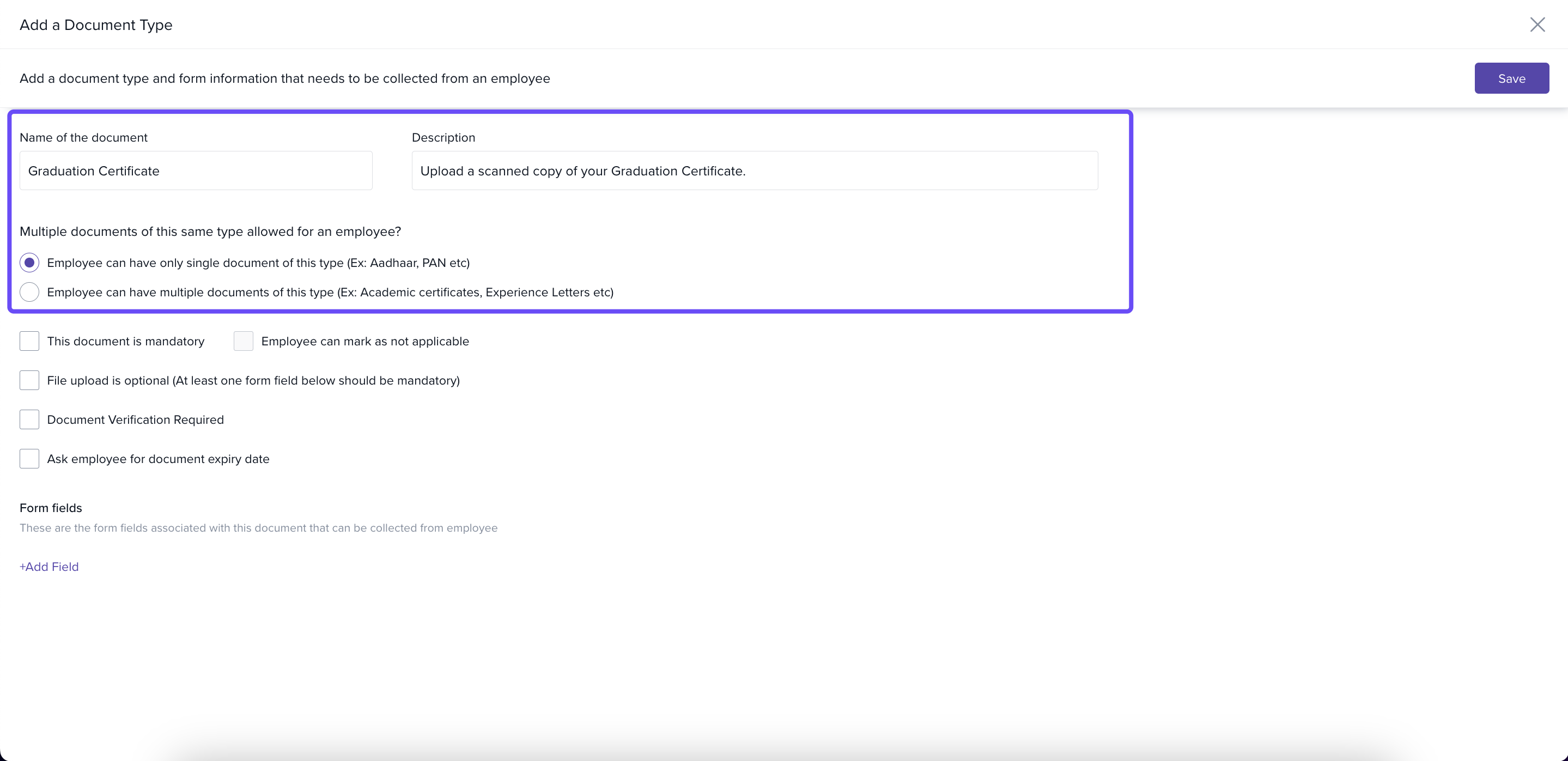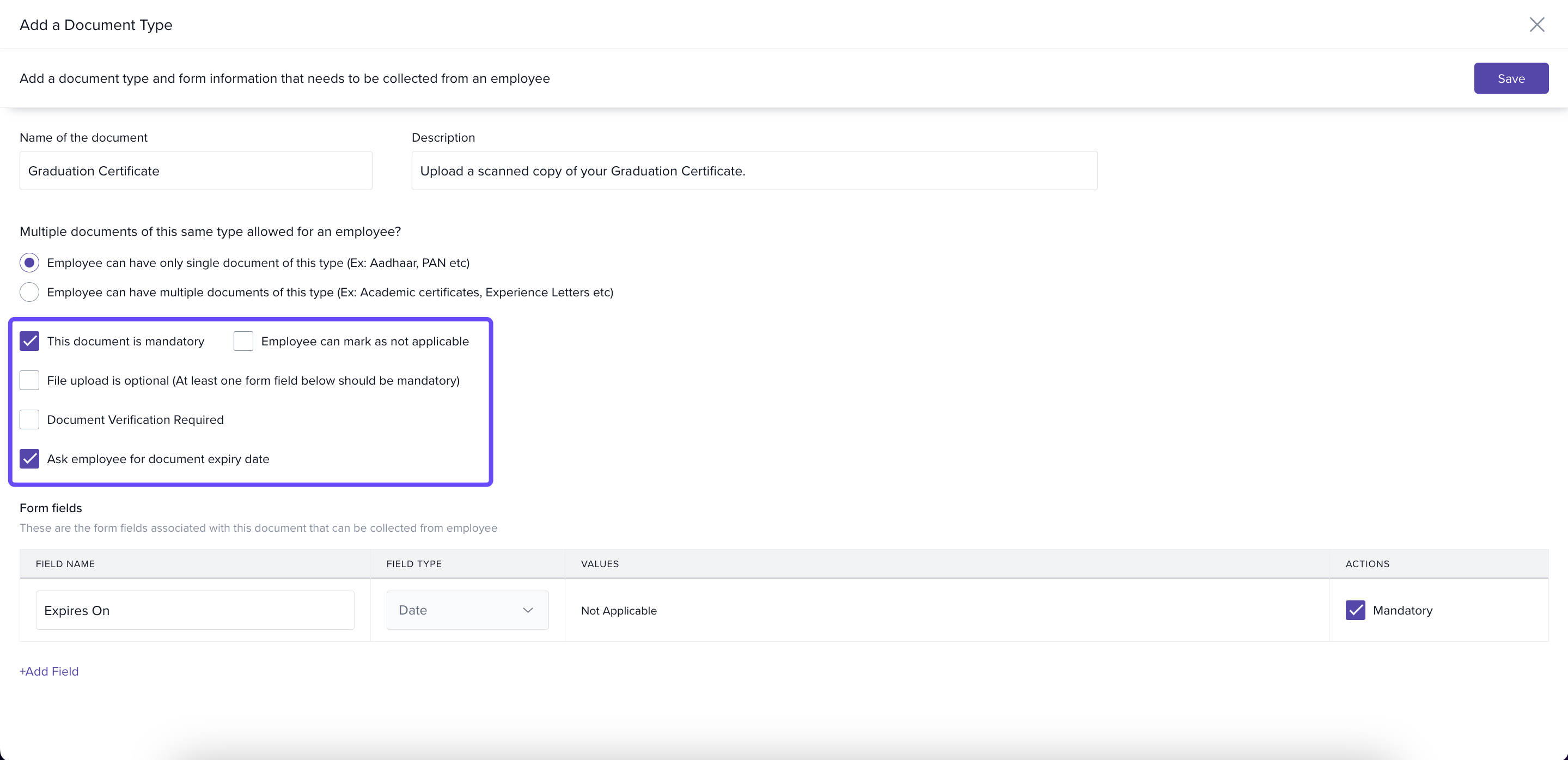 A document type specifies what kind of file should be uploaded—such as a PAN card, offer letter, or relieving letter—and allows you to configure who should upload it and what validations should apply.