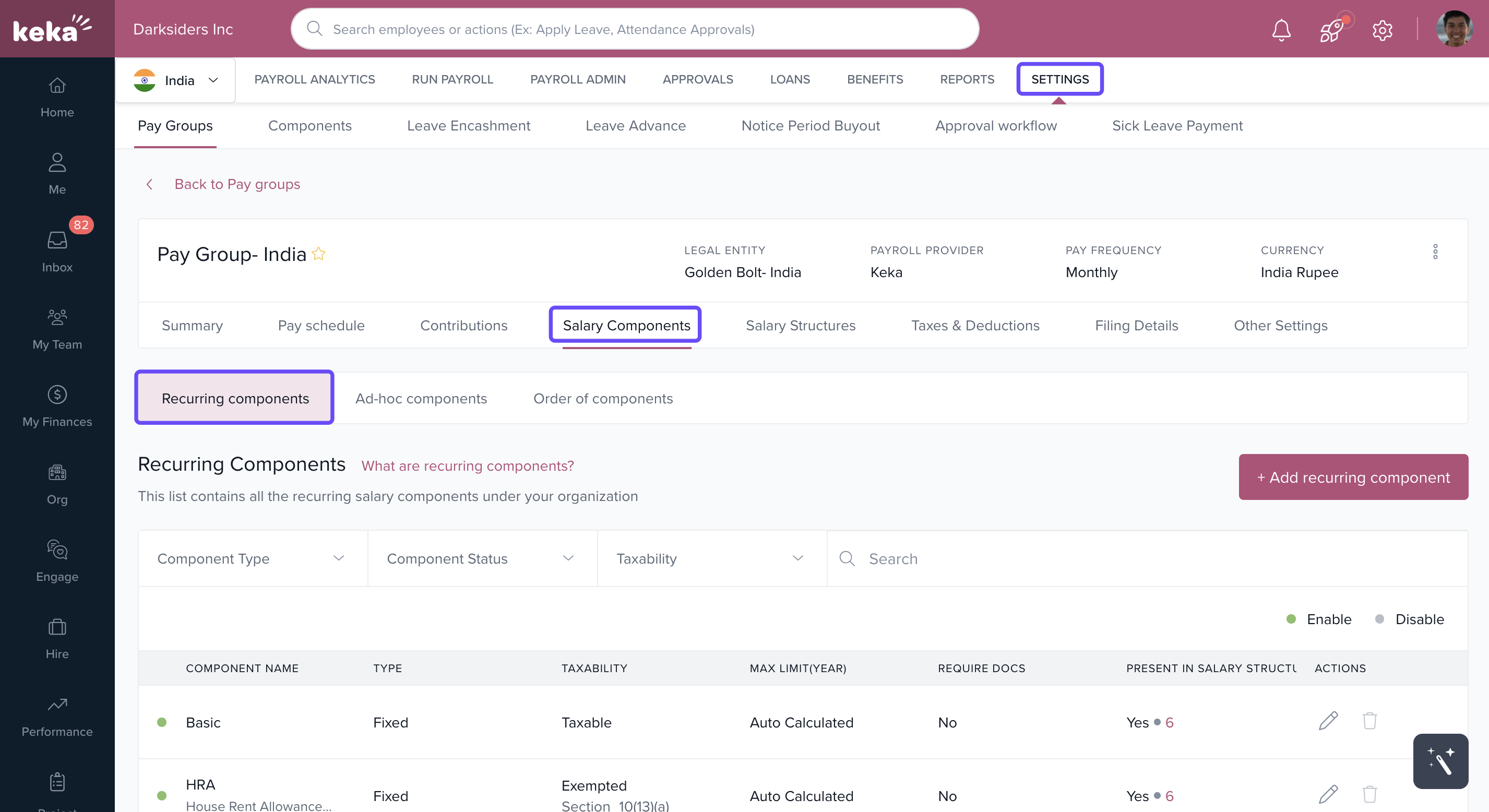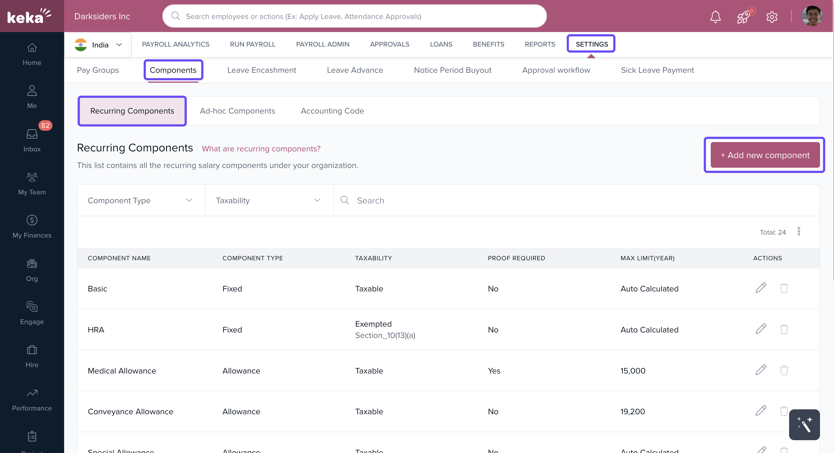 Go to Payroll > Settings > Components.