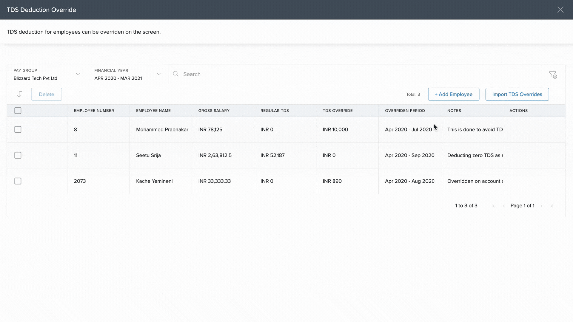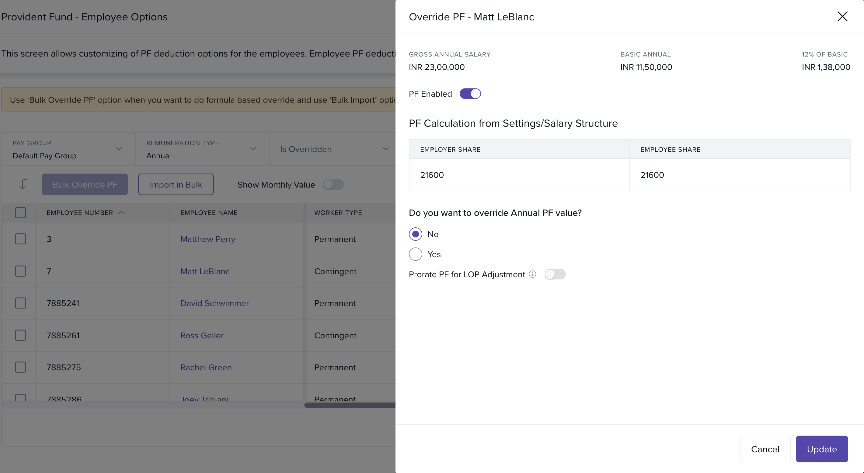 You’ll see options to override salary components, TDS, and Provident Fund contributions.