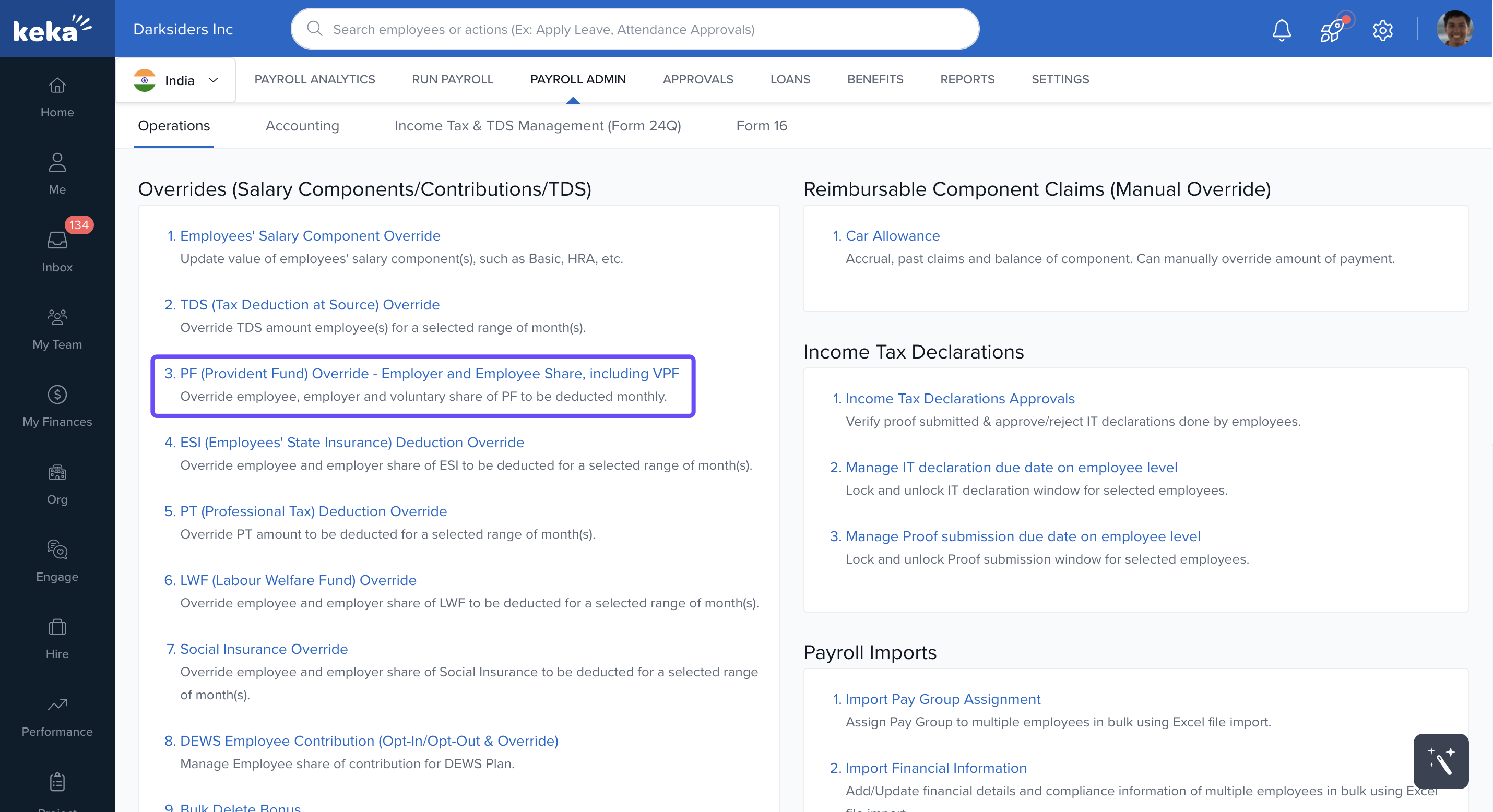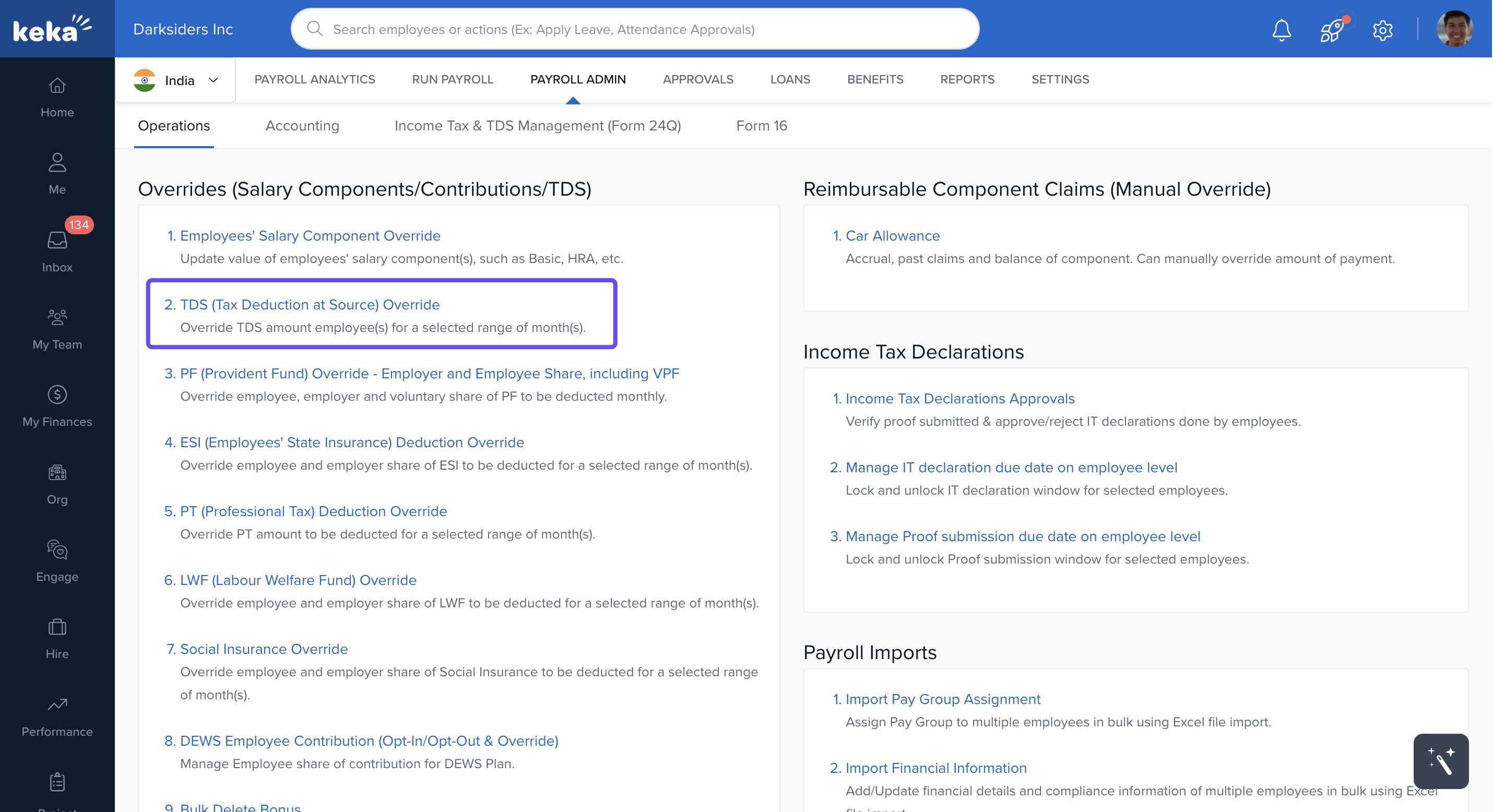 In Keka, Payroll Admins and Global Admins can override salary components, statutory contributions, and TDS amounts at the employee level—without altering the default salary structure.
