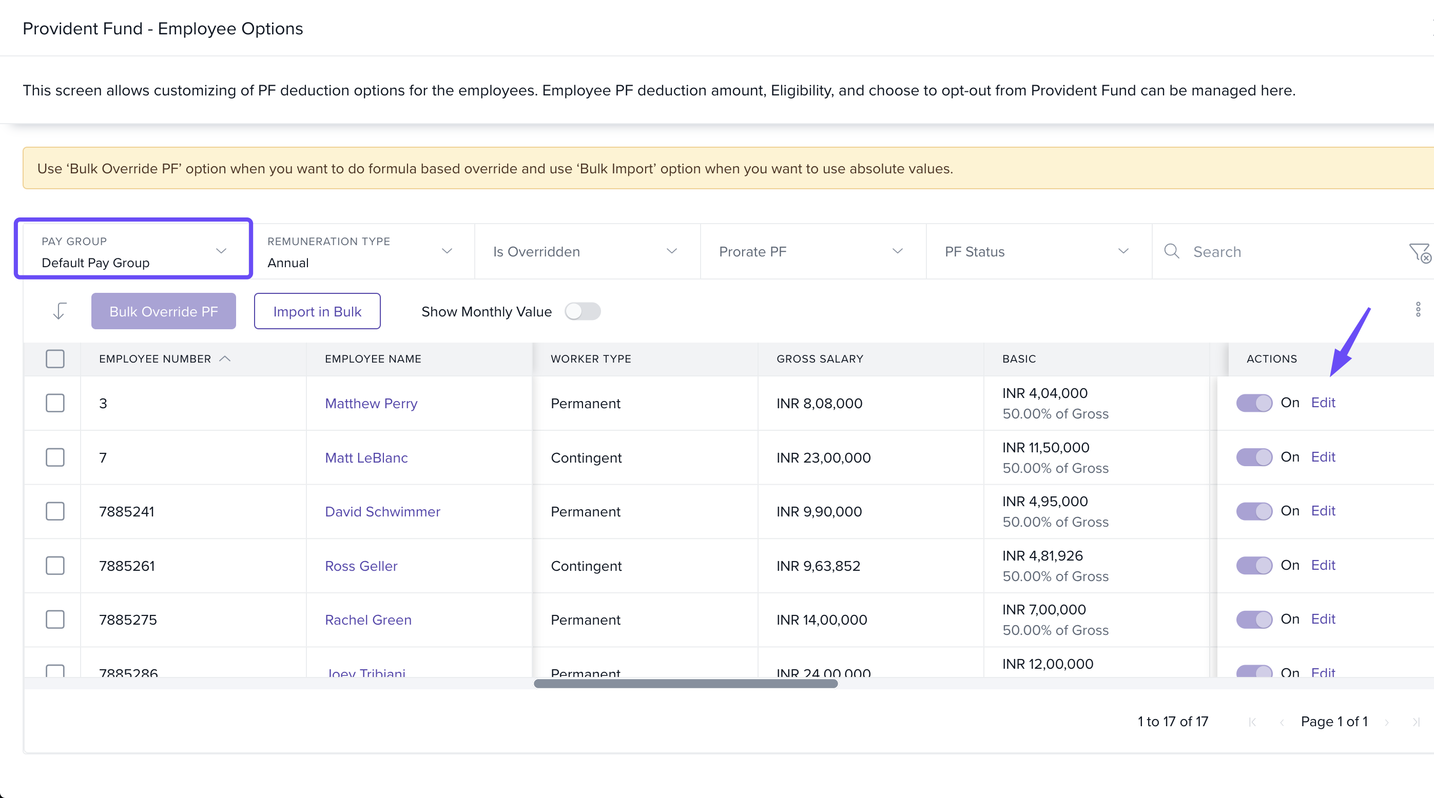 - Click on PF (Provident Fund) Override - Employer and Employee Share.