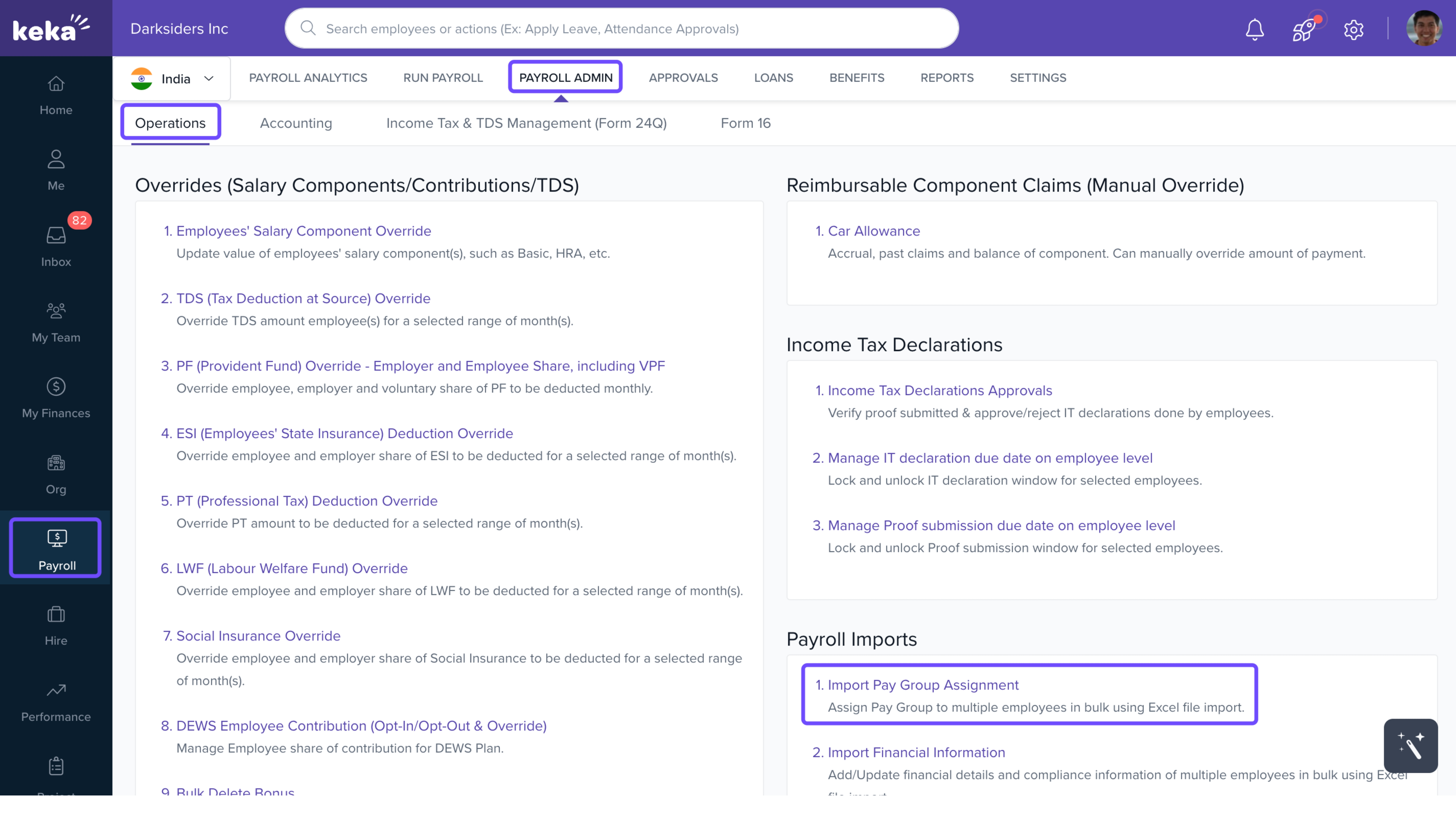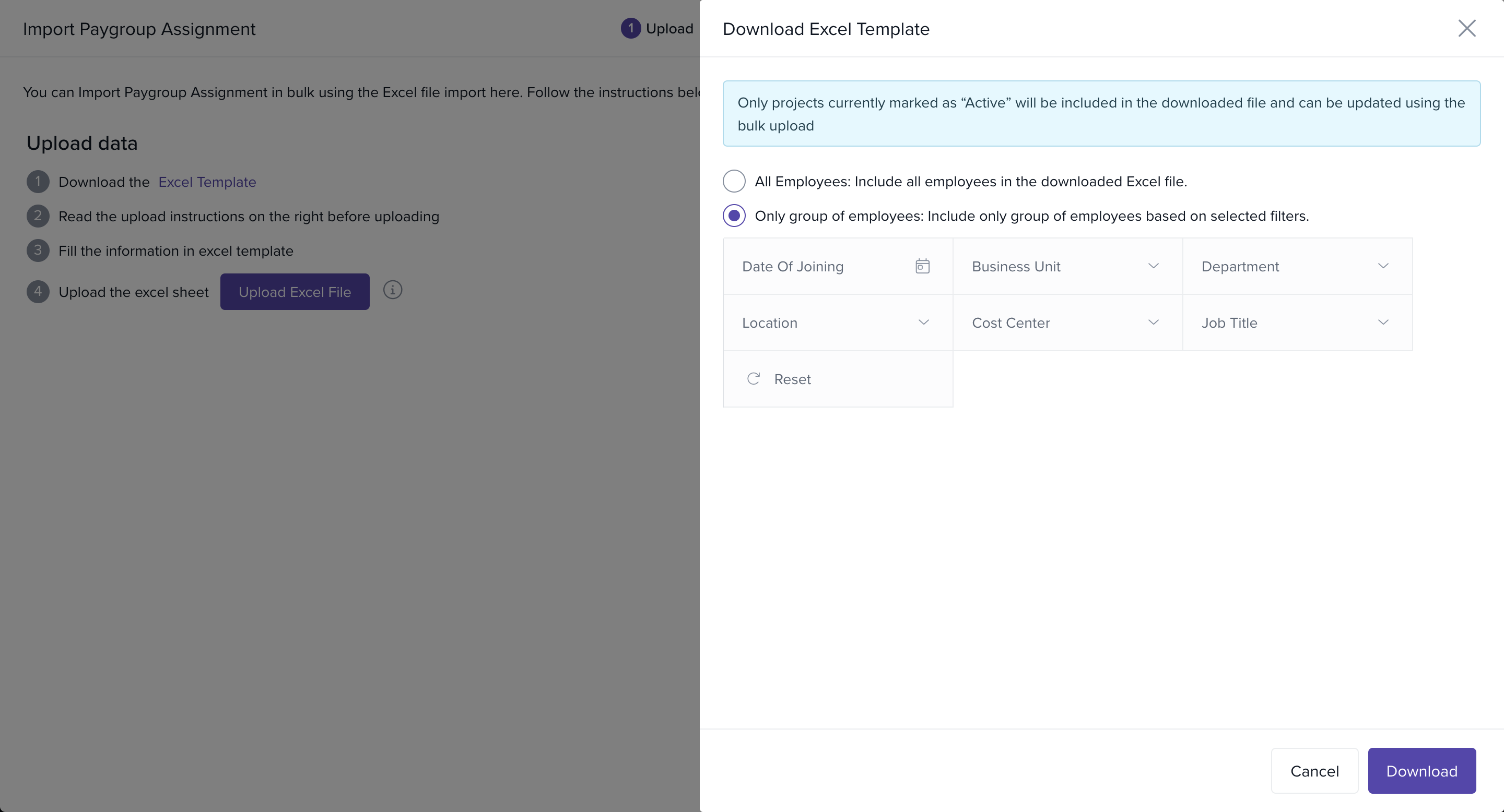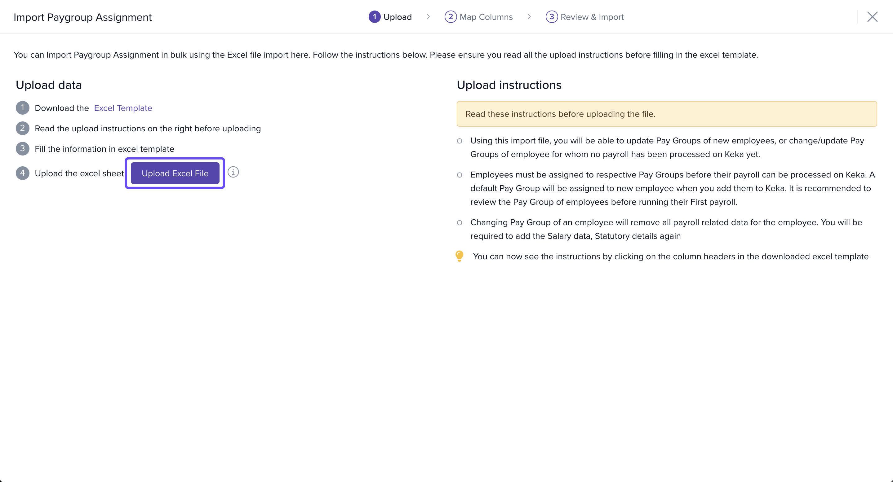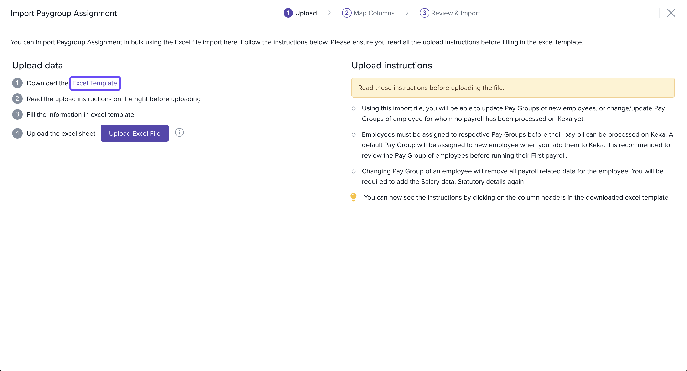 If you need to reassign pay groups—for example, when employees move laterally or when a new pay group is created—you can do so using the bulk import option.