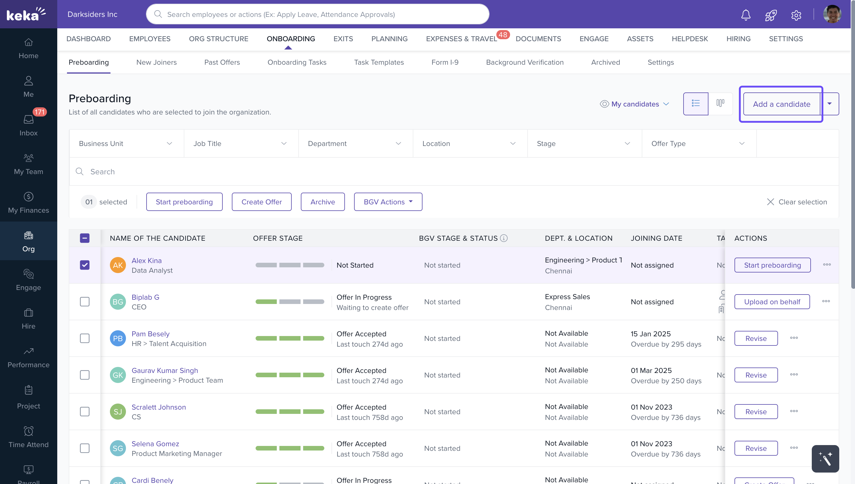 The Preboarding Dashboard gives a complete overview of all candidates who have been offered positions. Key elements include: