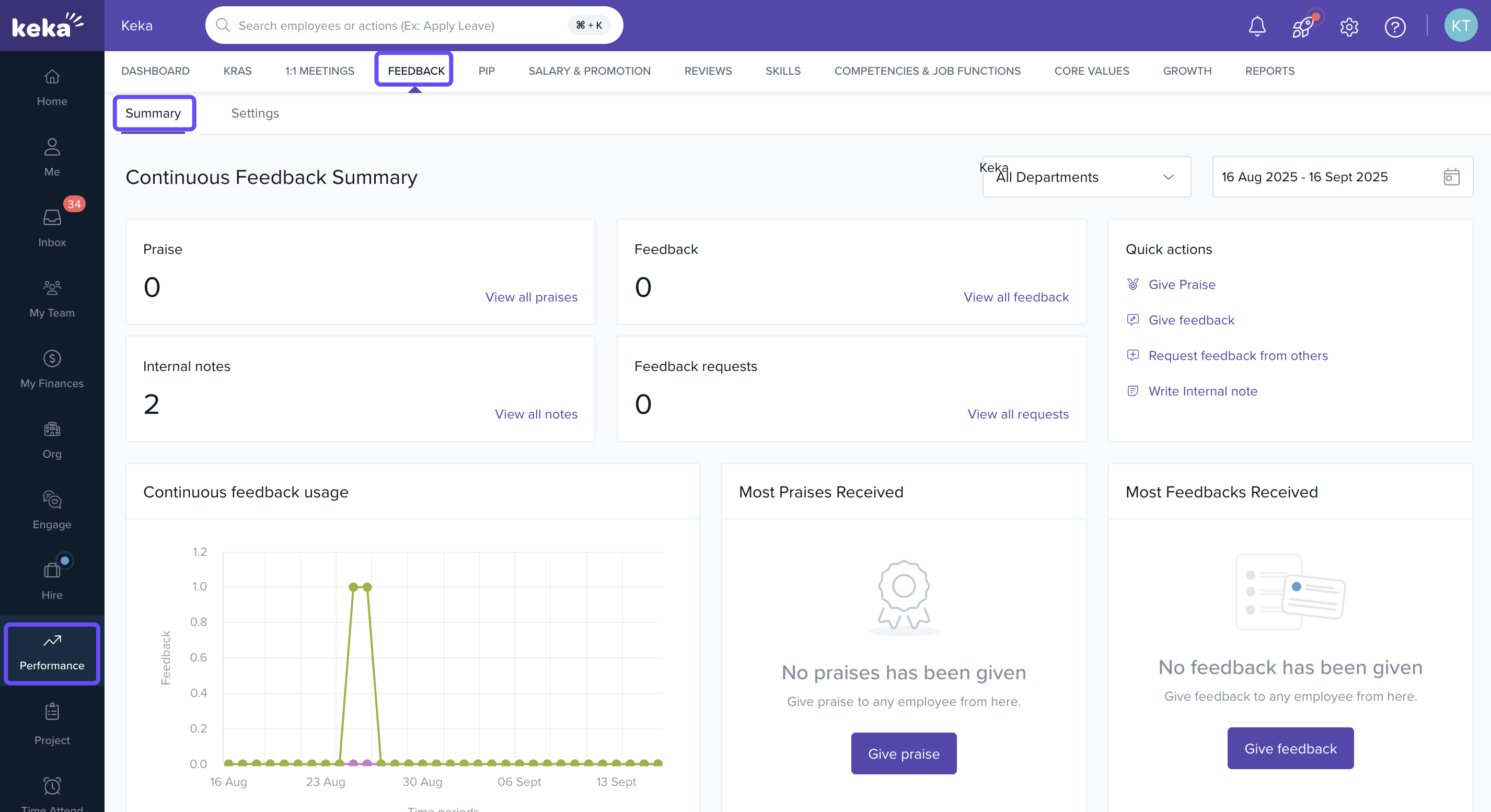 - The feature covers Praise, Feedback, Internal Notes, and Feedback Requests given/received via Keka’s Continuous Feedback module.