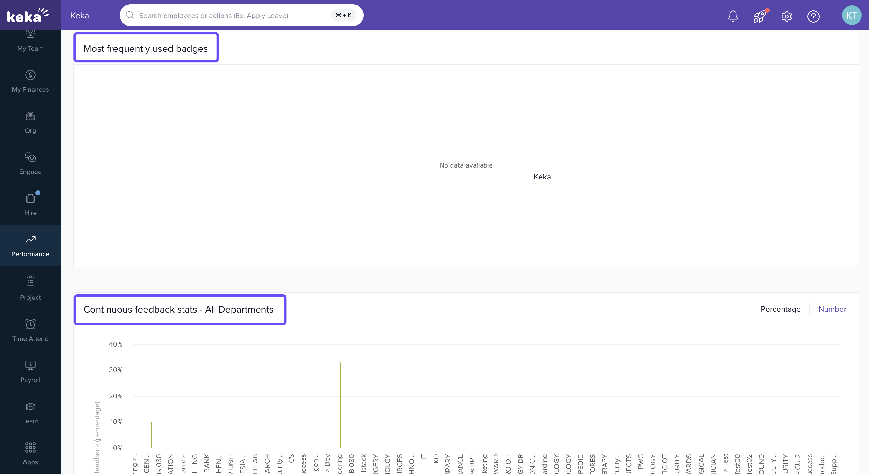 Continuous feedback stats: Examine department-specific engagement with continuous feedback graph. This analysis can help pinpoint areas of high engagement or departments that may require additional support in fostering a feedback-rich environment.