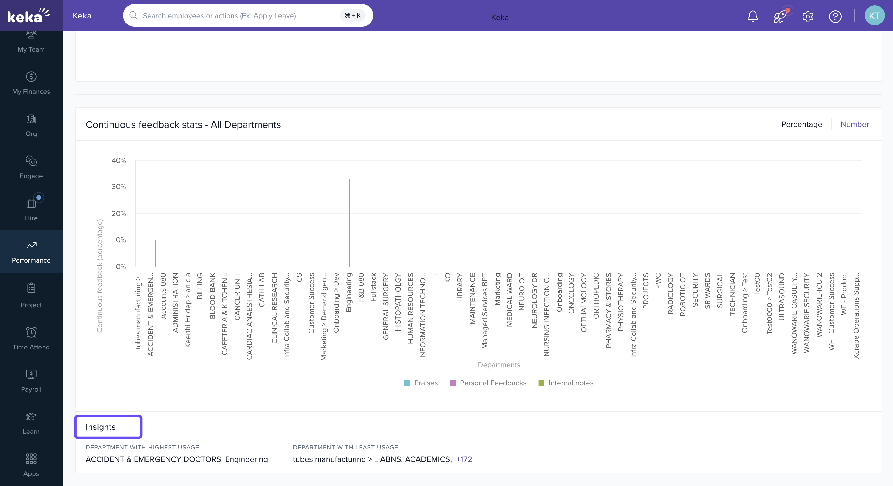 Insights: This part of the feedback page helps you understand how different departments are using the feedback system. It gives you a clear picture of which departments are talking and sharing the most.