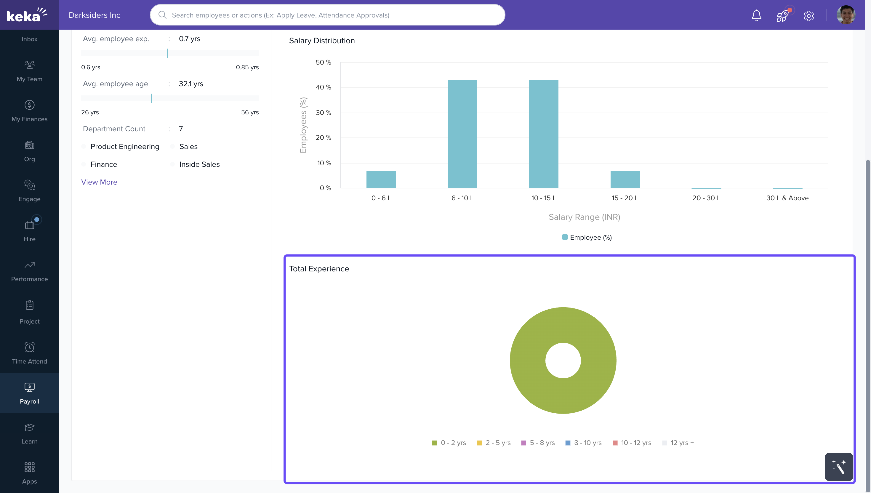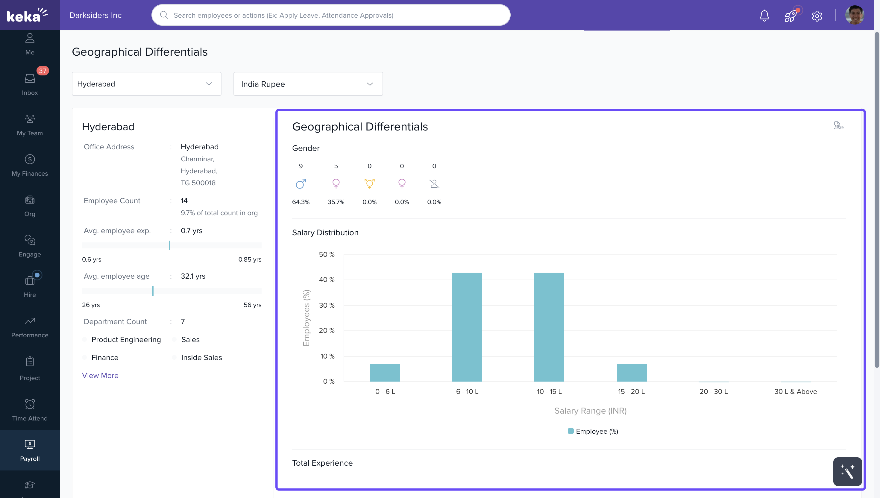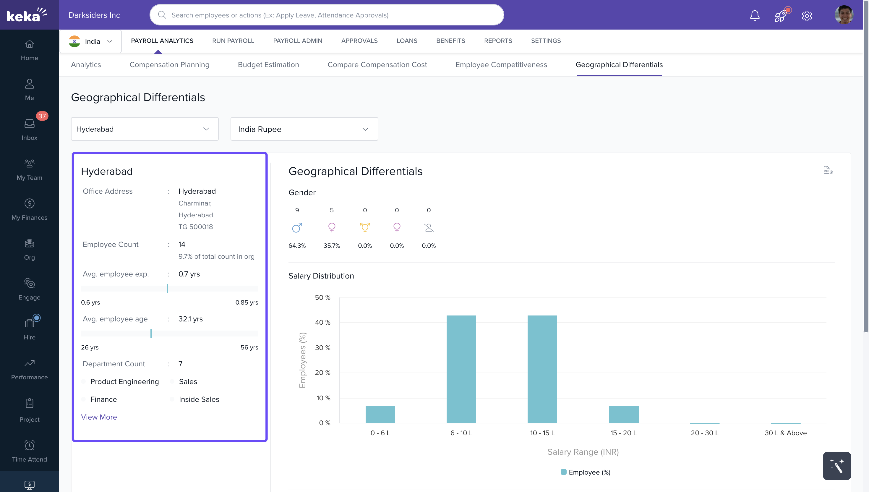 The Geographical Differentials tab in Keka’s Payroll Analytics helps you analyze employee and payroll data based on specific company locations. You can view salary distribution, gender data, employee experience, and departmental headcount for any configured location.