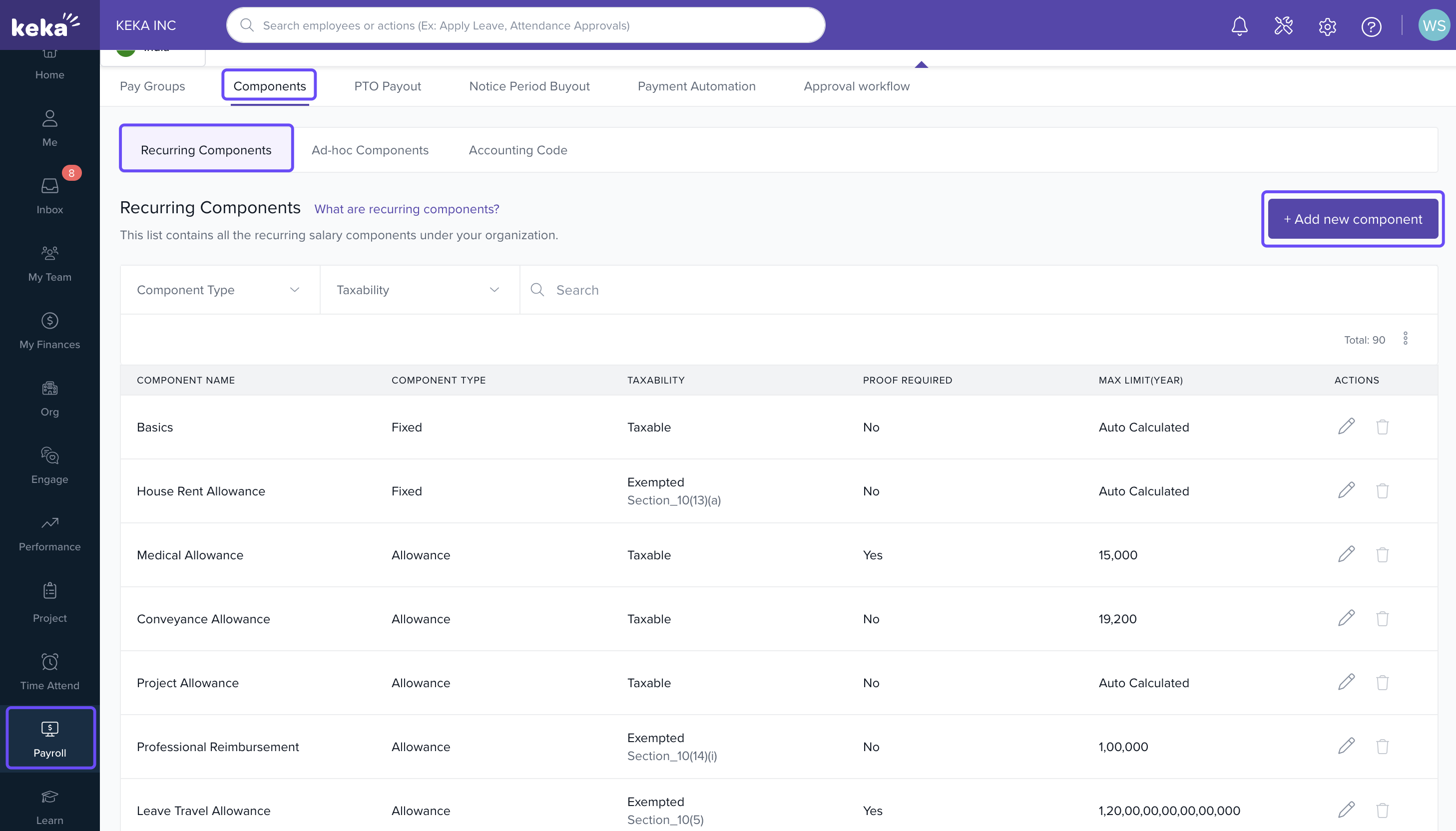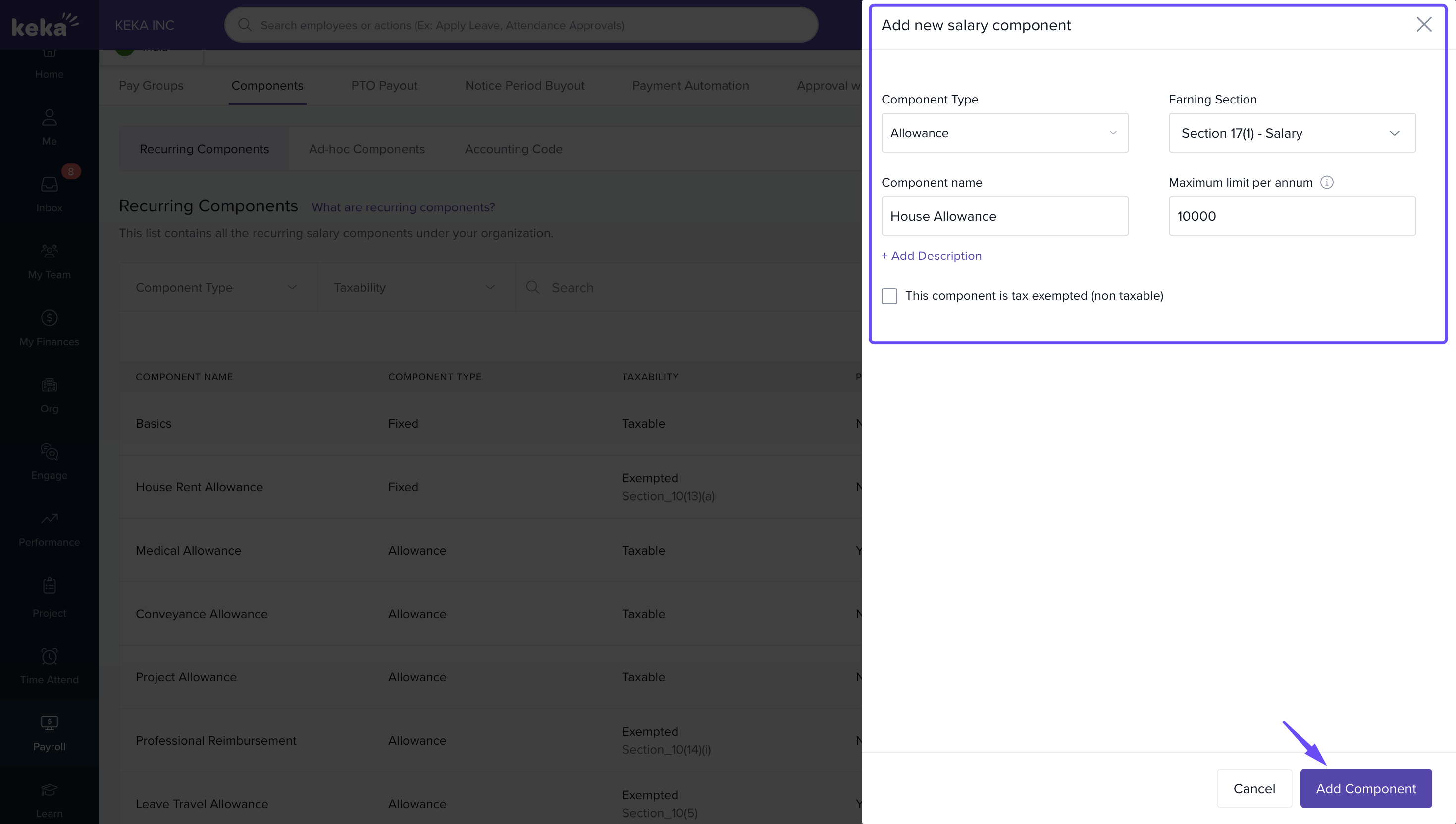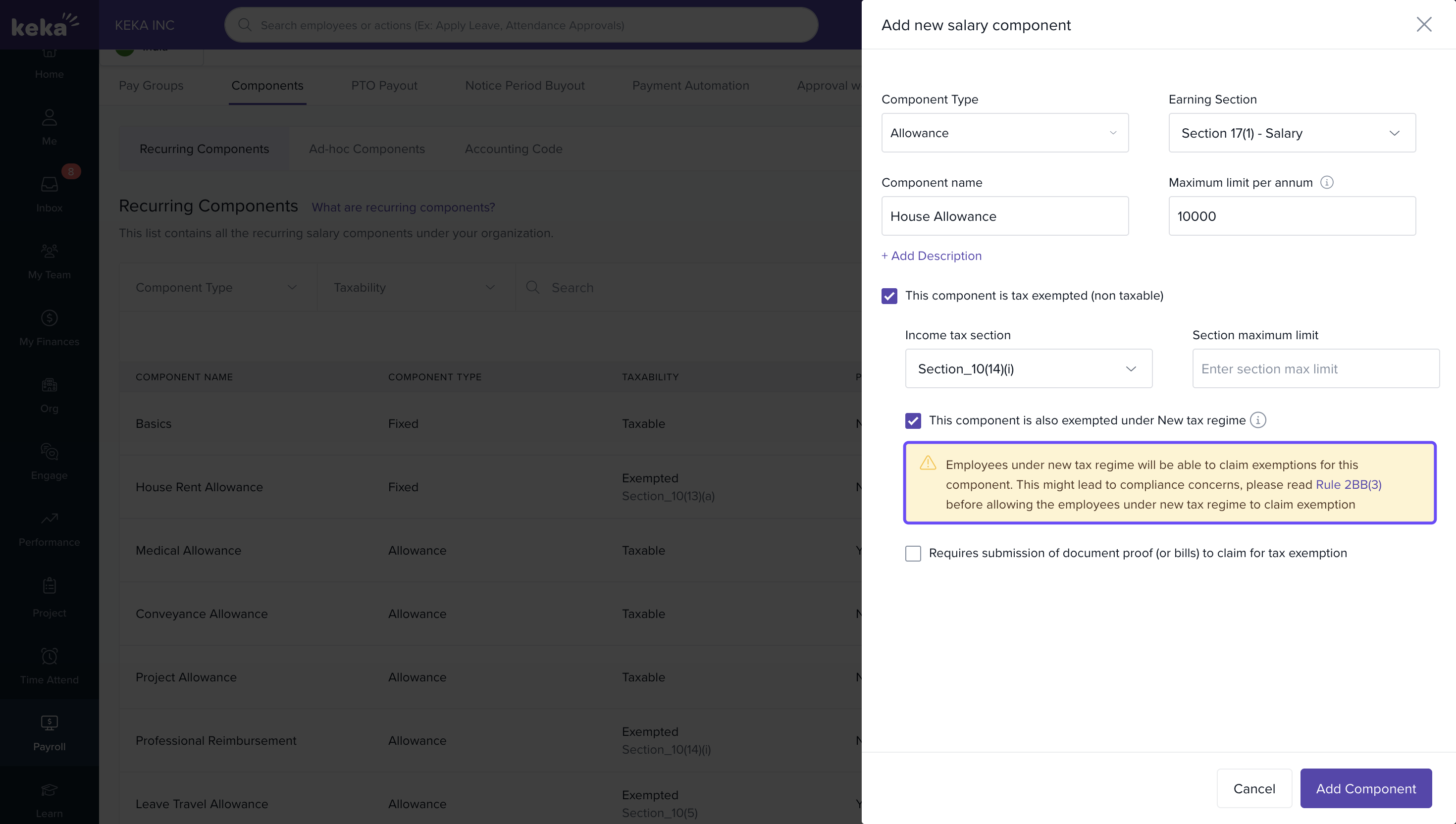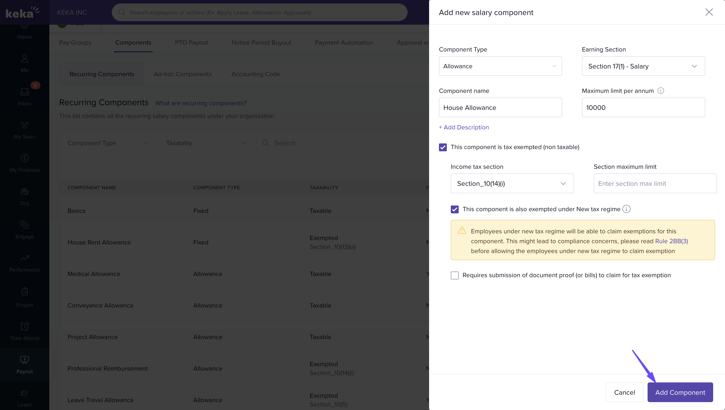 Let us now take a look at how to configure salary components as tax exempted for employees under the new tax regime on Keka -