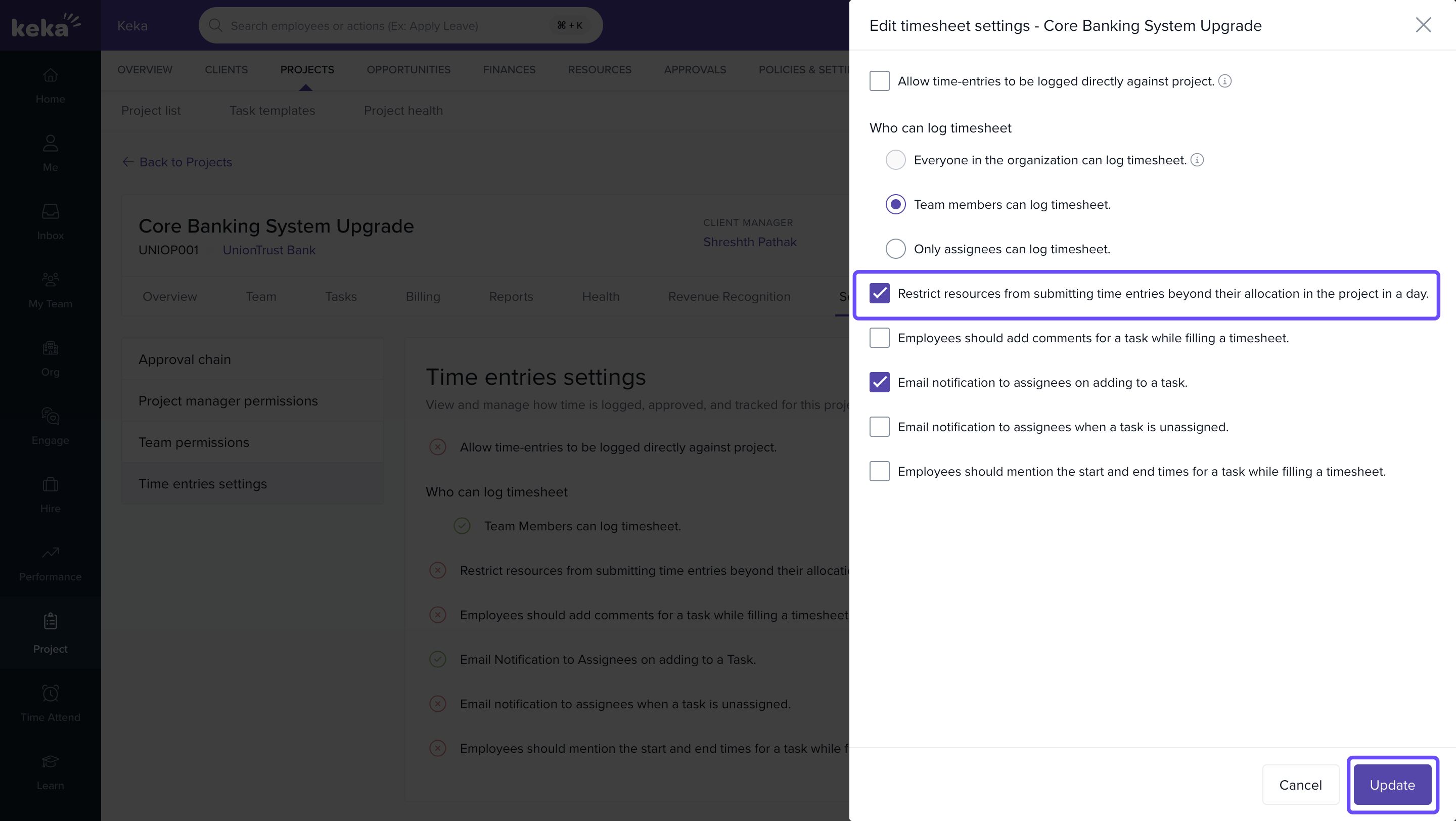- Enable the setting “Restrict timesheet entries to allocated hours”