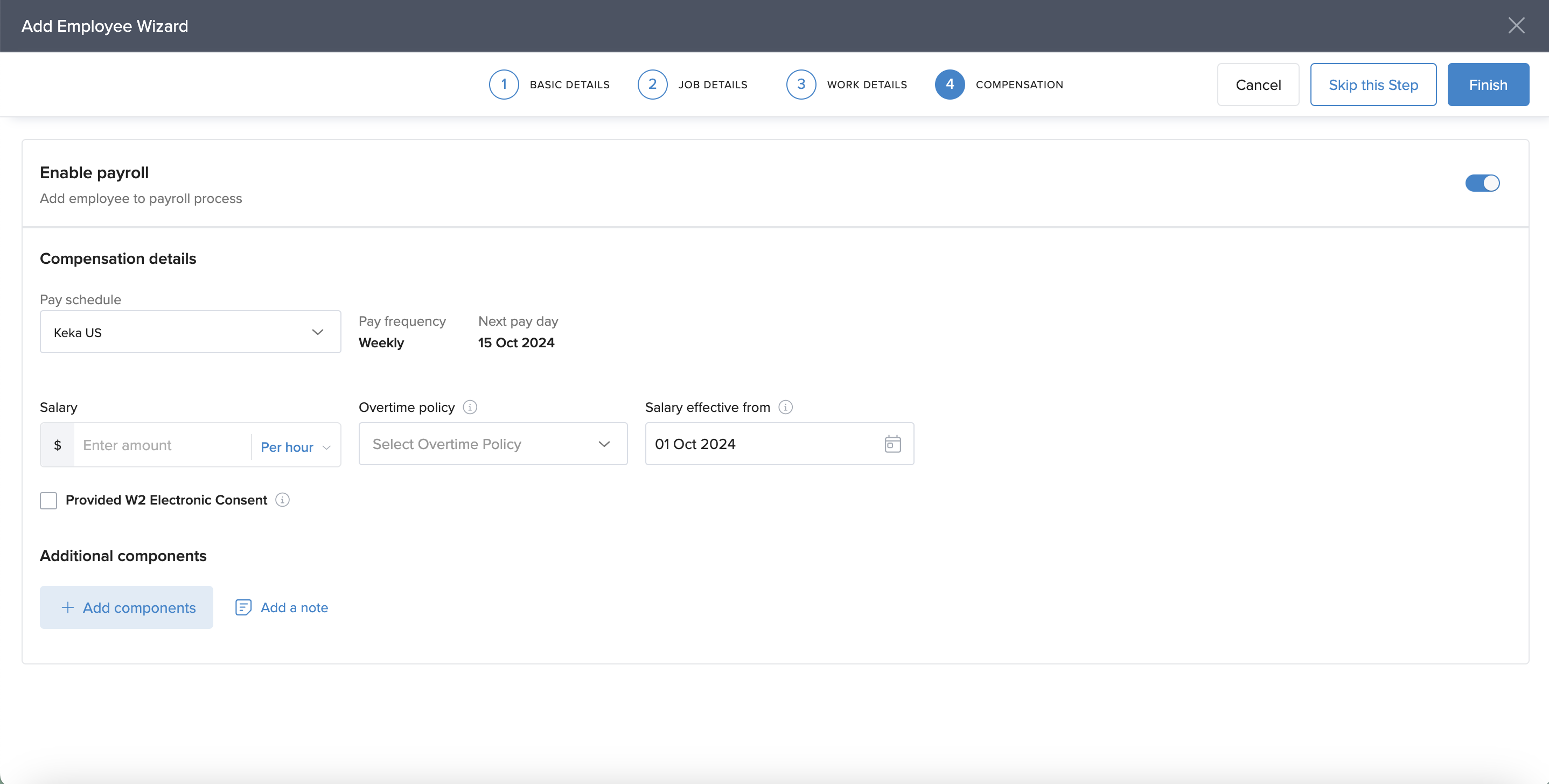4. Toggle Enable Payroll to include the employee in your payroll process.