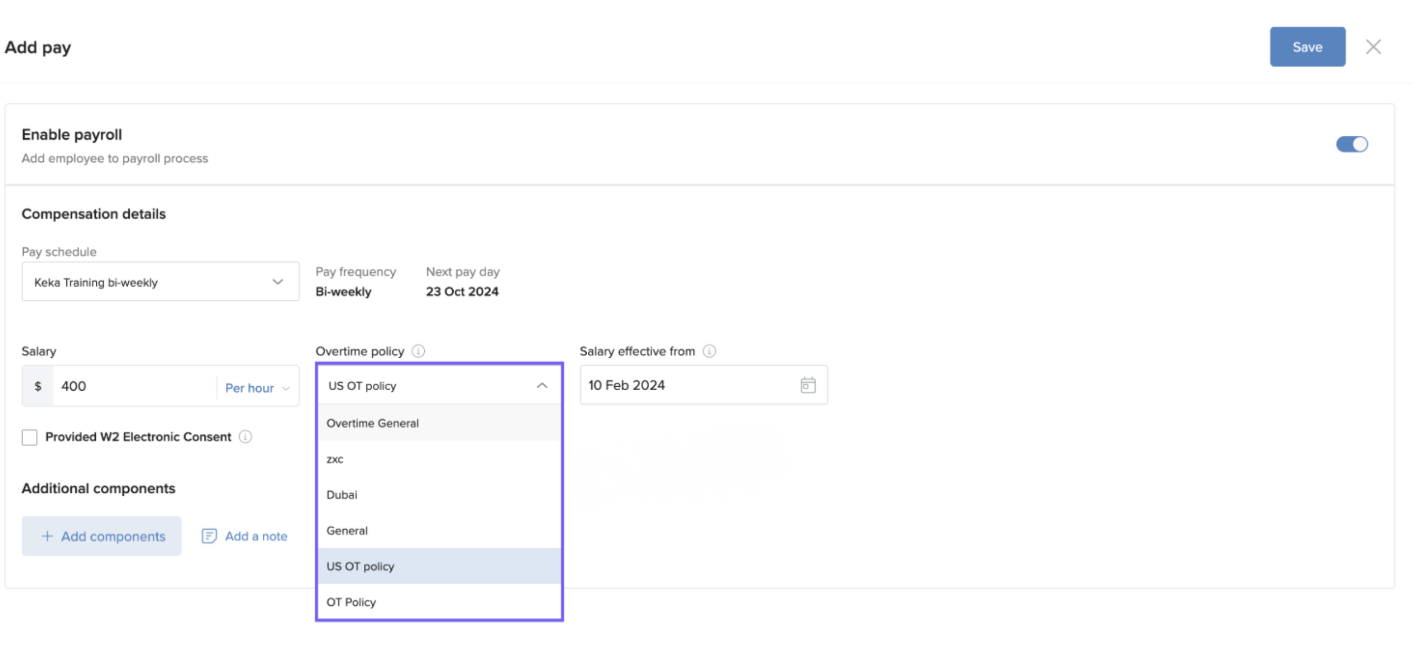 7. From the Overtime Policy dropdown, pick the one that applies to this employee.