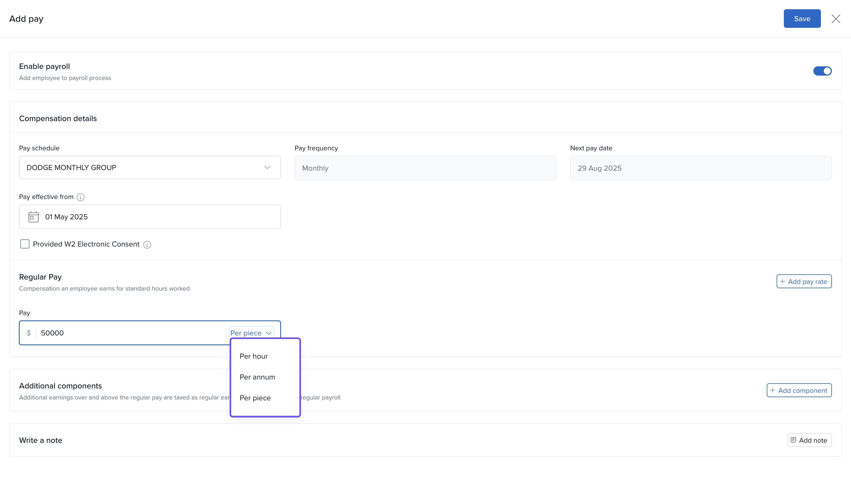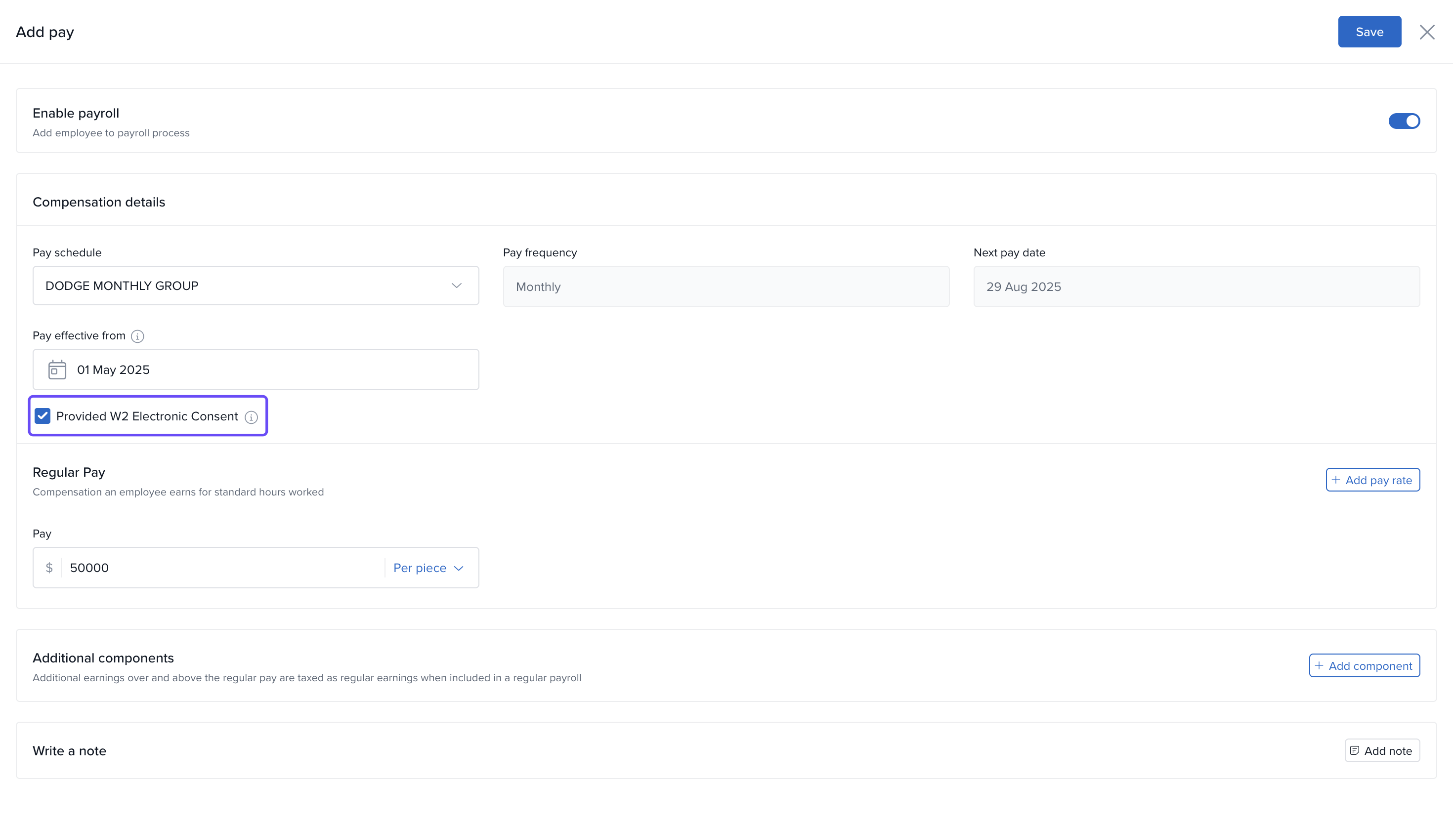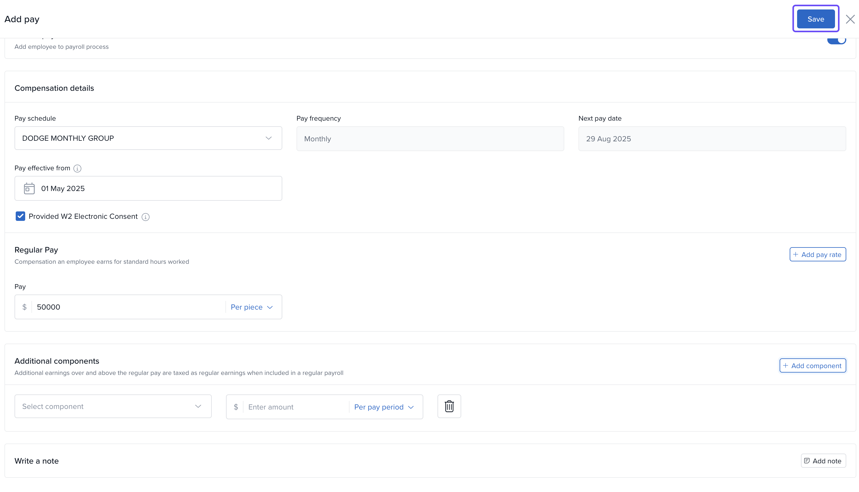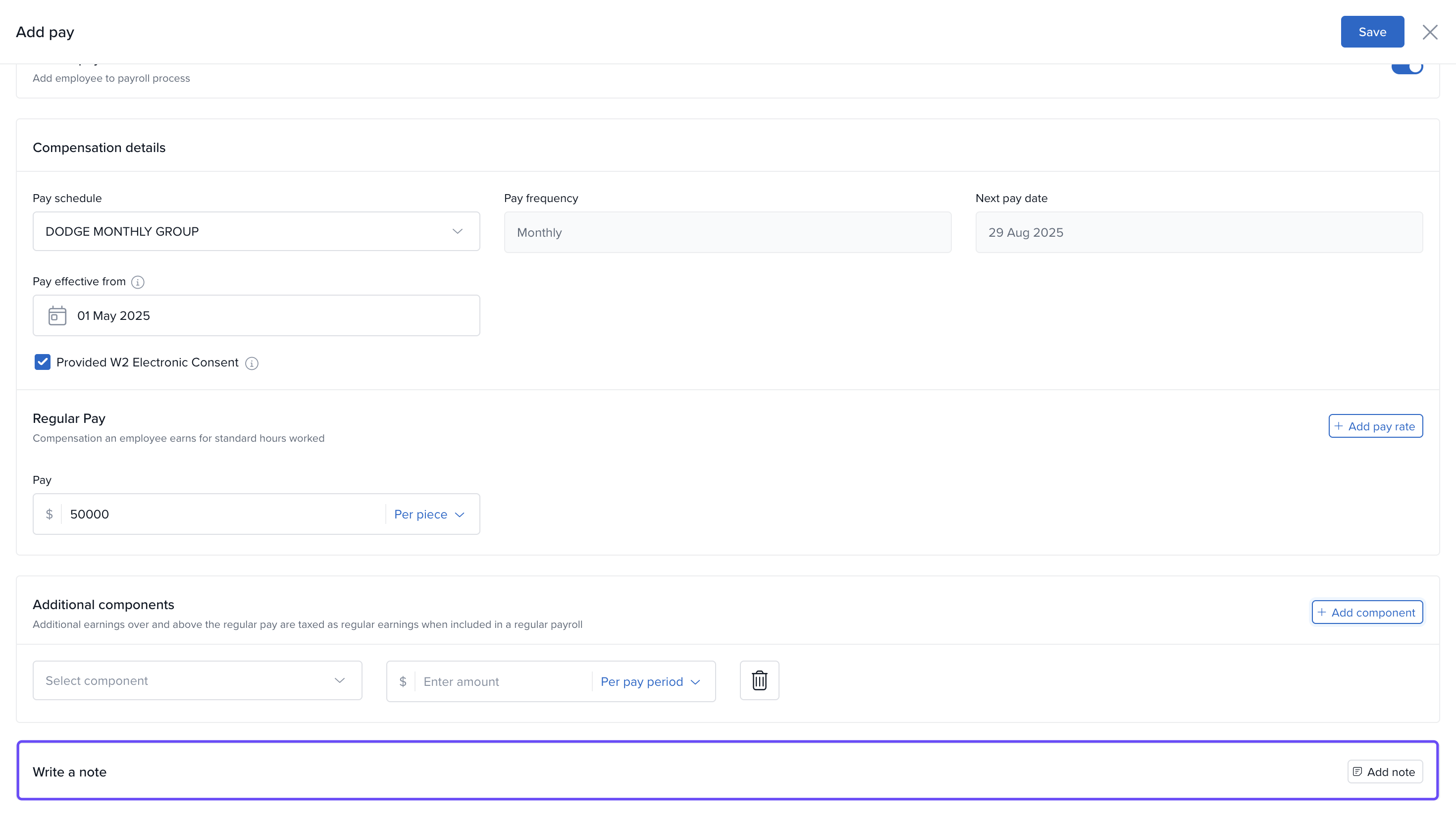 - Click Add Note to include any comments about the setup or salary components.