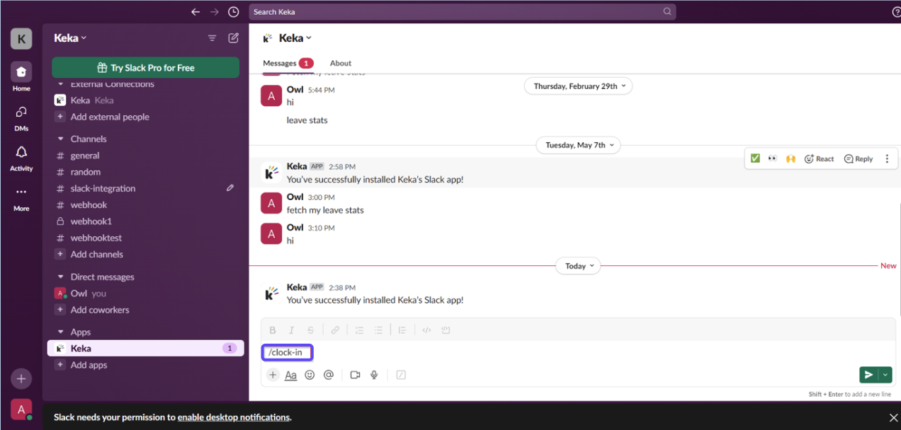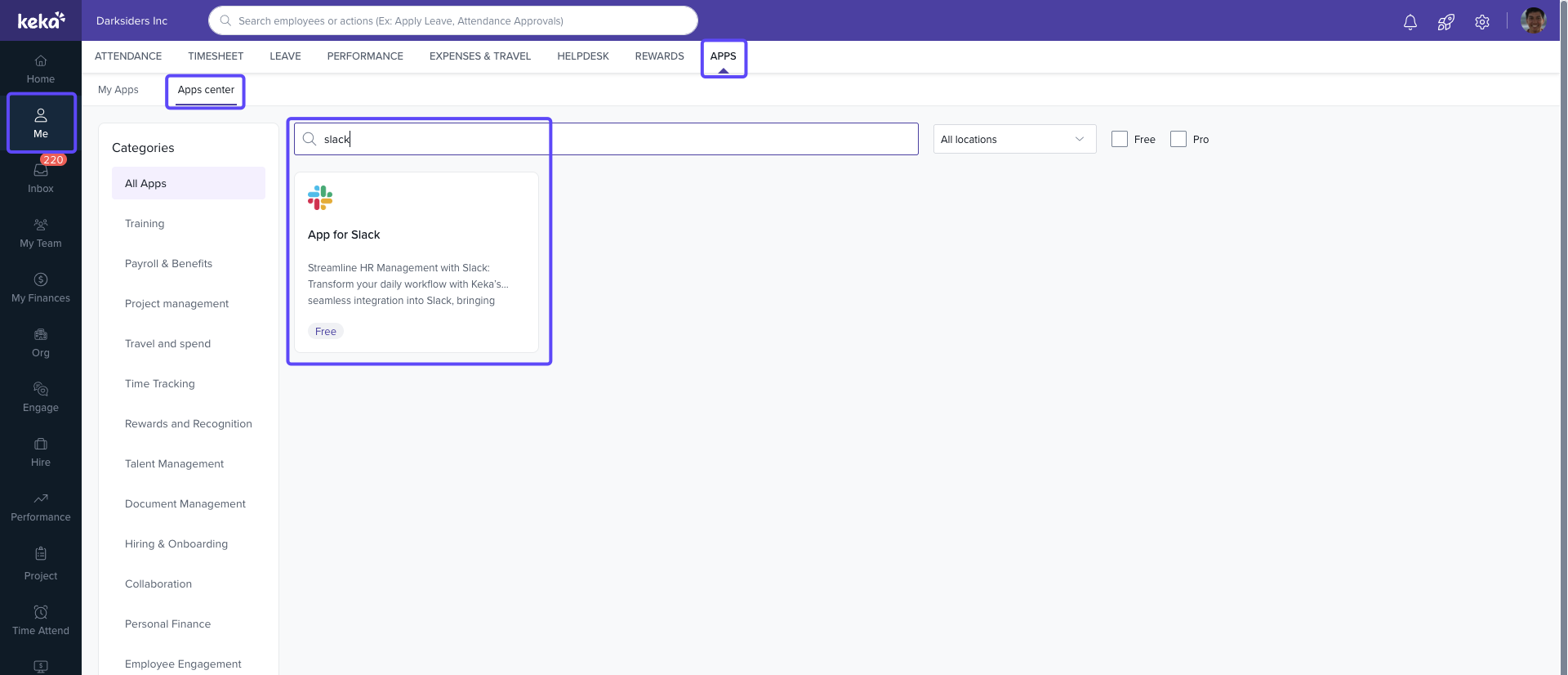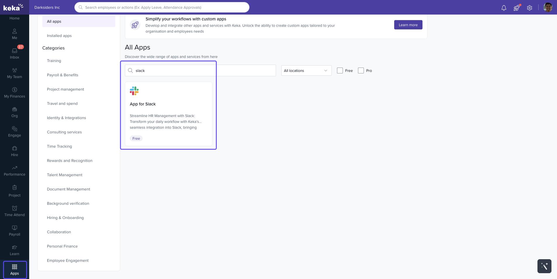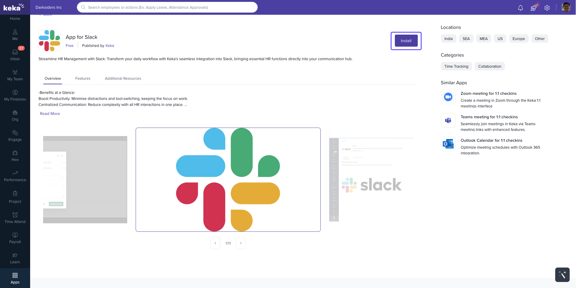 Before employees can use Slack for time and leave, the Global Admin must install the Slack app in Keka: