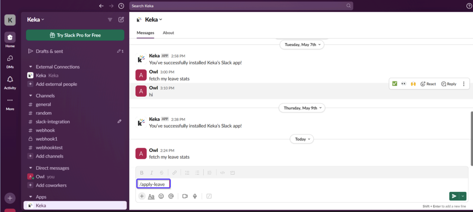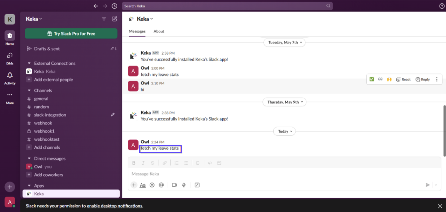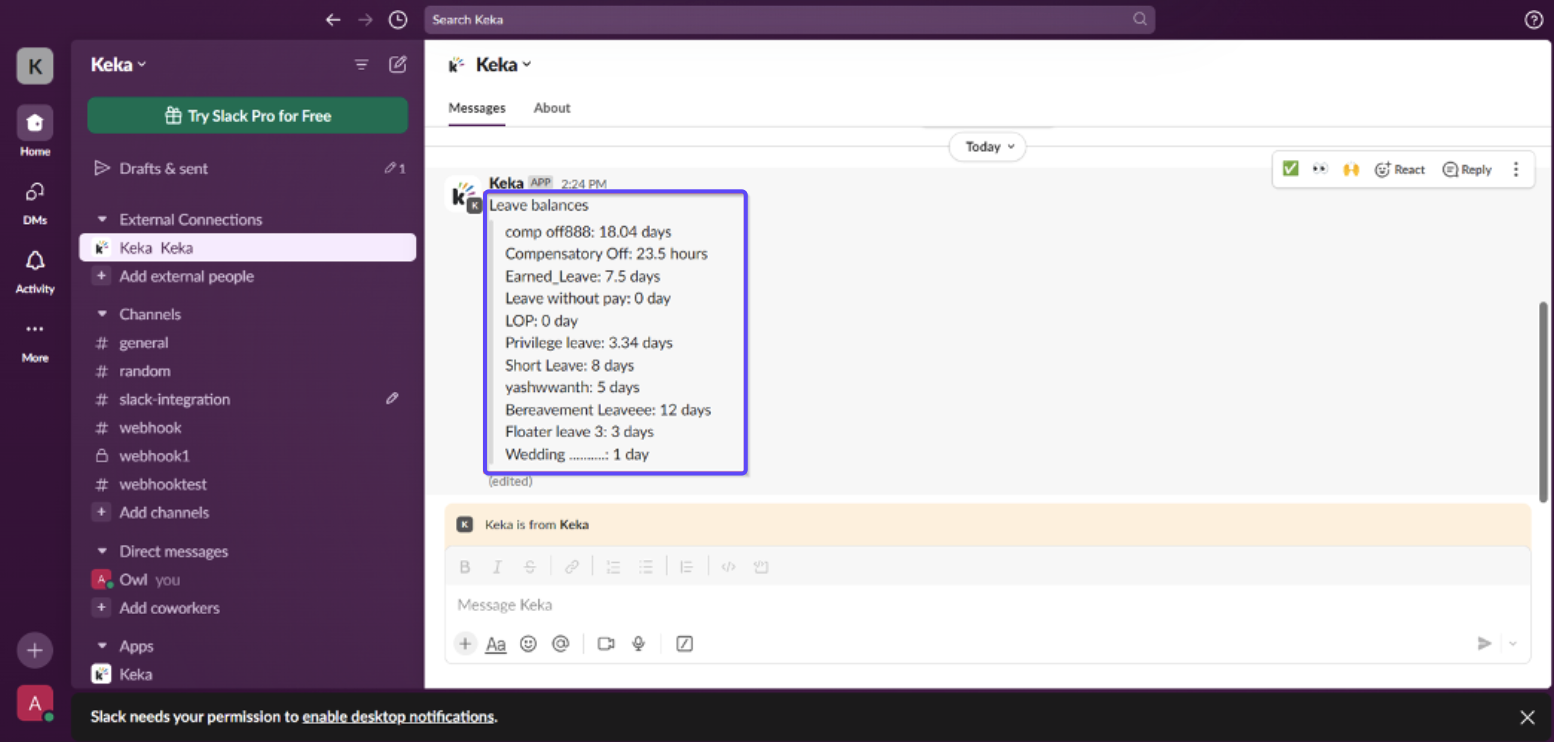 fetch my leave statsKeka will display your current leave balances right in Slack.