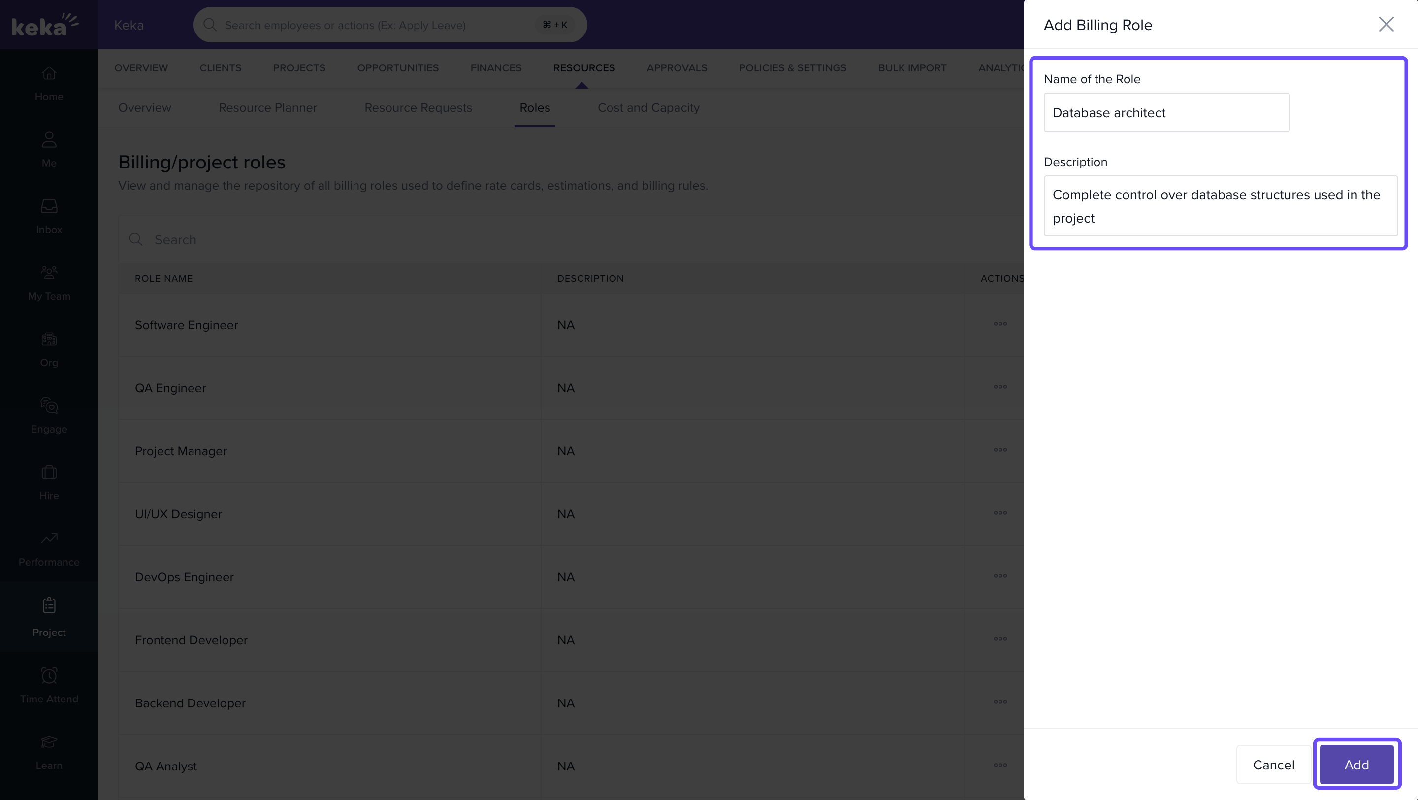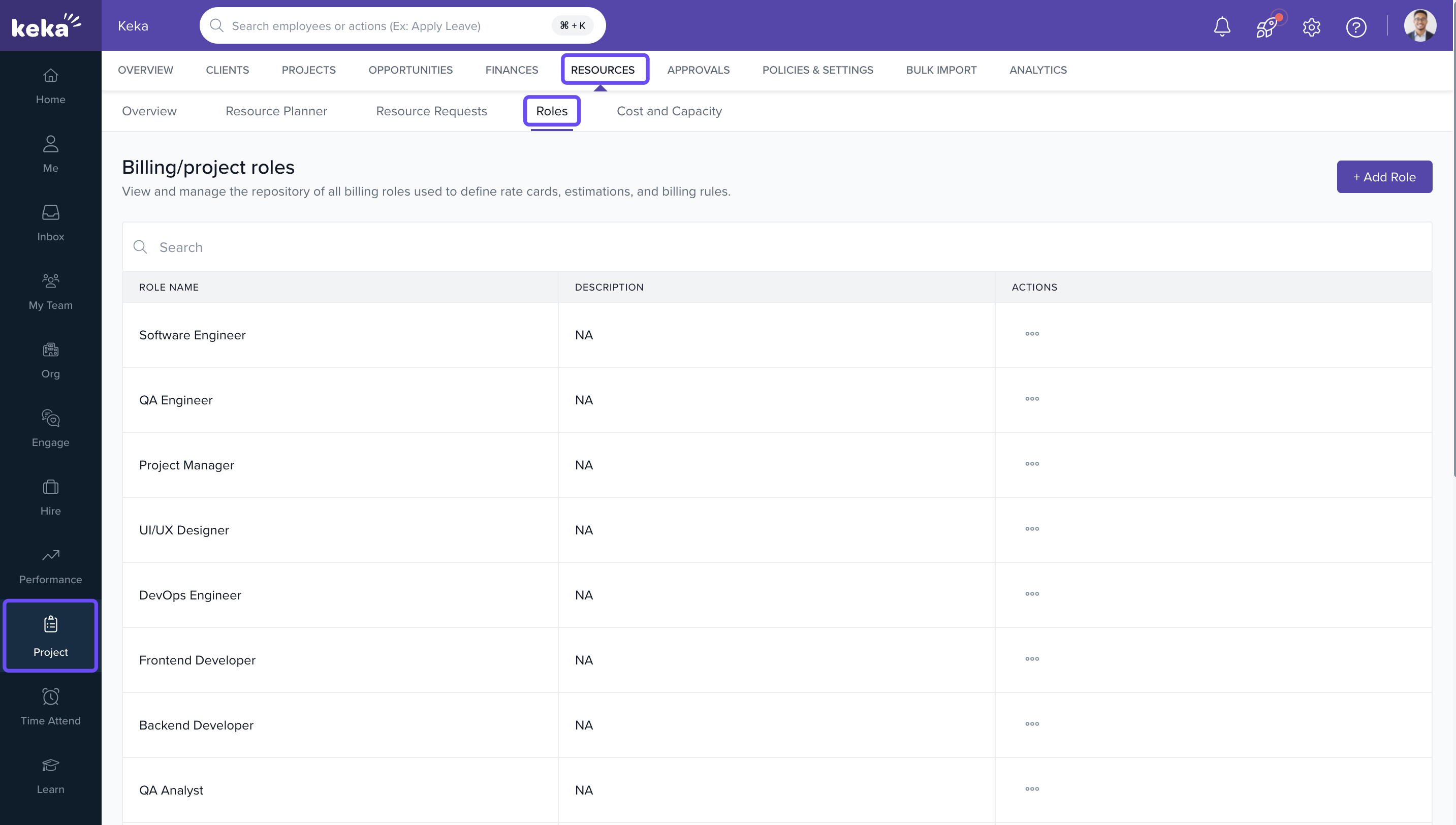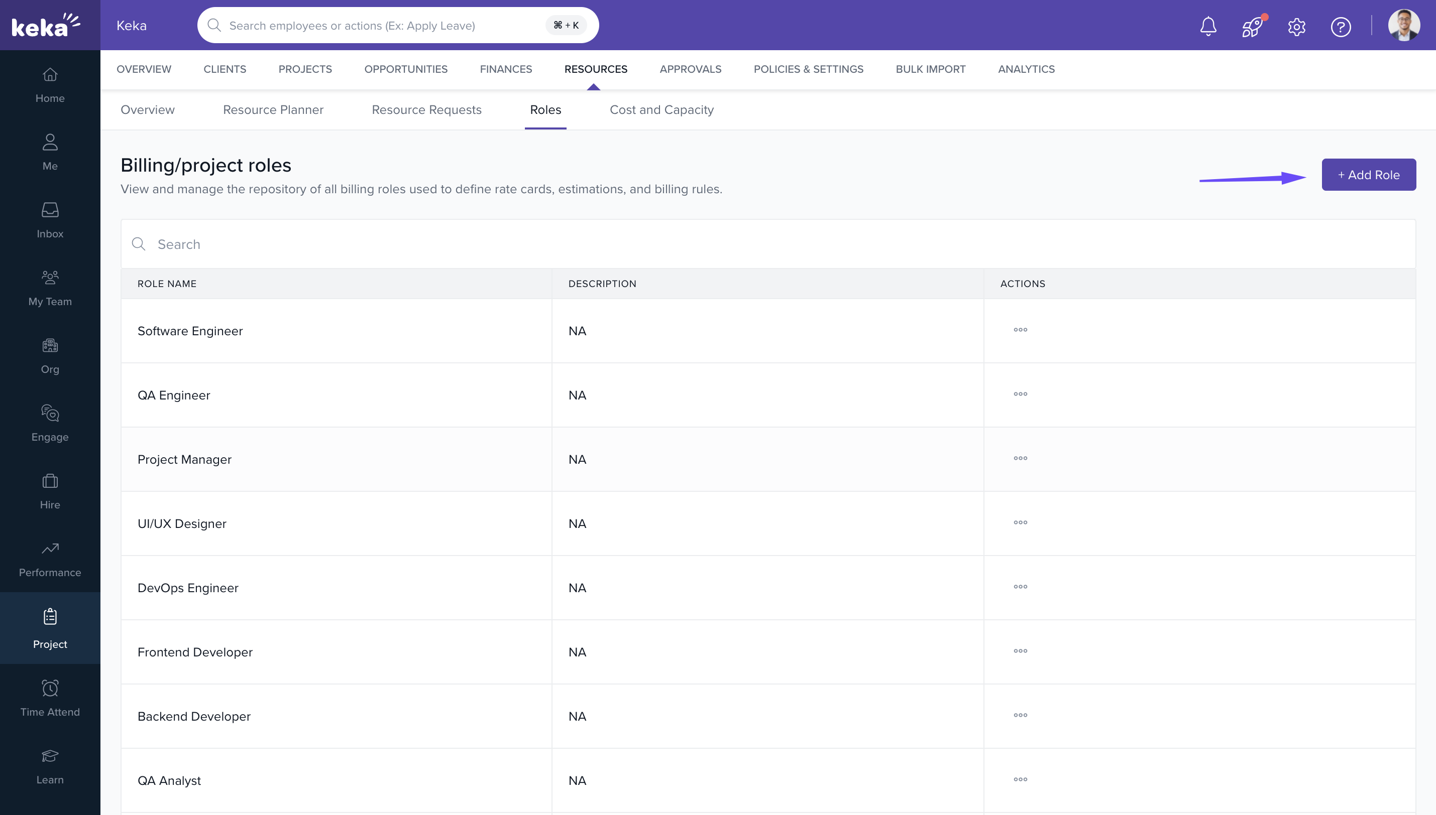 This article explains how to create, edit, and manage billing roles in Keka PSA. These roles serve as the foundation for resource allocation and rate card management. Proper configuration of roles ensures billing consistency across projects and improves invoicing accuracy.