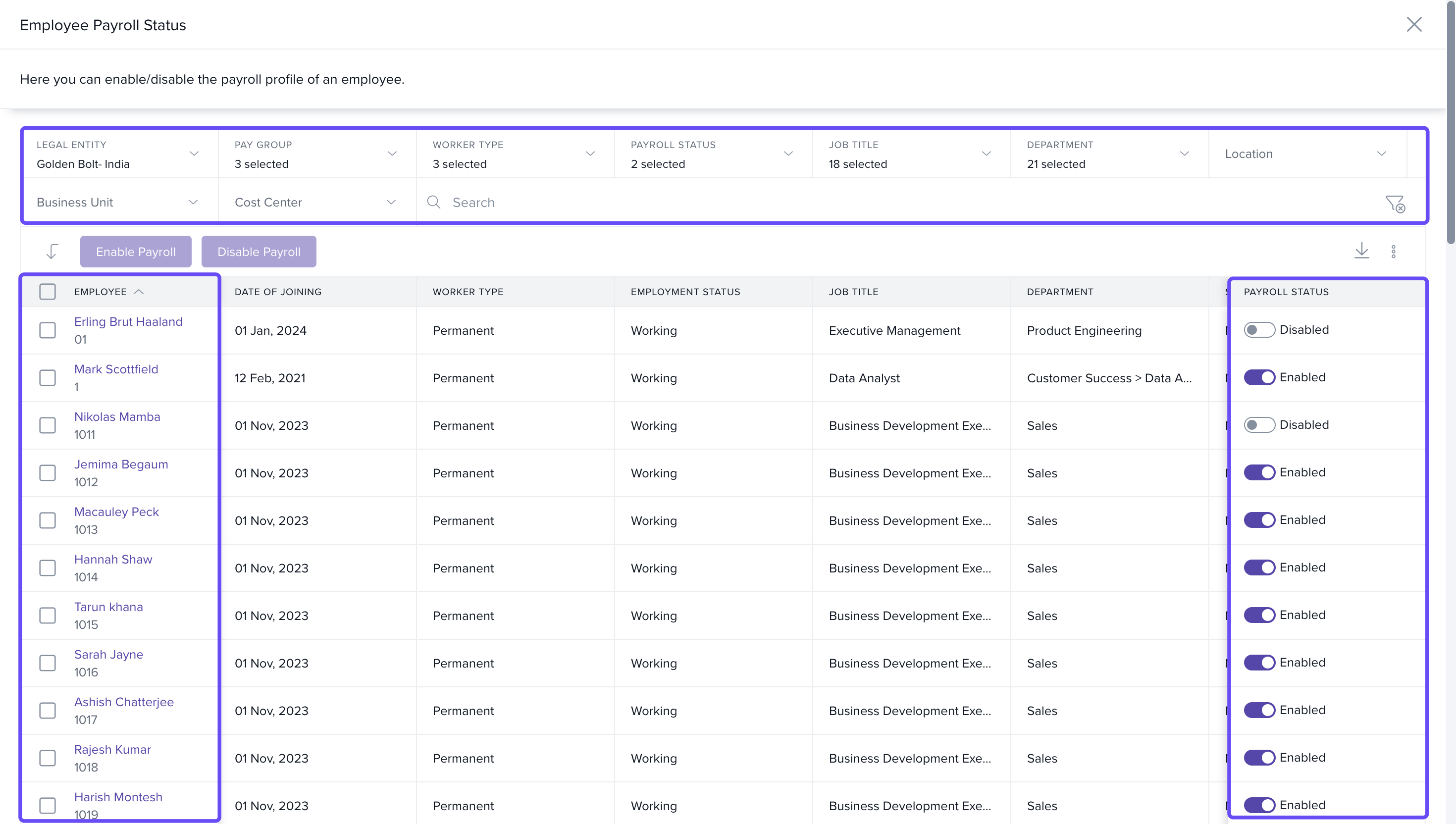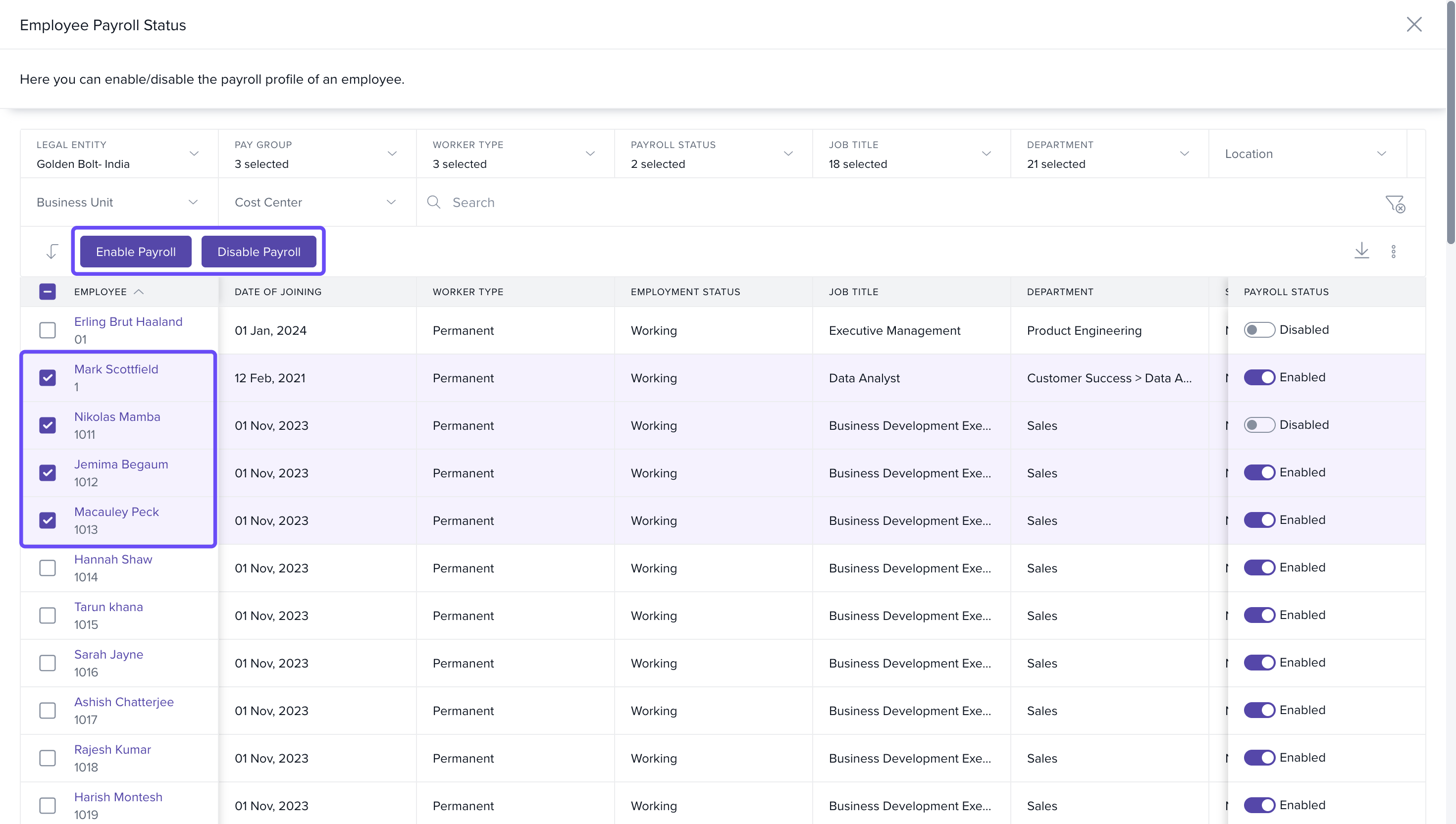 - Disabling or enabling payroll in bulk