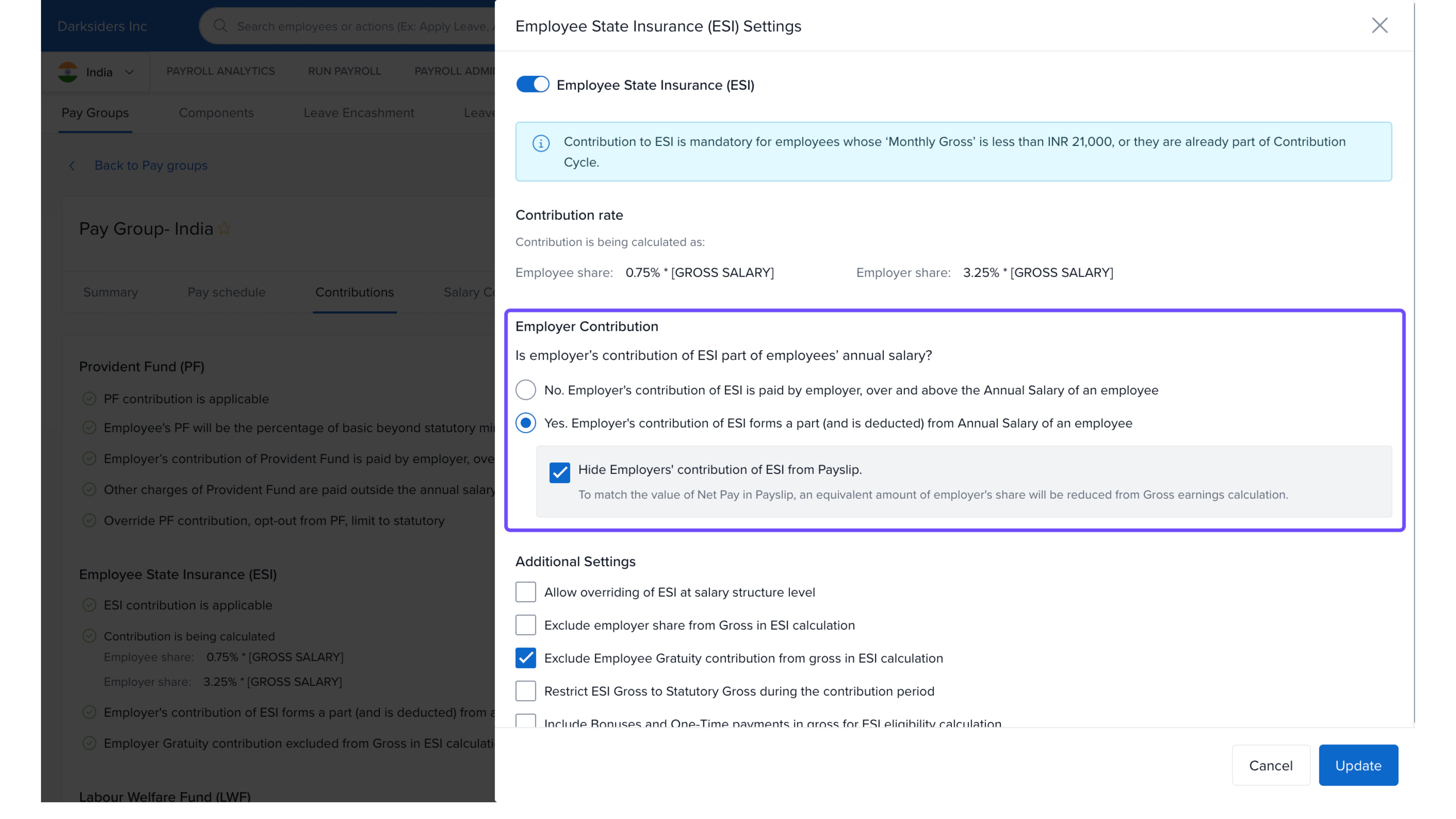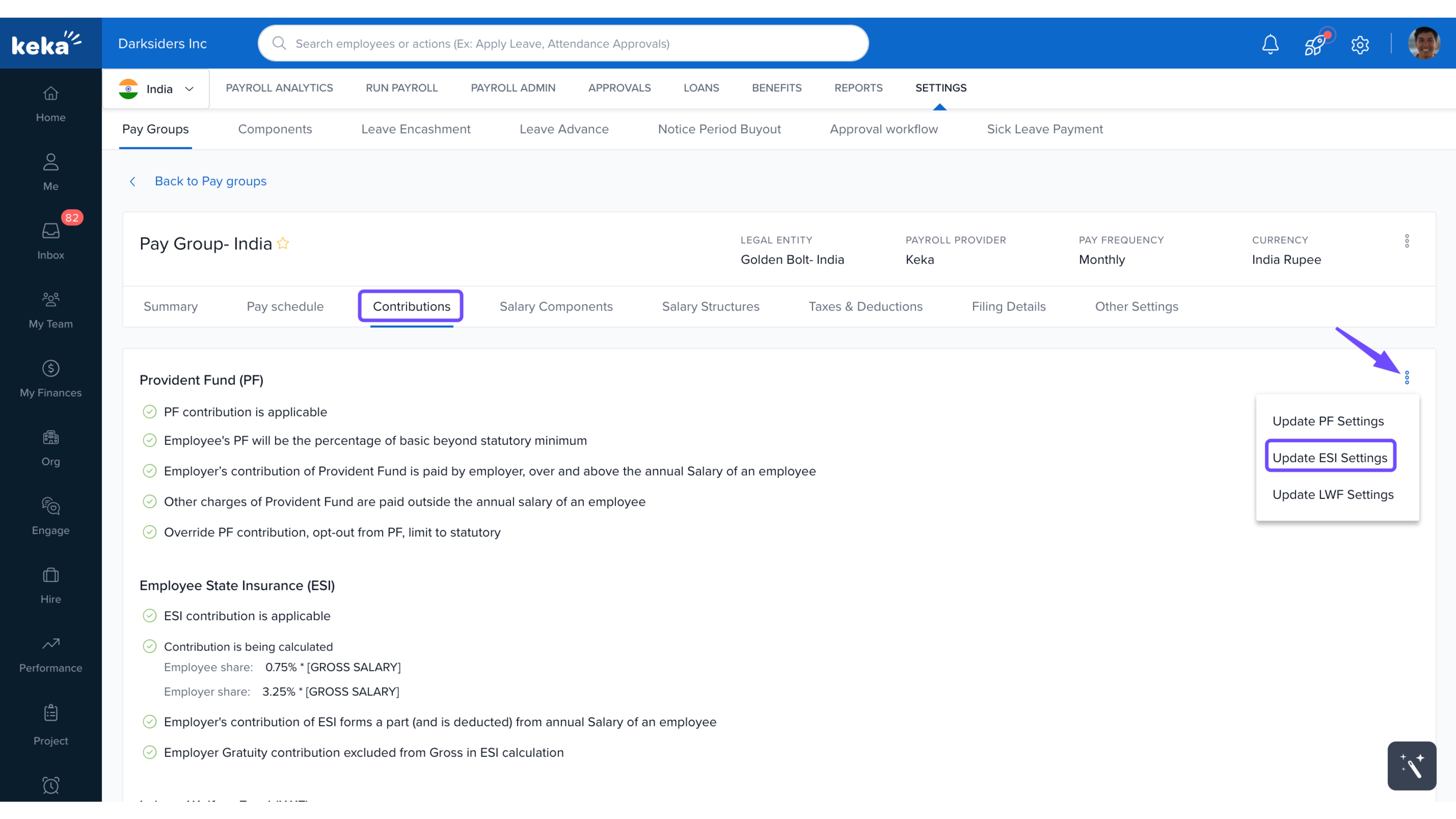 This guide shows you how to manage ESI settings for a specific pay group in Keka, including how to enable or disable ESI, and how to control whether the employer’s contribution is included in the employee’s annual salary or displayed on payslips.