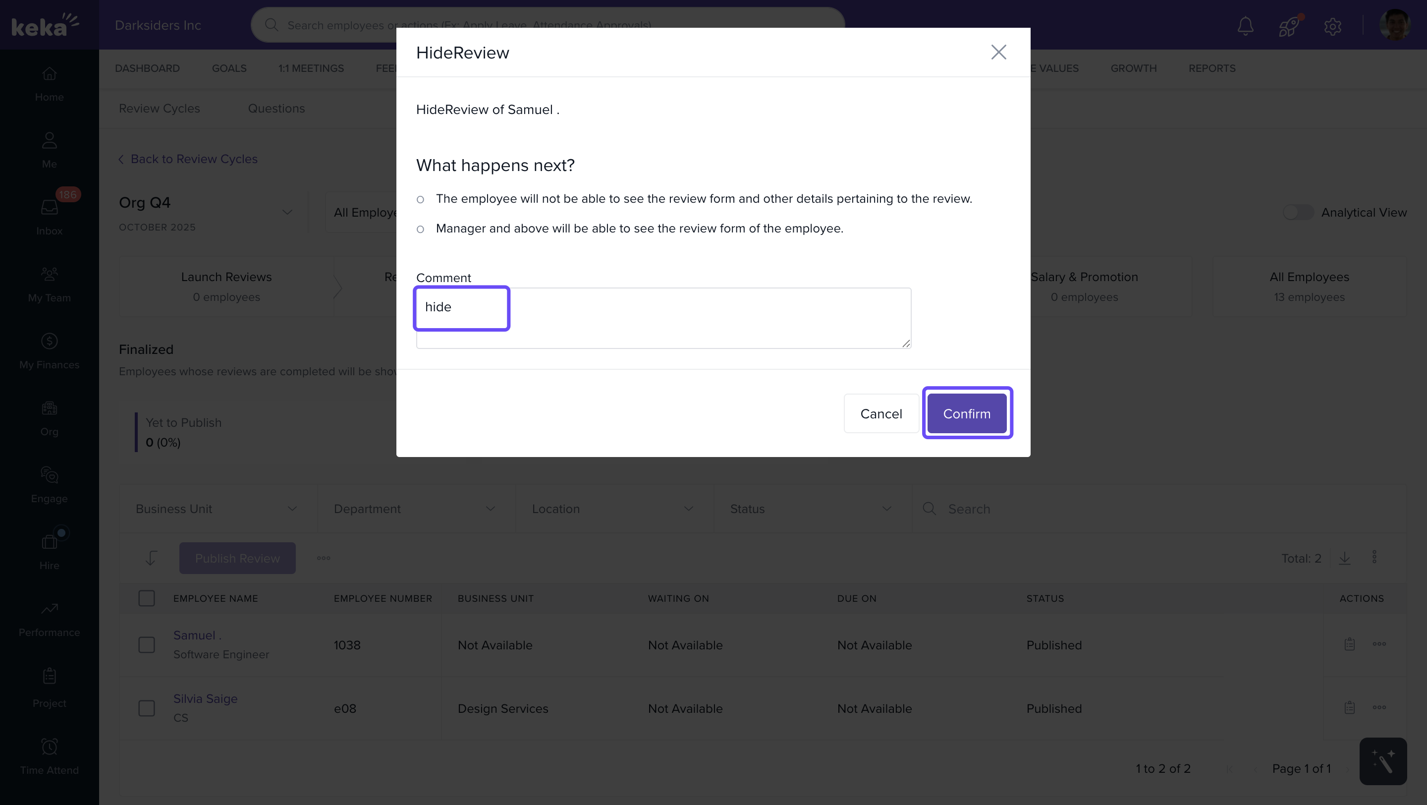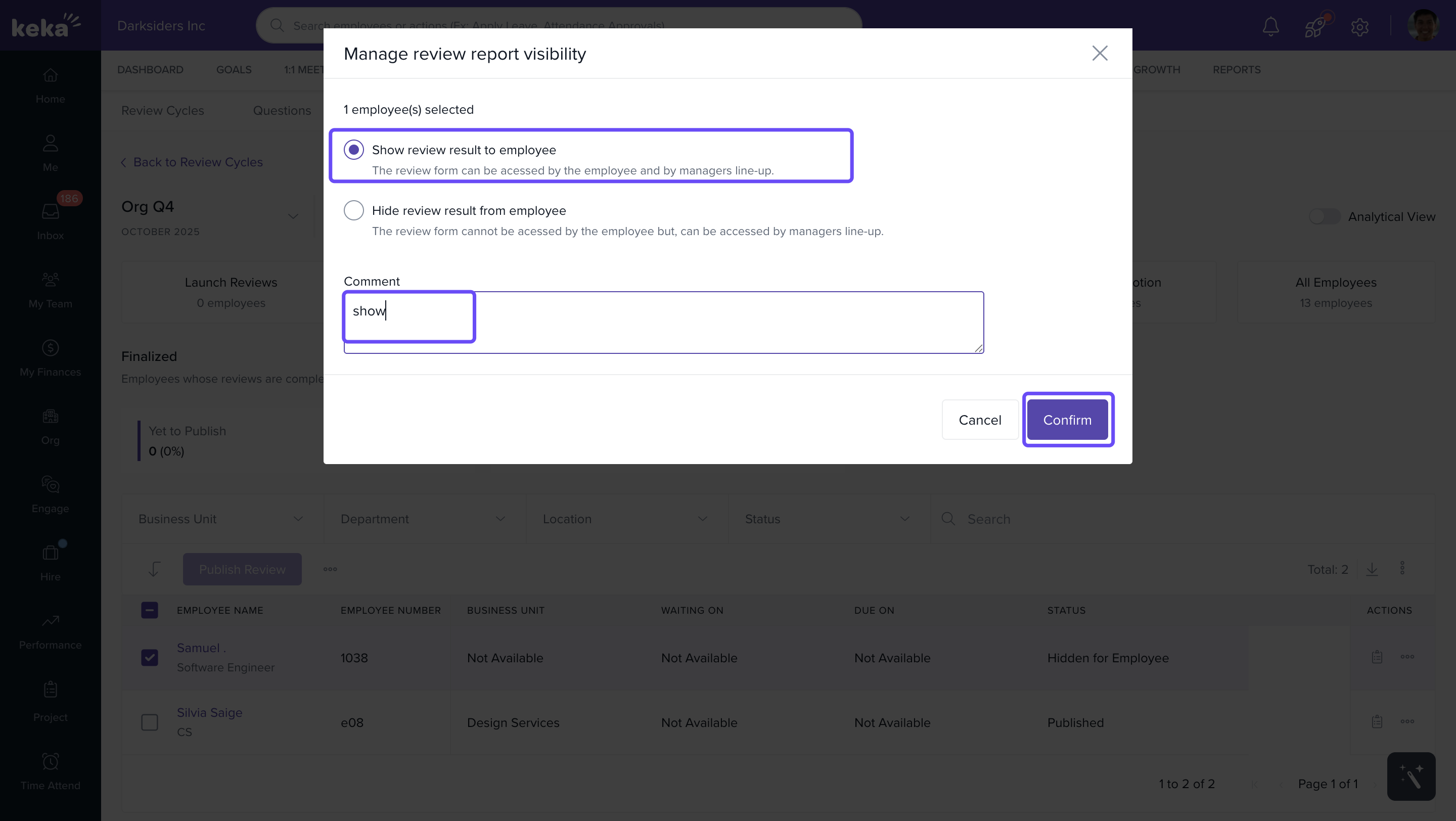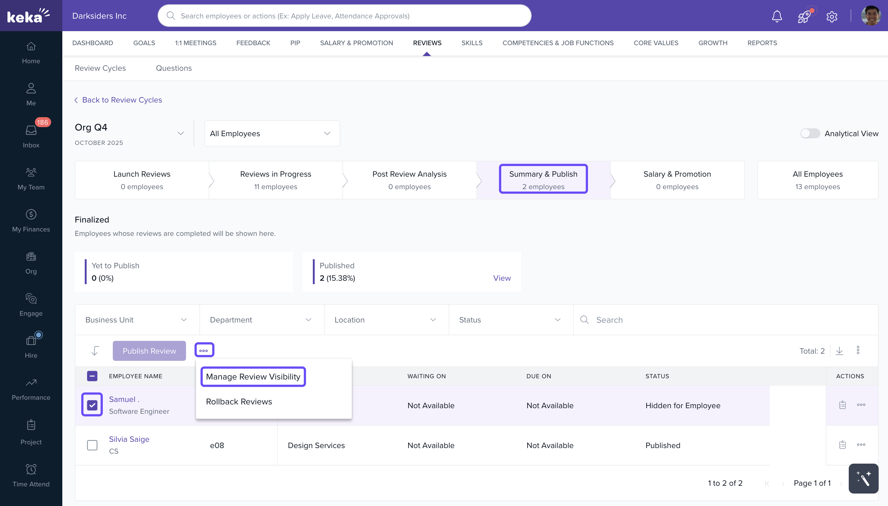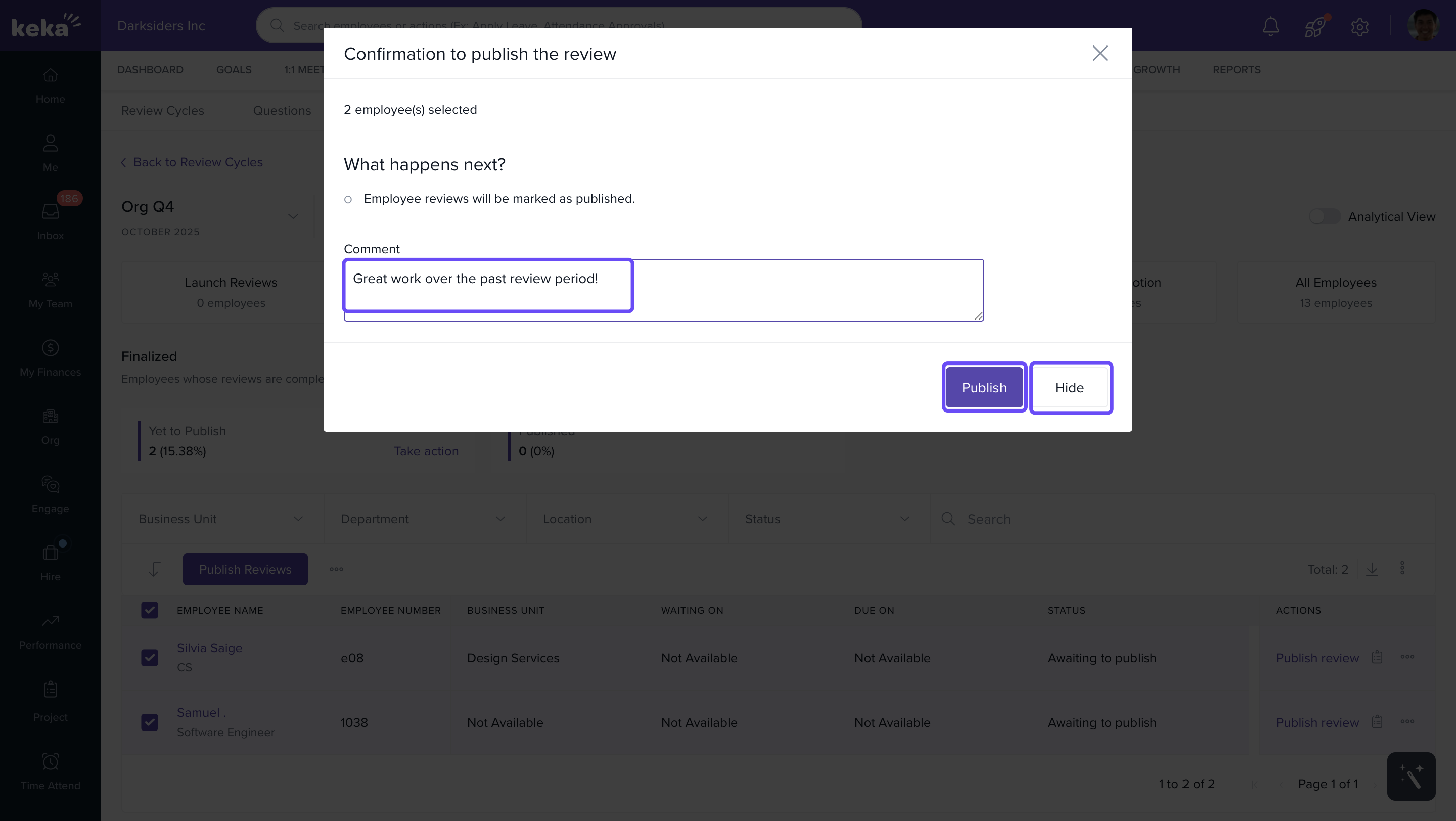 Keka allows you to publish reviews in bulk or manage visibility on an individual basis—even after publishing.
