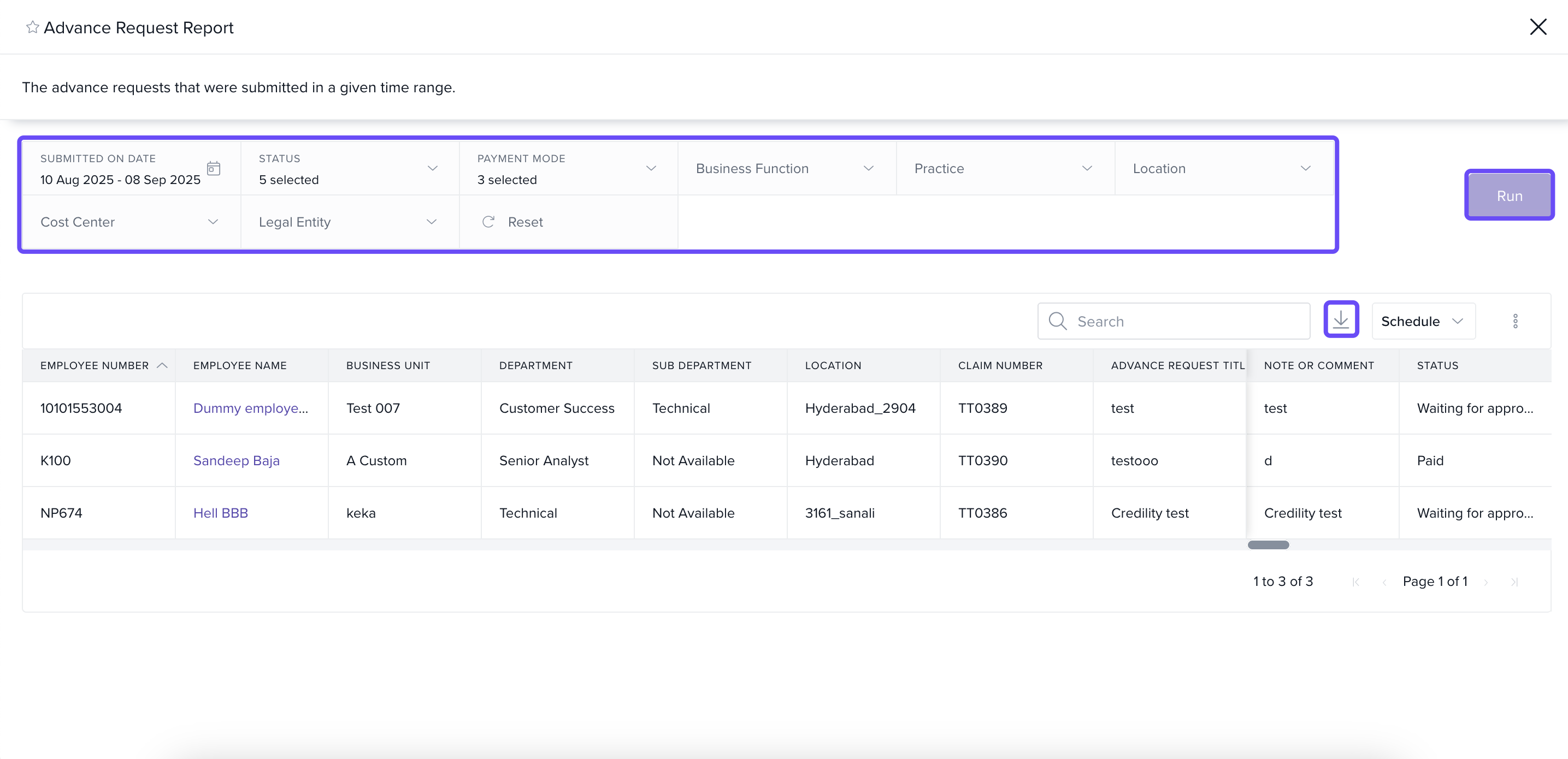 Use filters—Date Range, Business Unit, Department, Location, Status—to narrow results.