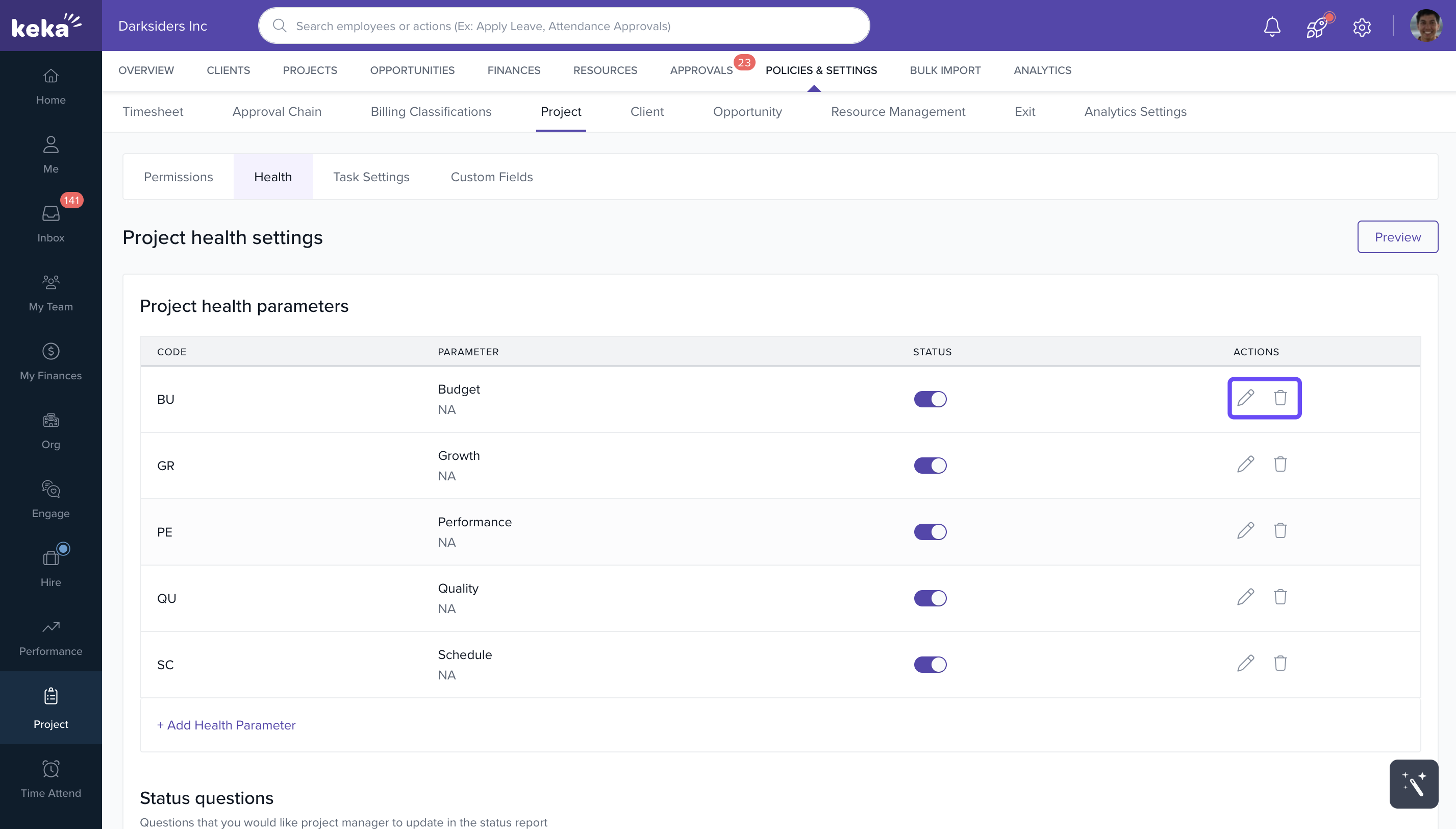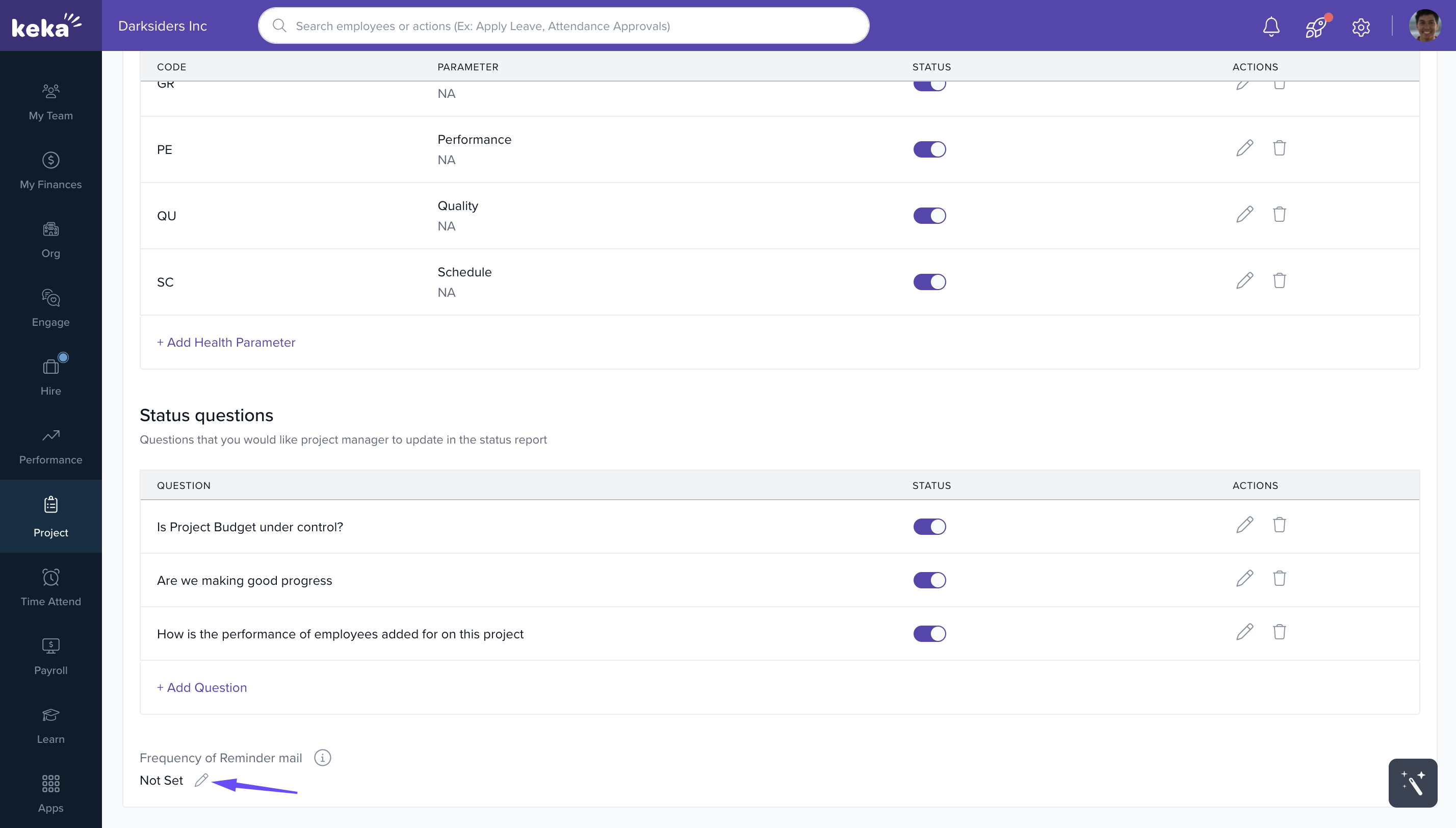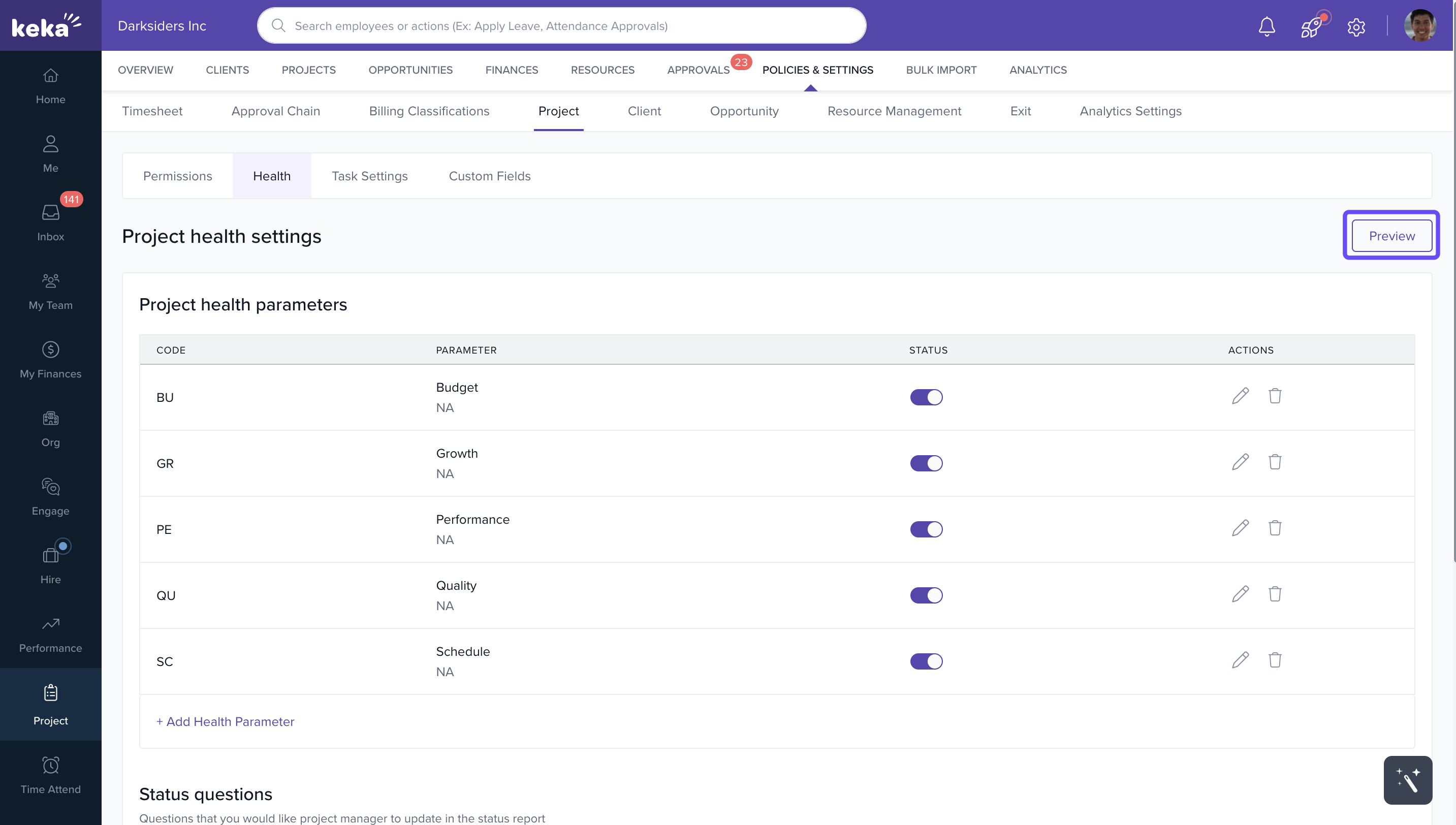 This guide walks you through what project health means, how tracking works, and how to set up parameters and questions within Keka PSA.