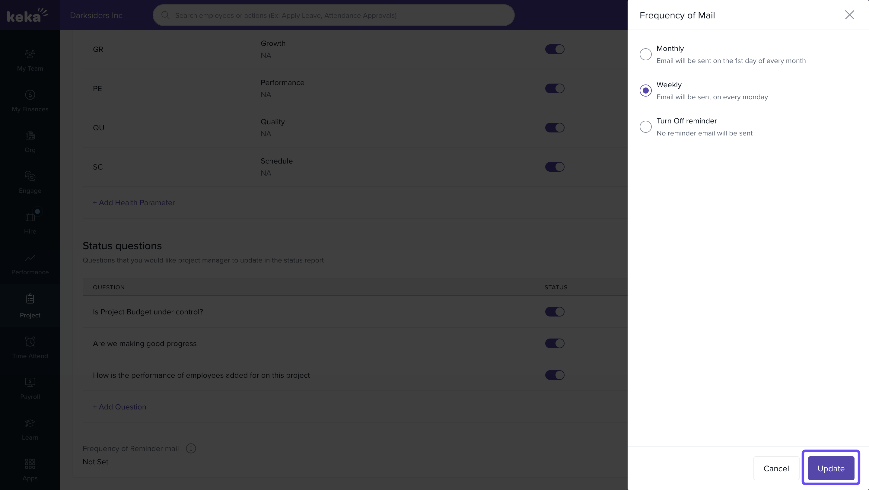 Keka PSA offers a toggle feature to control which parameters actively contribute to project health tracking.