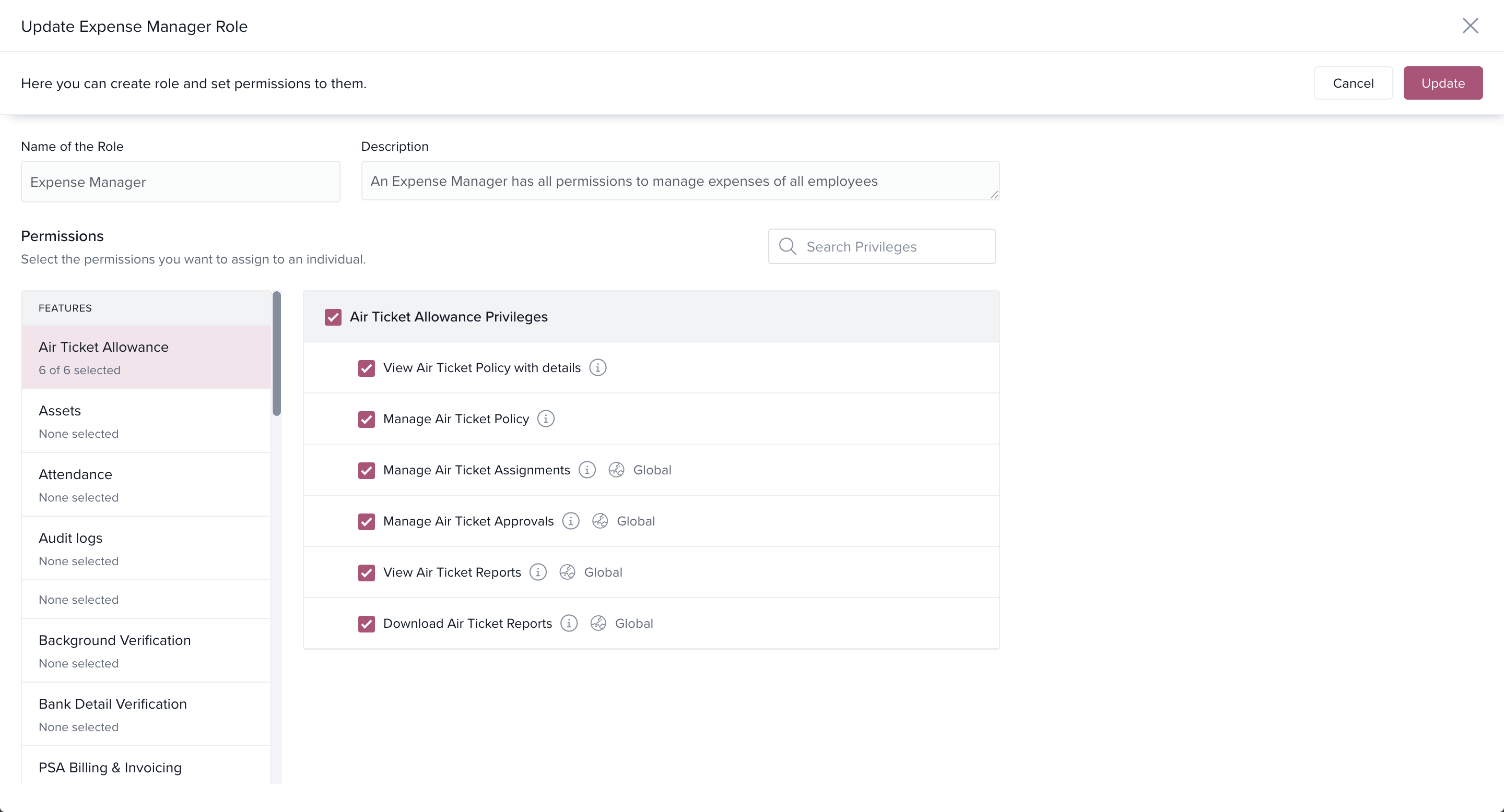 On the role setup page, go to the Permissions section.