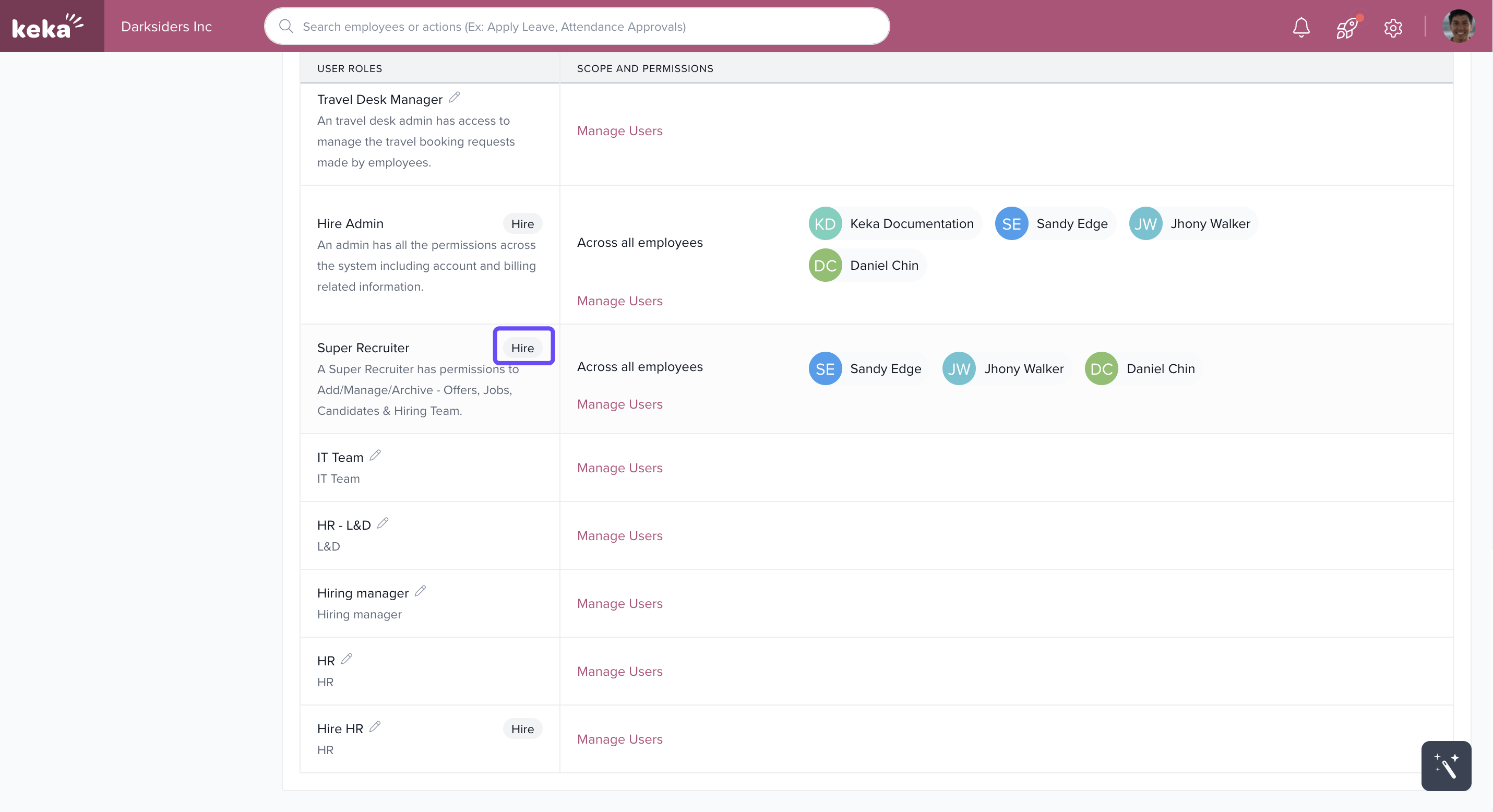 Note: Any role that has active Hire permissions will display a badge indicating it includes Hire Permission access.