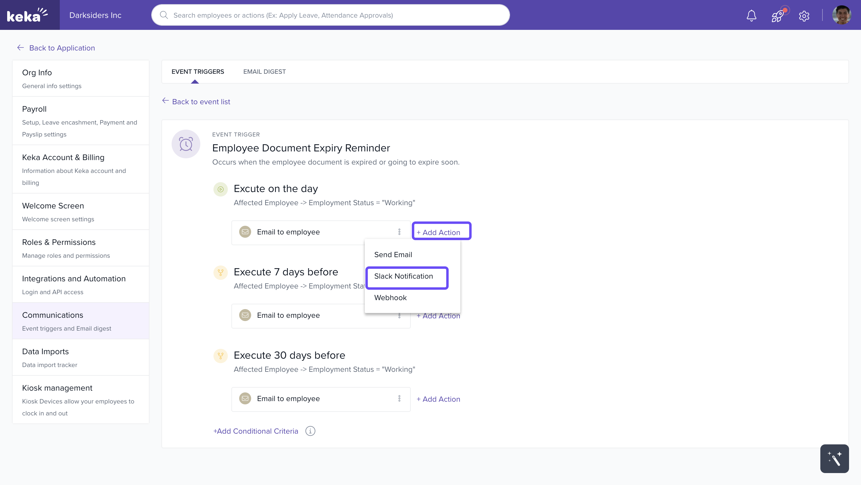 - Under the Documents category, choose Employee Document Expiry Reminder for Slack integration.