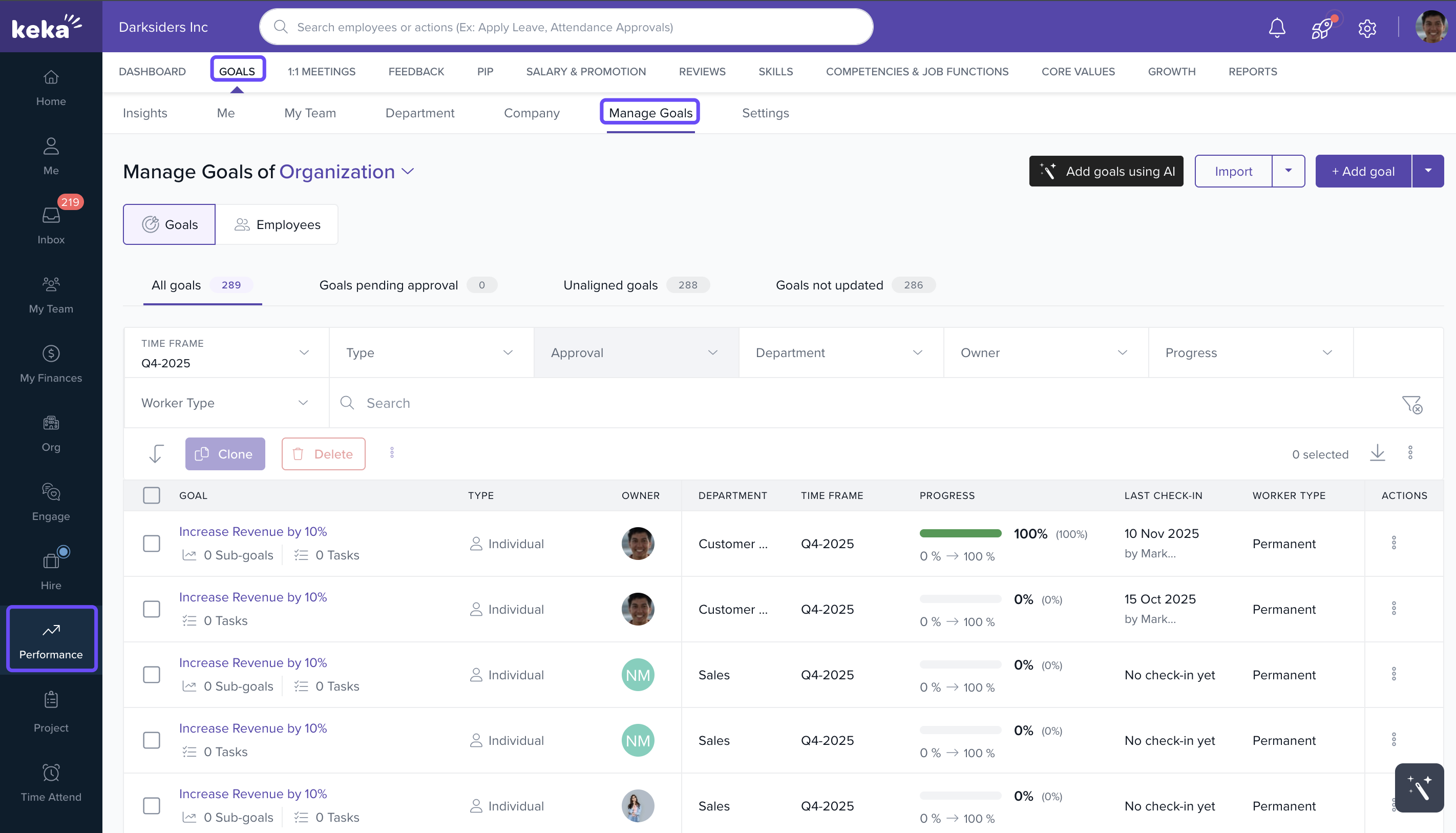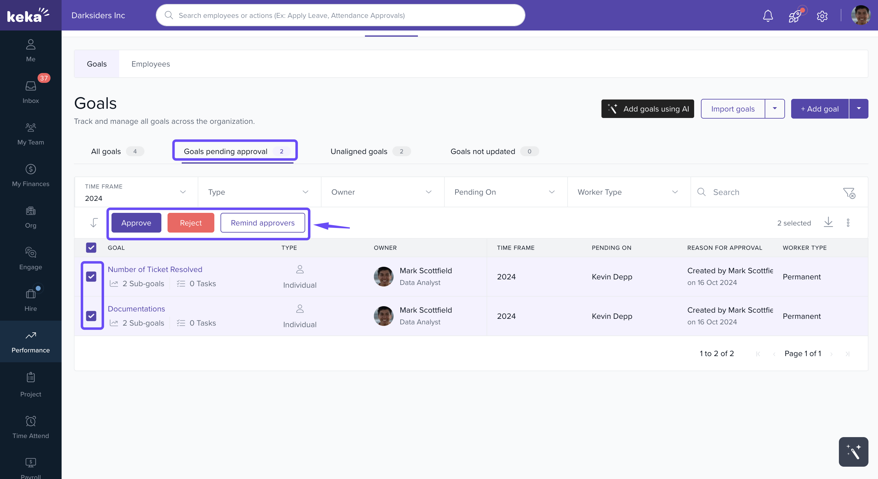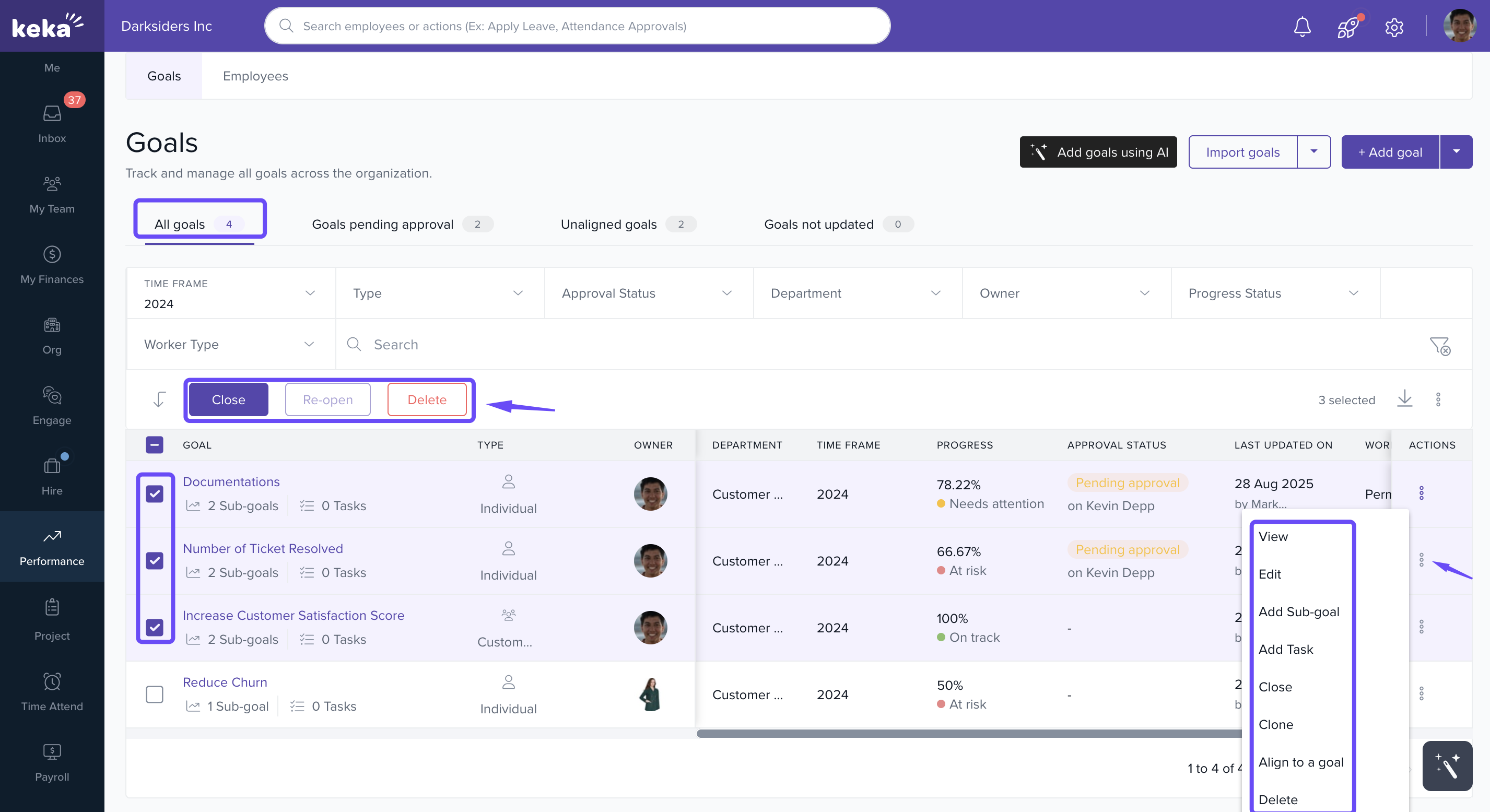 The Manage Goals section in Keka’s Performance module helps HR teams and managers oversee employee goals, manage approvals, and maintain alignment across the organisation.