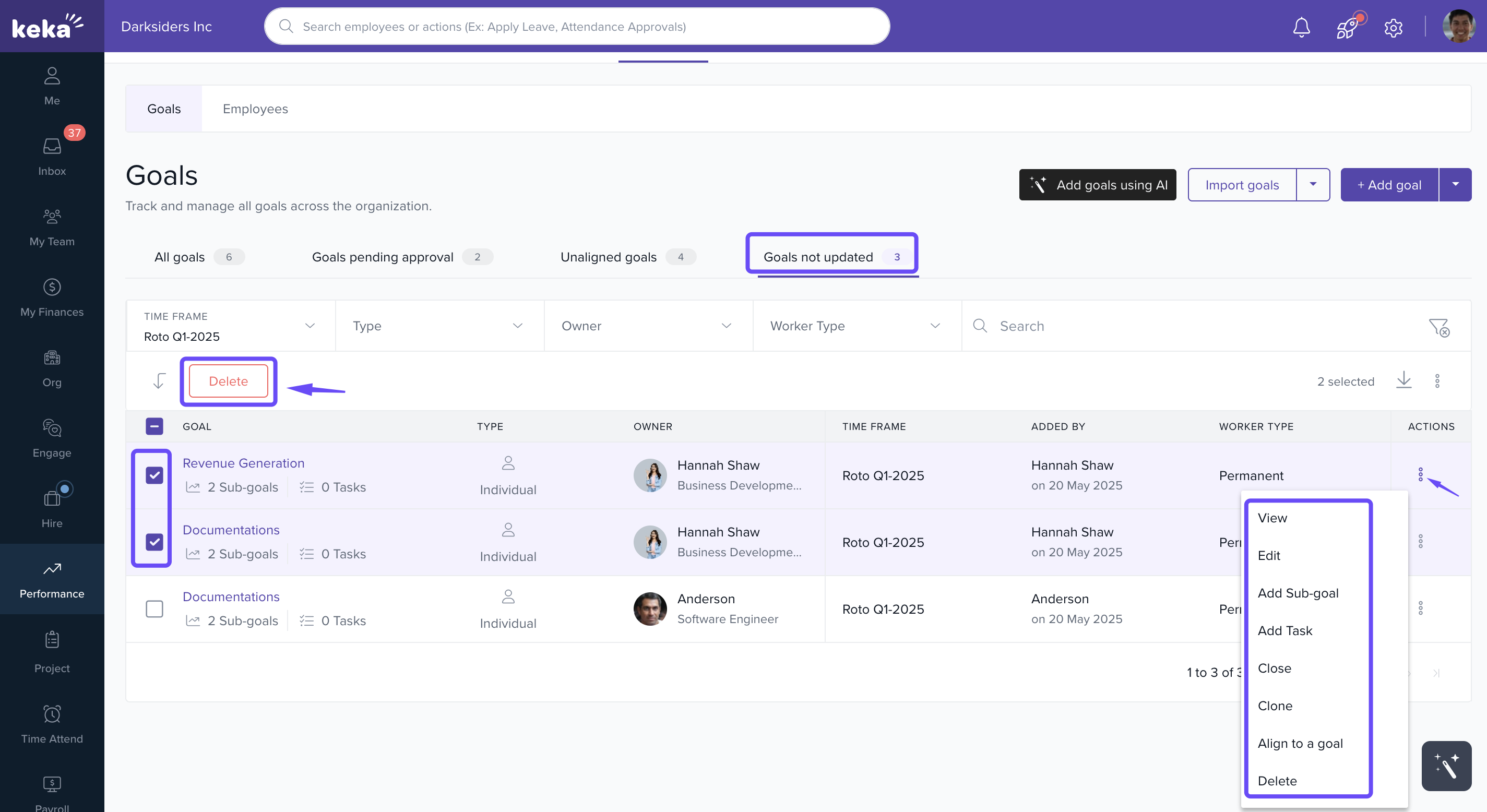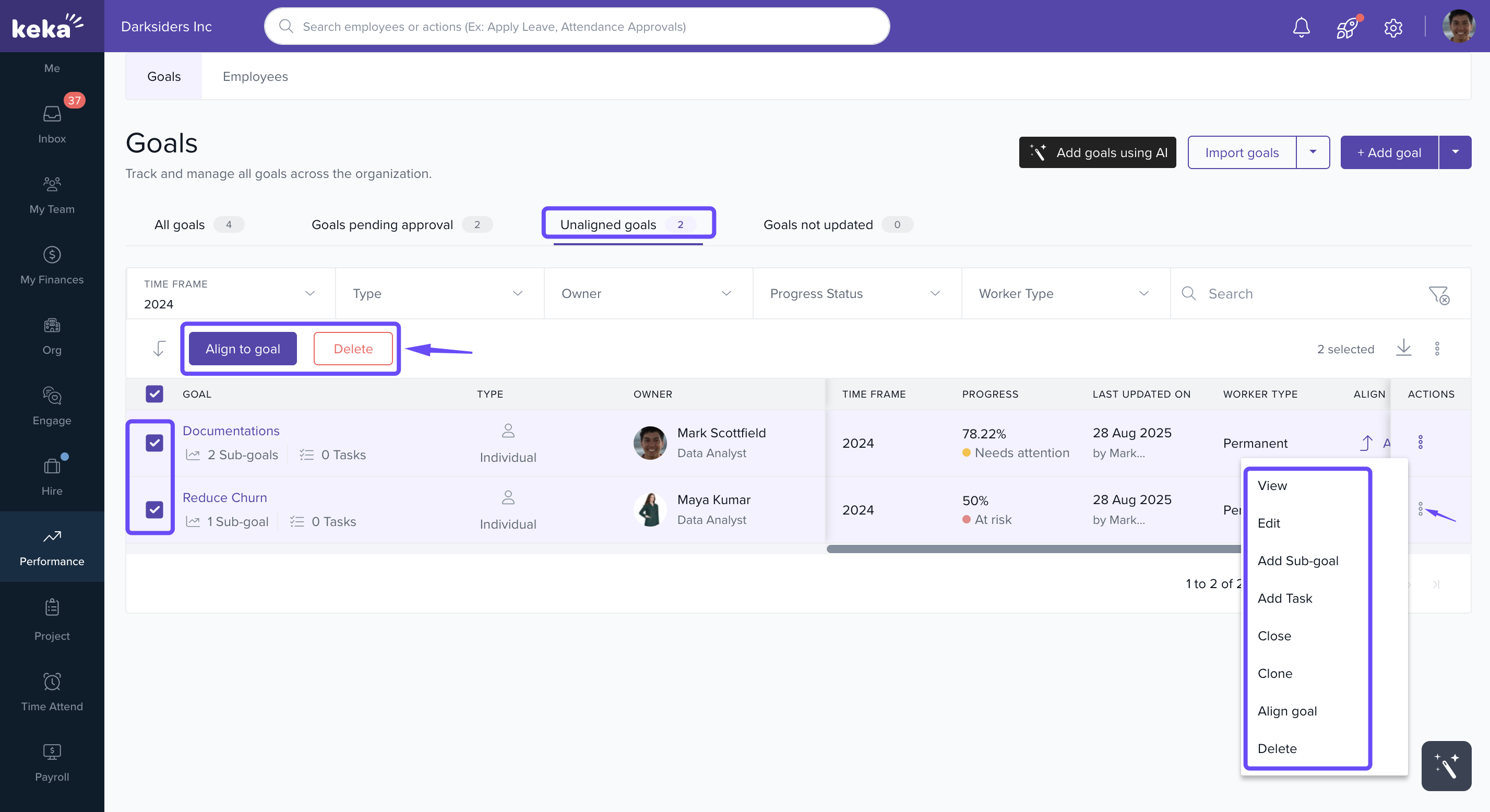 Select multiple goals to align to a KRA or delete in bulk.