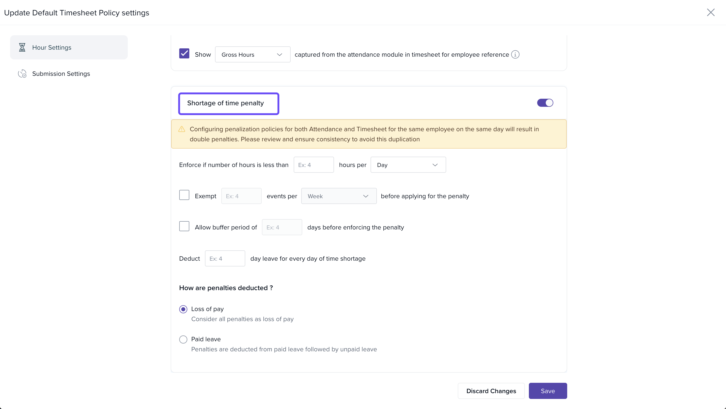 A: Yes. A red bar appears on the affected date in their timesheet with a tooltip showing penalty details.