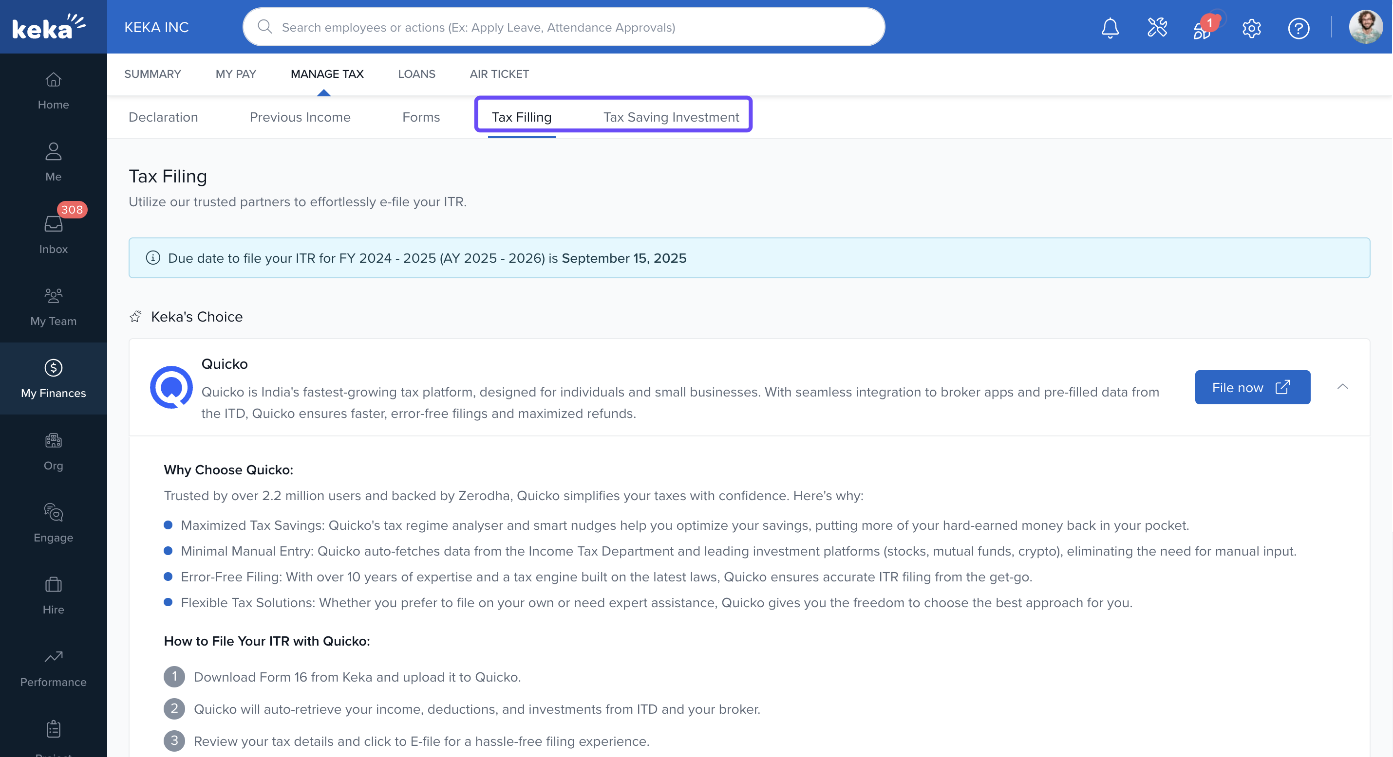 The last two tabs — Tax Filing and Tax Saving Investment — offer services powered by ClearTax to help you e-file your income tax return and explore investment options.