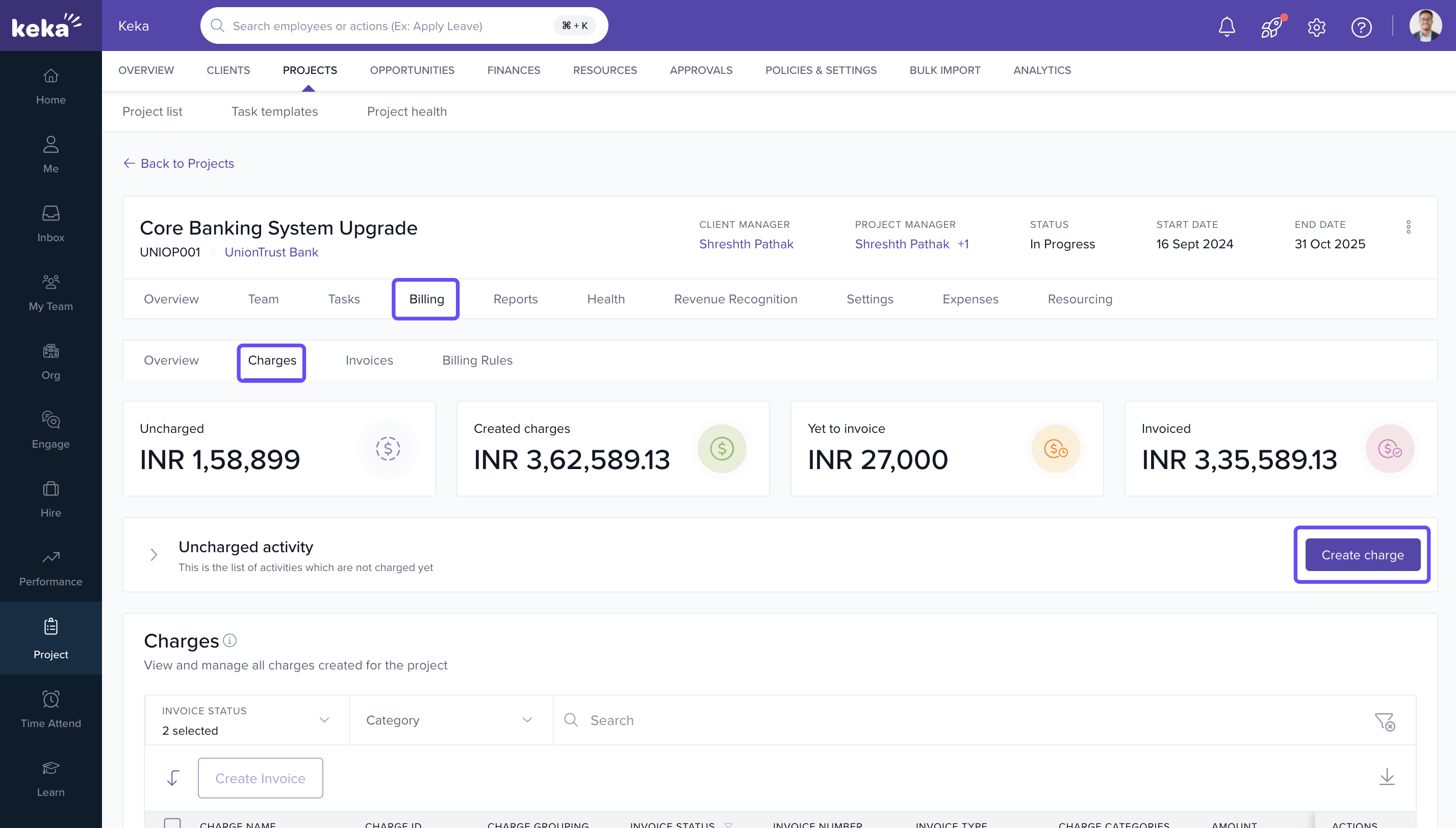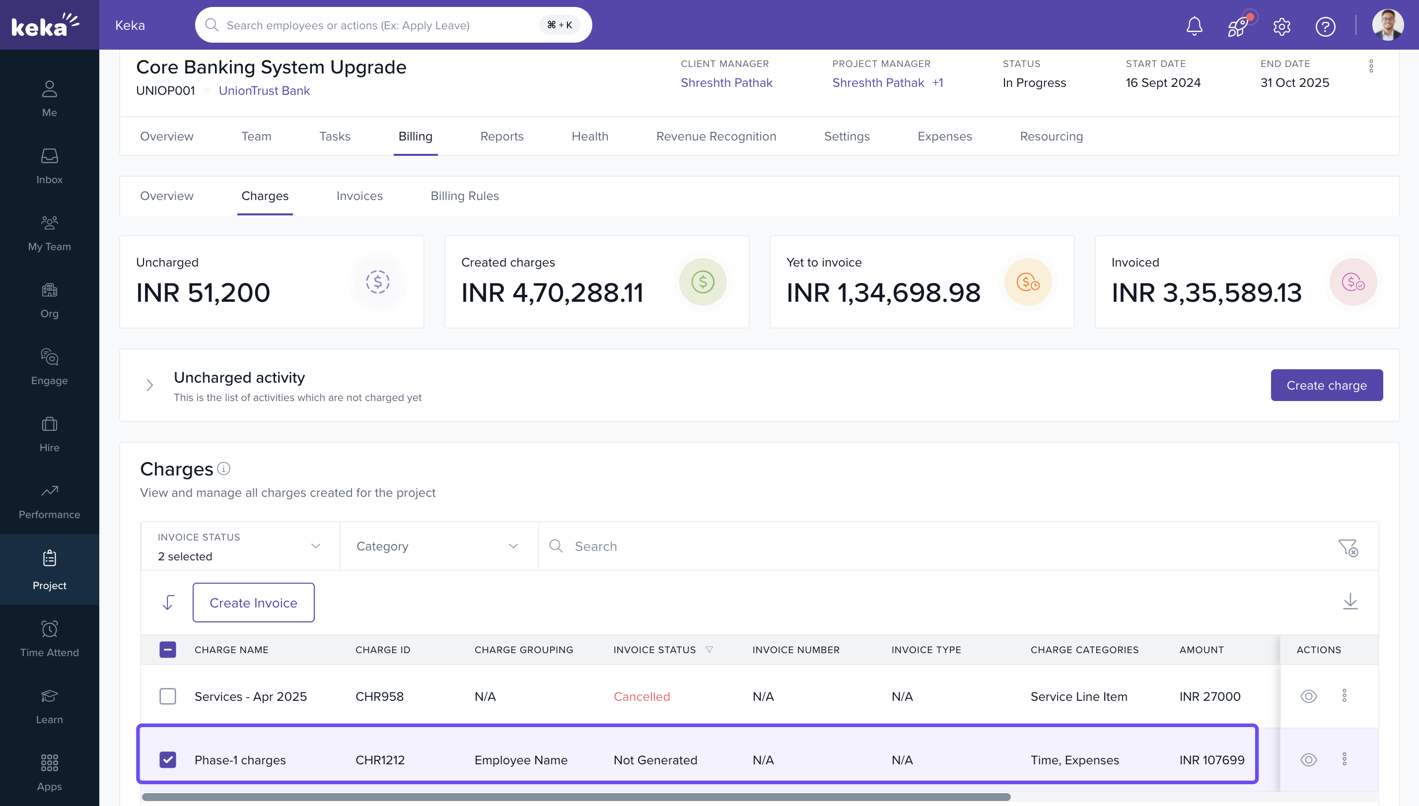 Keka PSA's Charges Creation feature allows project managers and finance teams to create billable charges prior to invoice generation. This ensures billing accuracy, improves client transparency, and aligns invoice items with actual services rendered. Charges can be reviewed, tracked, and approved before being converted into invoices, reducing errors and enabling financial clarity.