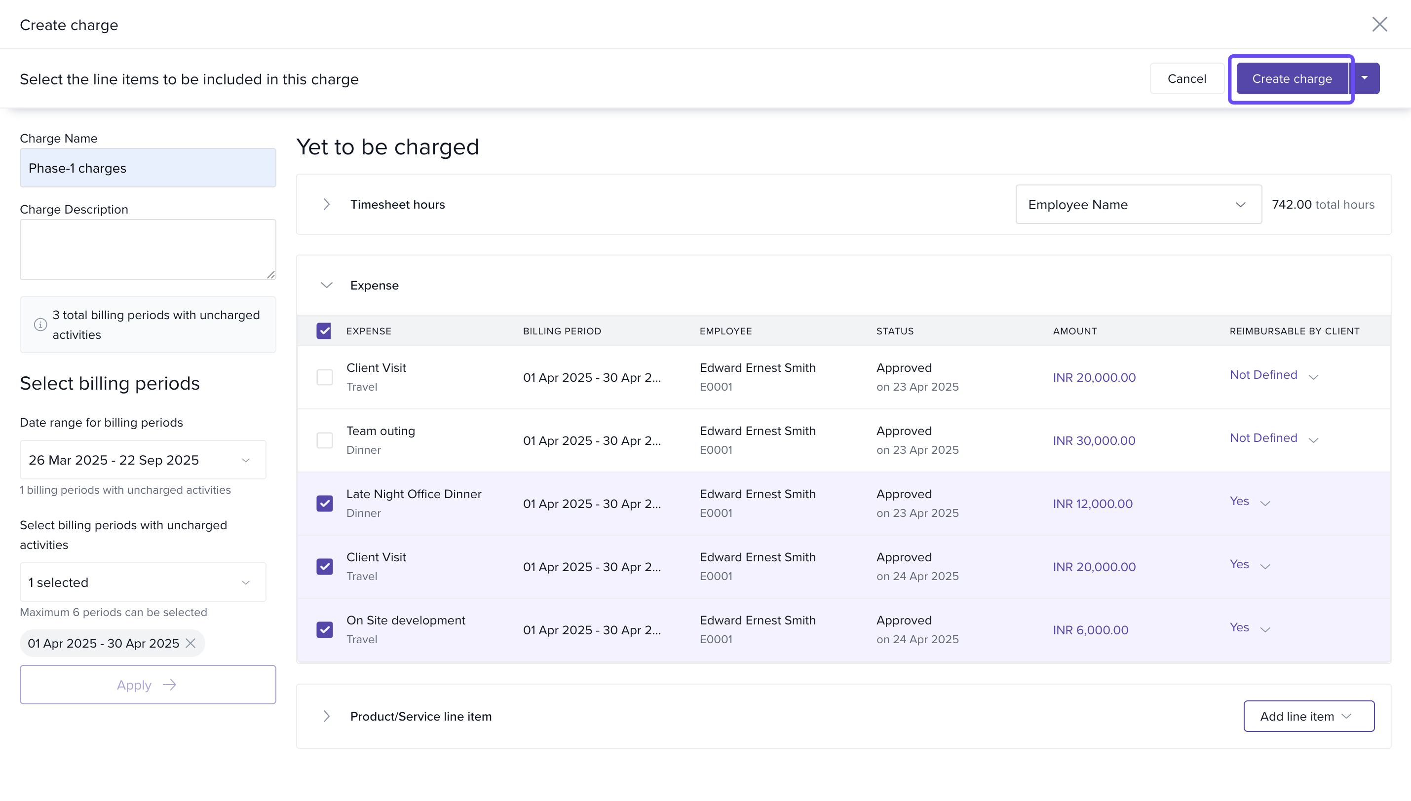 - Charges Grid: Lists all charges created under the project for easy tracking and approval