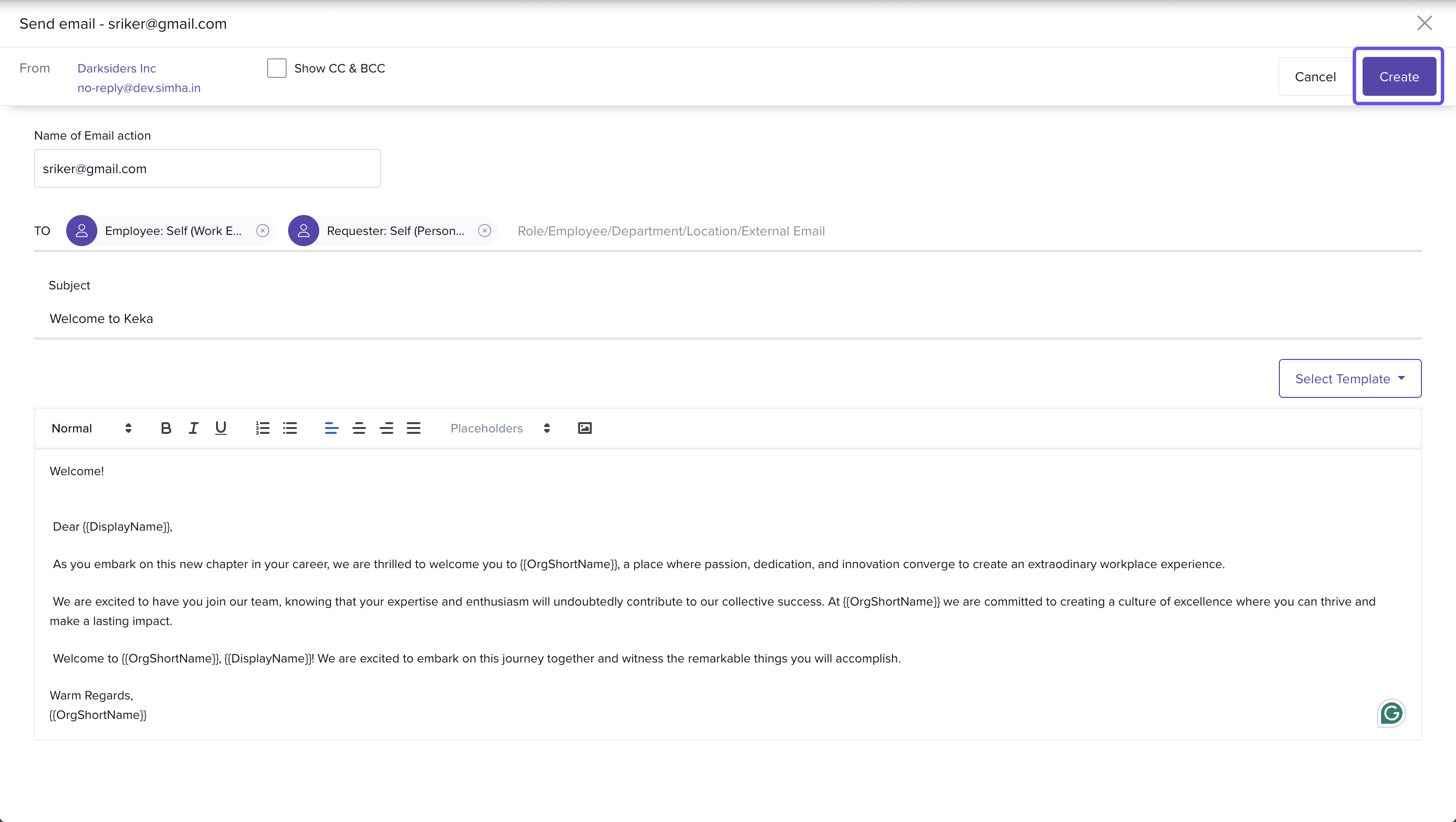 Click Add Action and select Send Email from the dropdown to automatically send a welcome email to the new hire and/or other recipients.