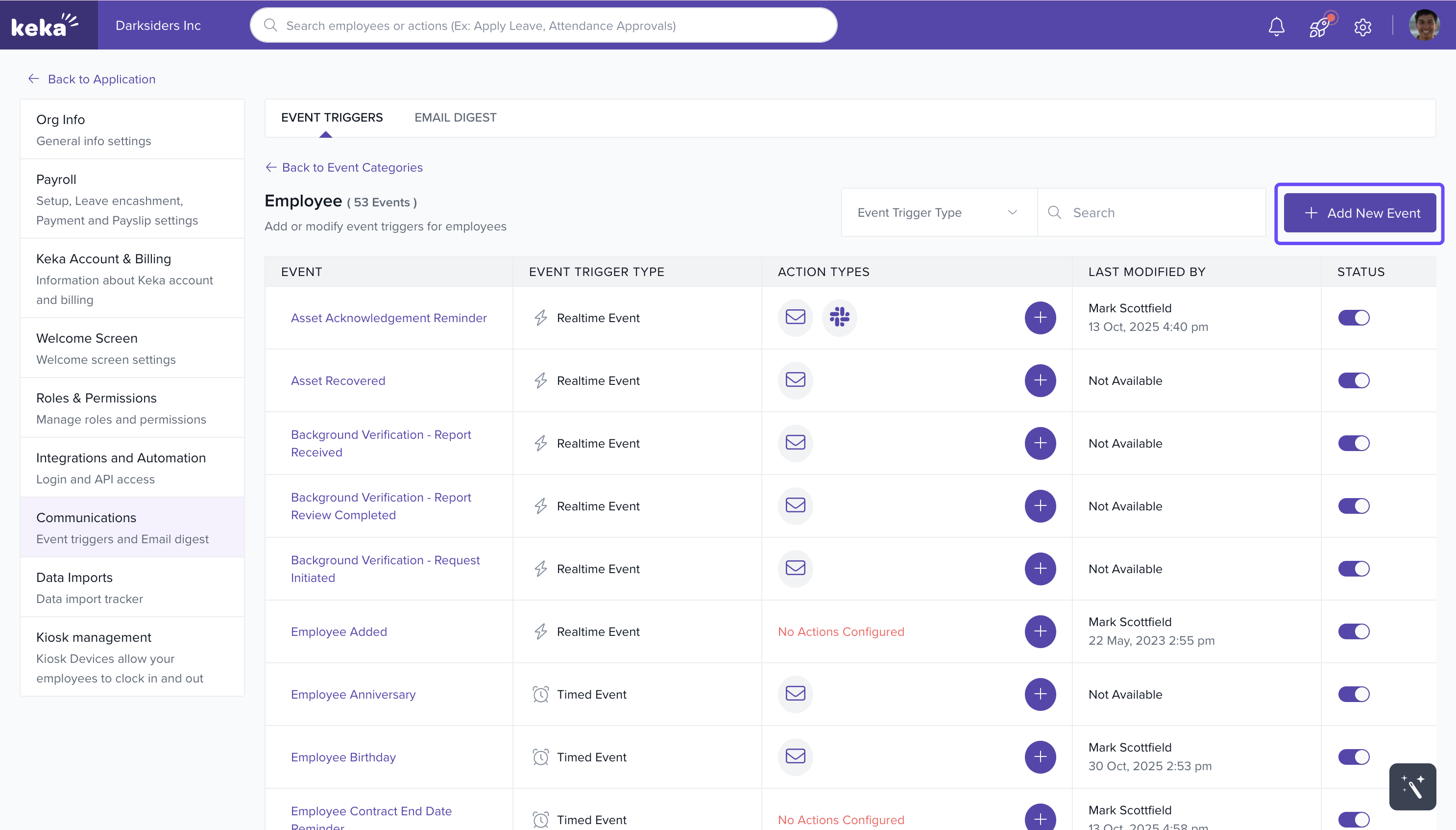 Note: In this example, we are enabling an email notification for a new joinee. In the same way, you can configure similar triggers for other events and sections in Keka.