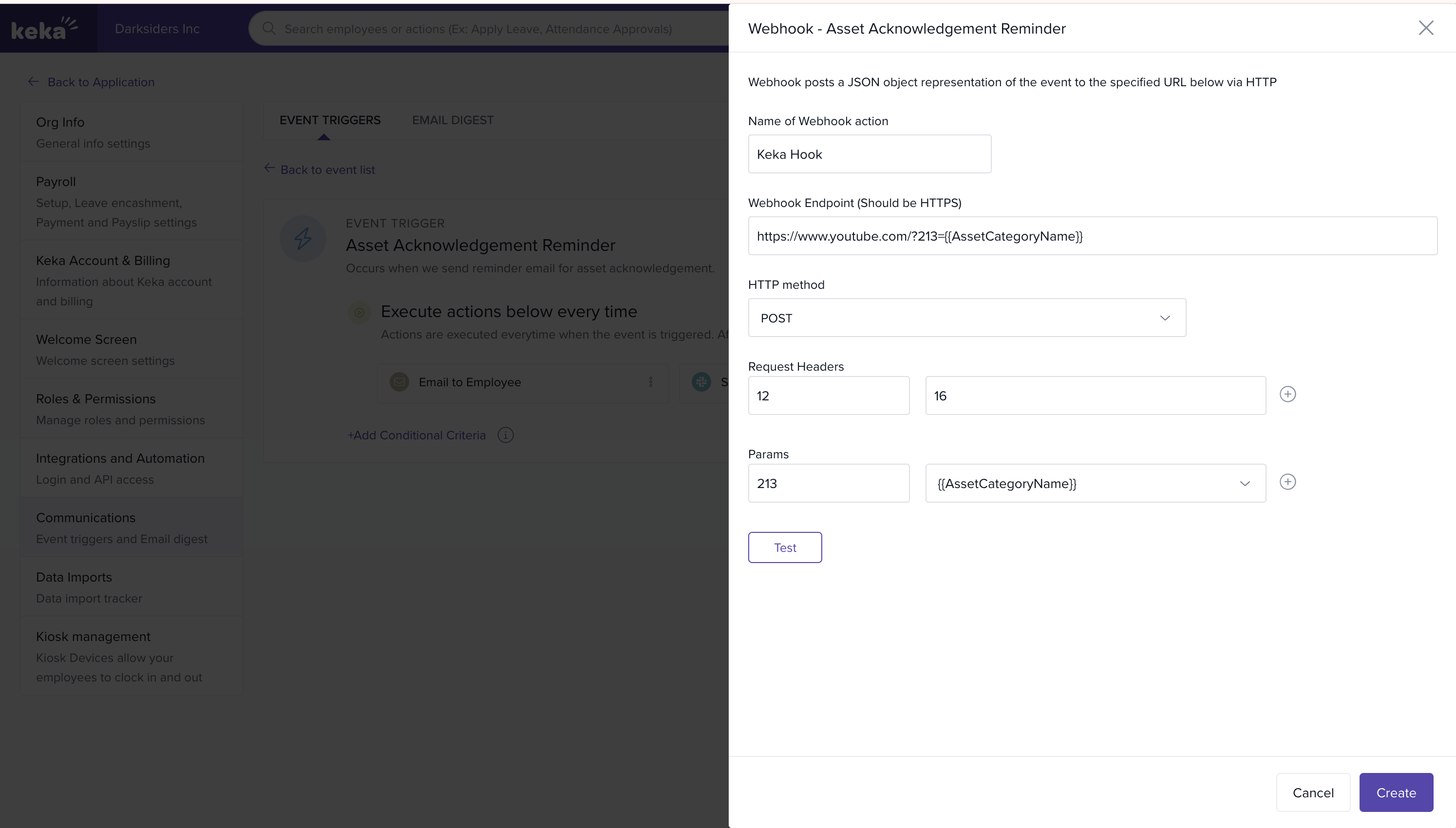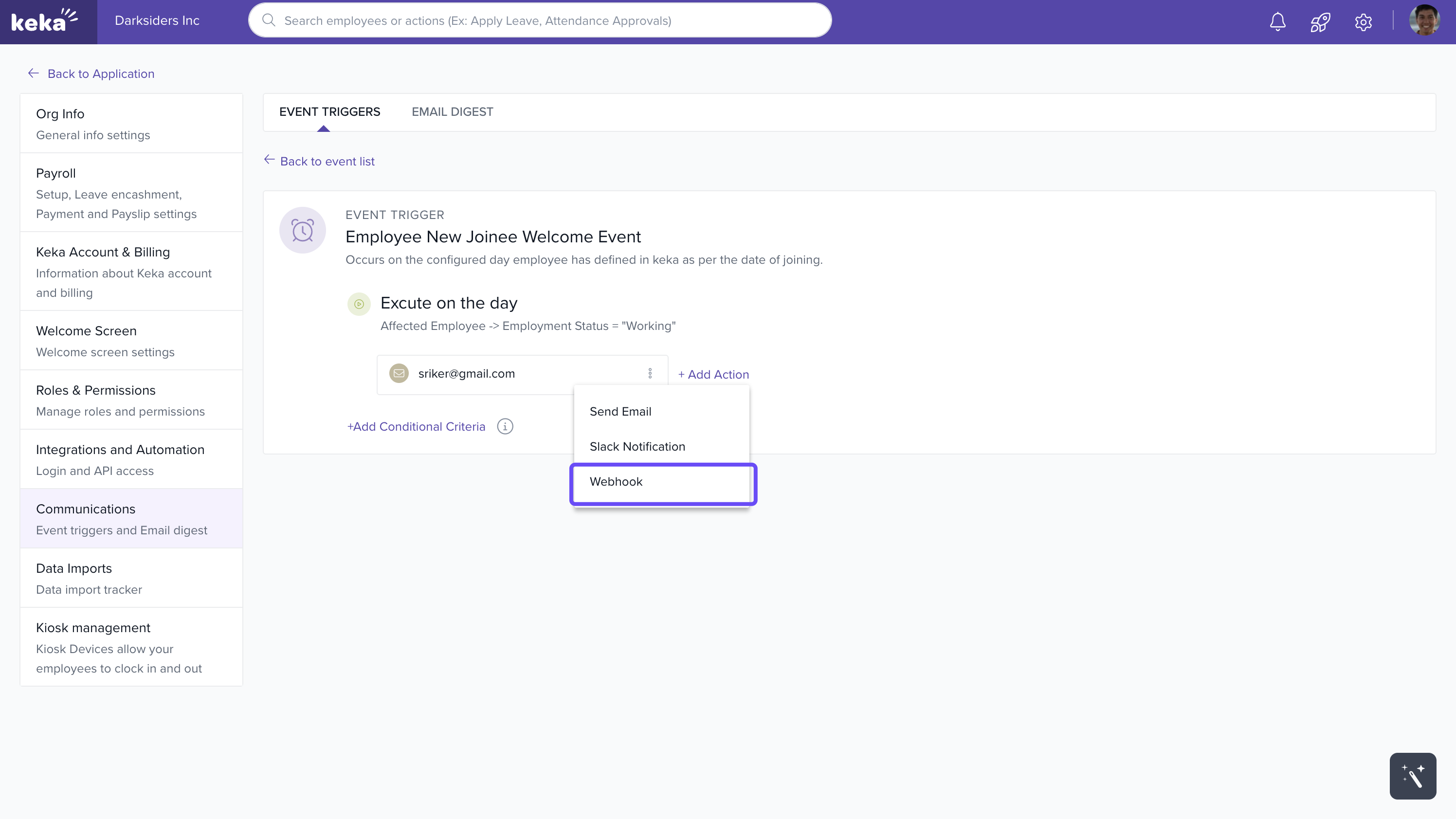 Webhooks allow you to push real-time event data from Keka to external applications (for example, internal tools, integration middleware, or notification systems). You can add a webhook action to the same event where you configured an email, or to any other event trigger.