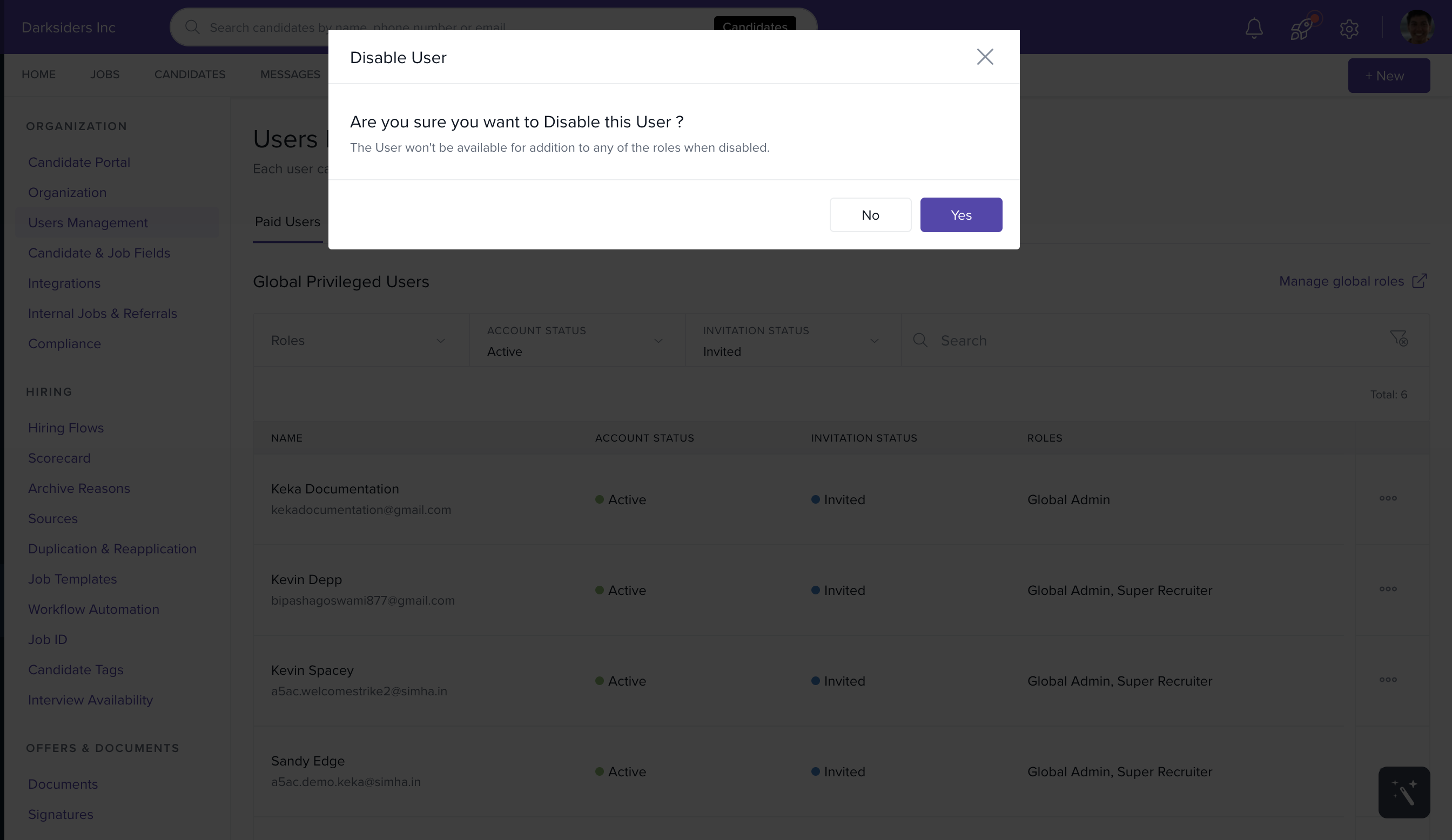 - Fill the Click on Yes on the pop-up box that appears to disable the user's login from the Keka Hire portal.