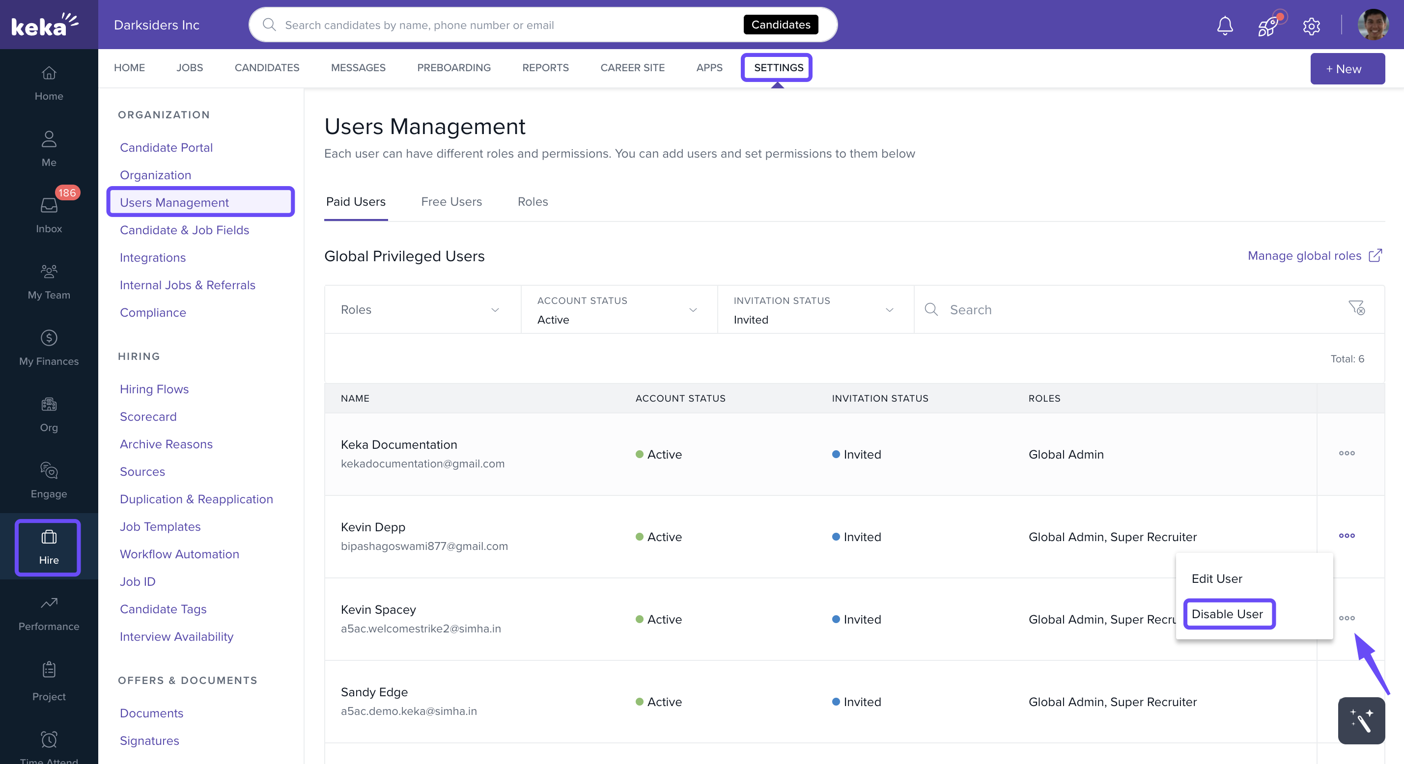 Several users are usually involved in the hiring process including the HR and hiring teams, hiring managers, interviewers, and more. These users can be managed from the Keka Hire portal by the admins. You may have to remove a particular user from Keka Hire if they are no longer involved in the hiring process or if they have left the organization.
