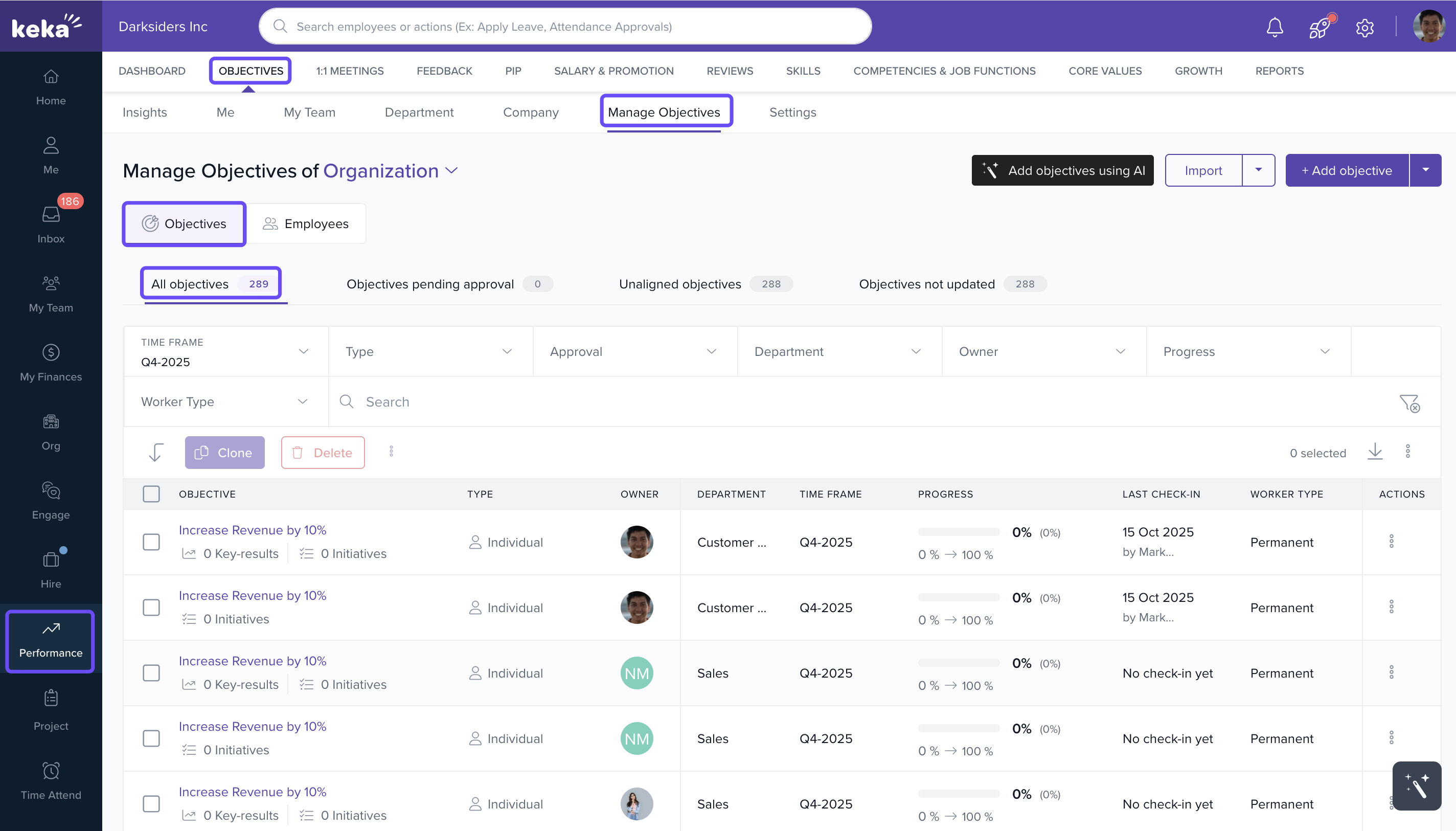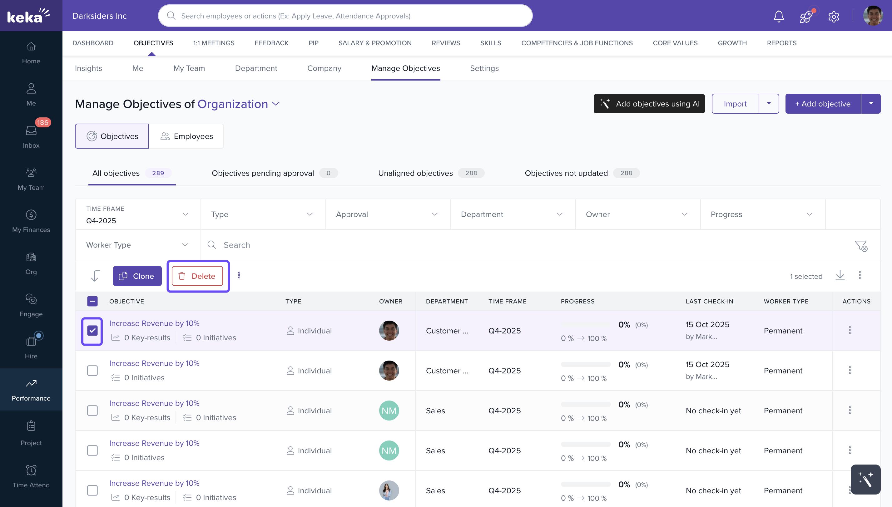 Keka allows Performance Admins to delete multiple goals at once for easier management.