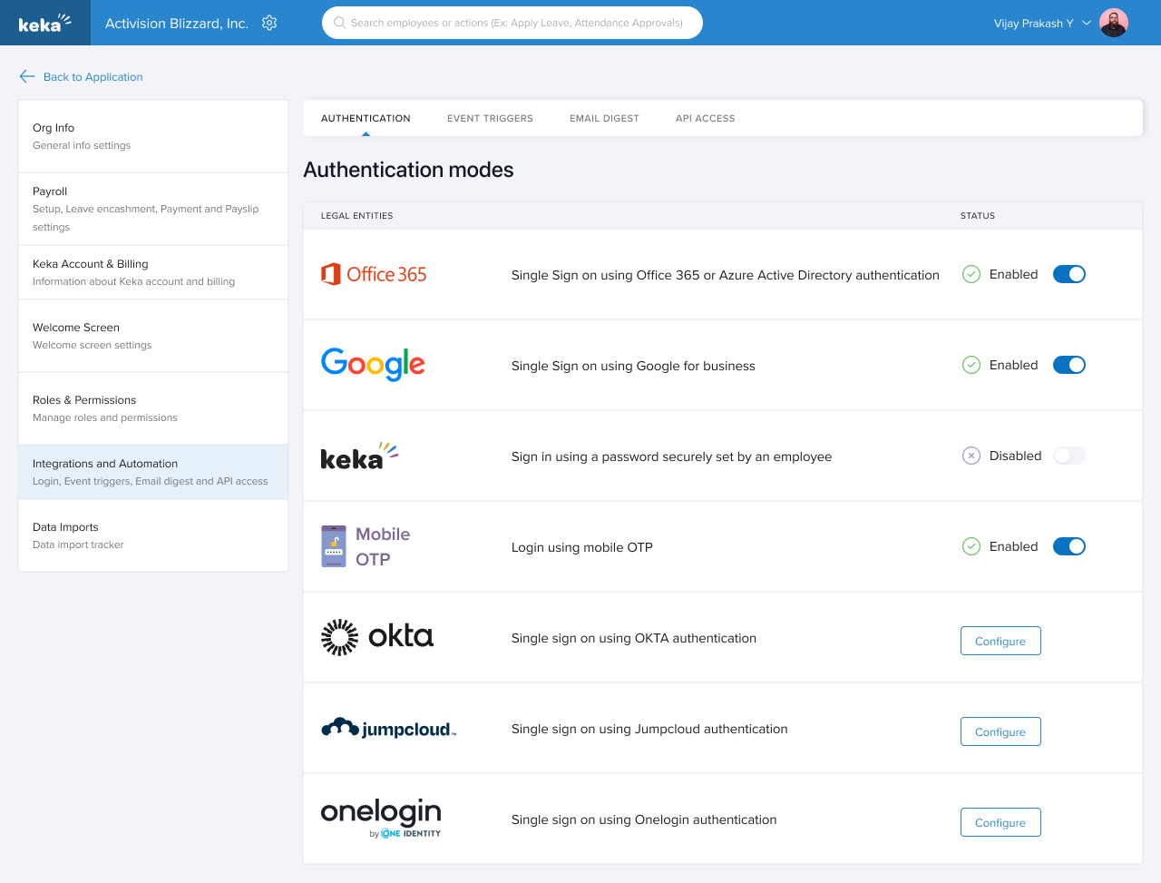 In Keka, go to Settings > Integrations & Automation > Authentication.