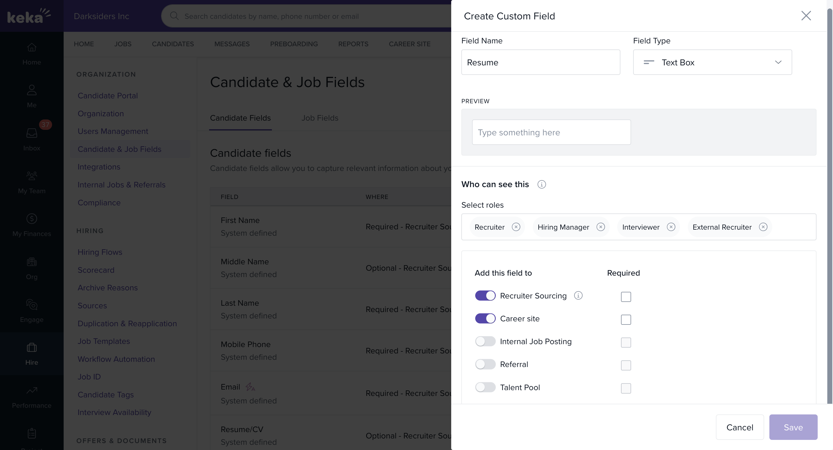 Use visibility controls to ensure only relevant team members see sensitive or role-specific fields, and—importantly—carefully select where each field appears to streamline your hiring workflows and data collection.