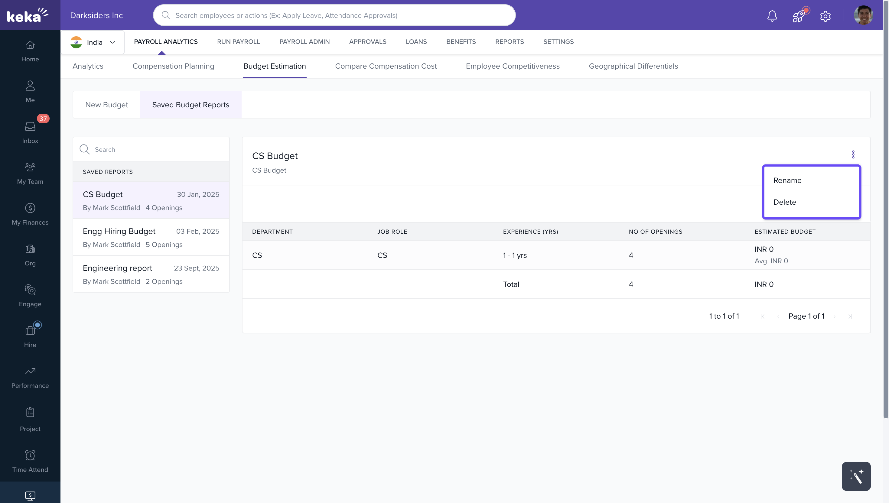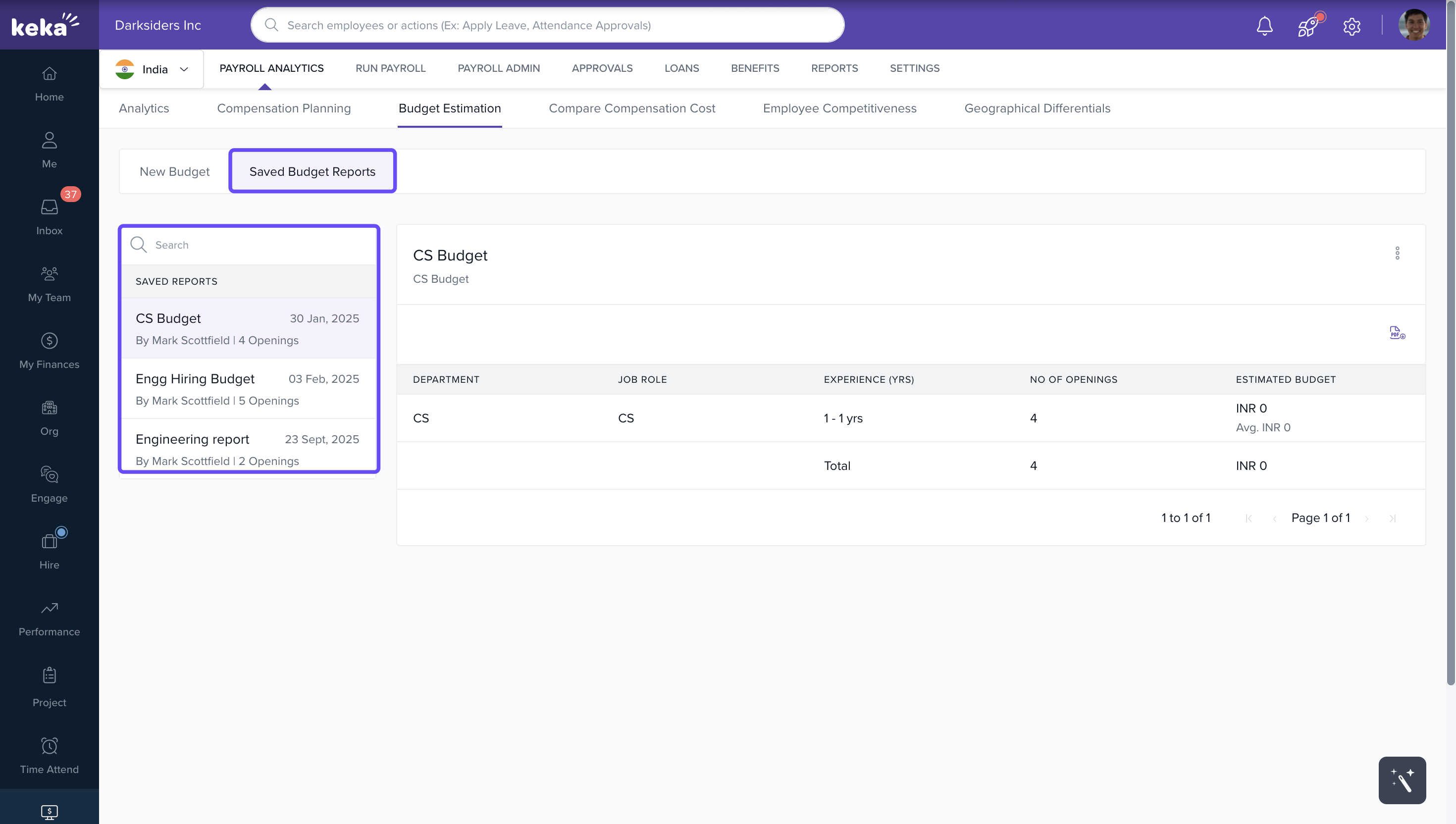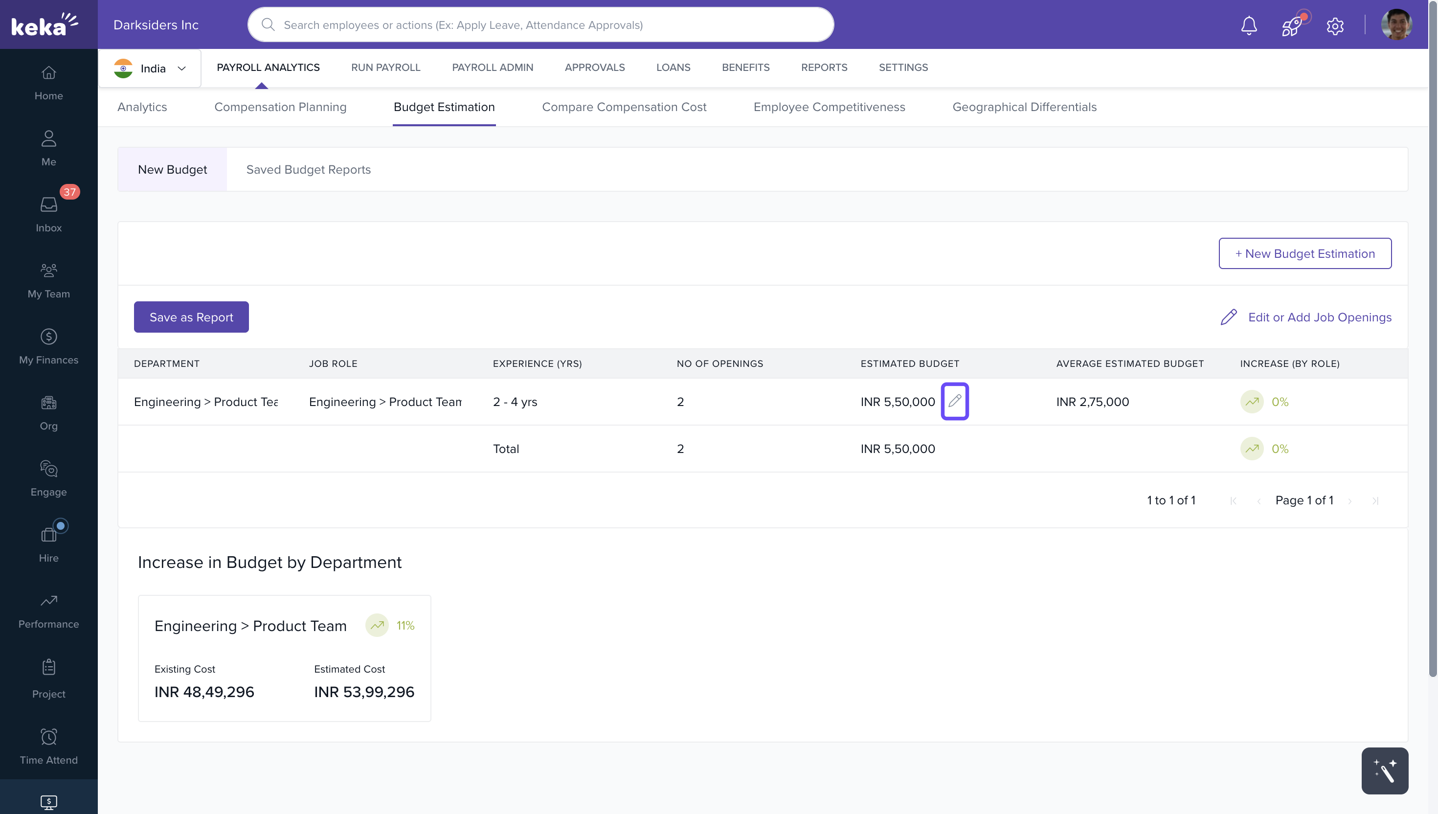 The Budget Estimation tab in Payroll Analytics helps organizations plan and project salary budgets for upcoming hires. With this tool, you can: