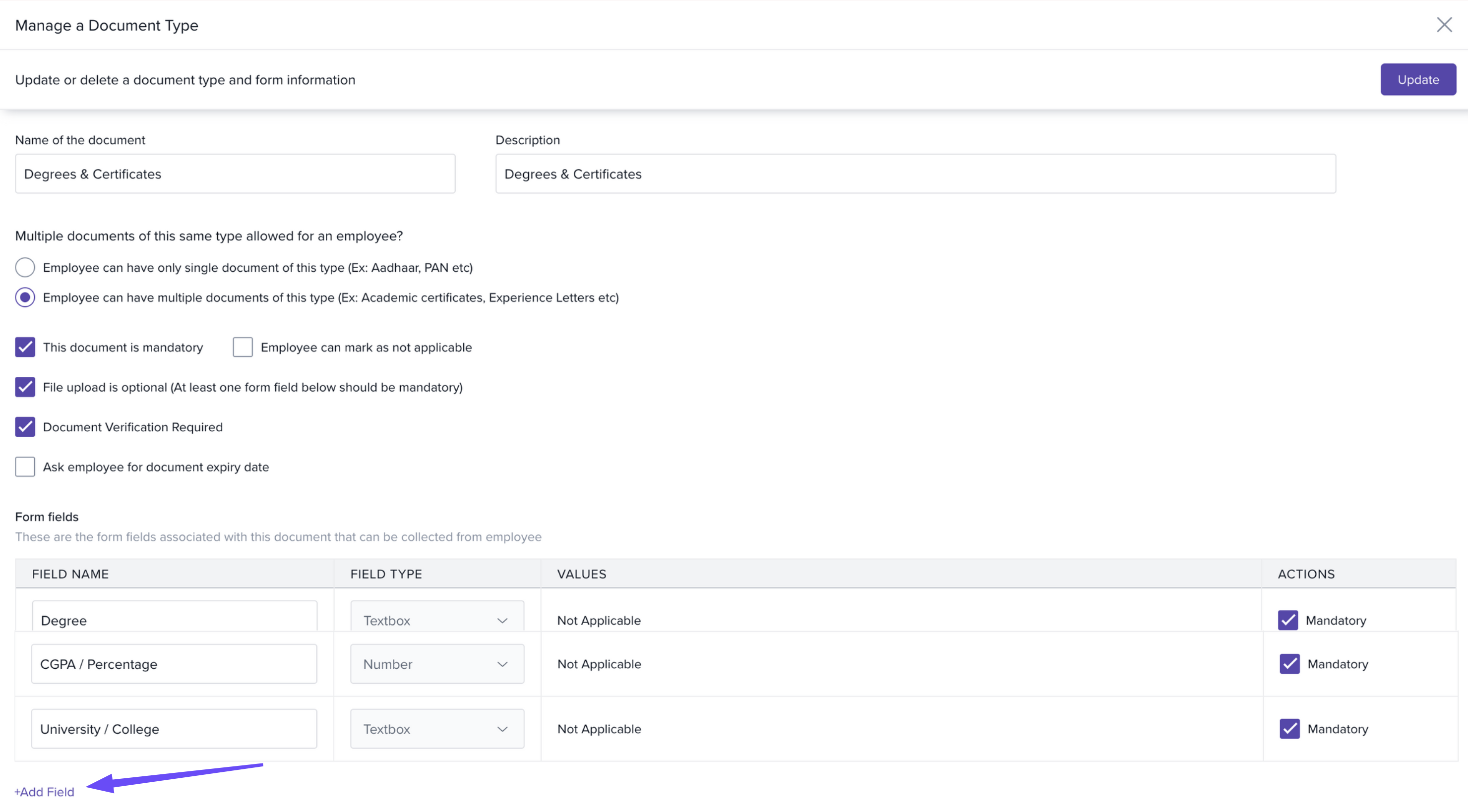 When employees join your organization, they are required to submit various documents such as ID proofs, certificates, and experience letters. These documents are organized into folders, and each document type can have specific fields (Document Fields) that need to be filled in.